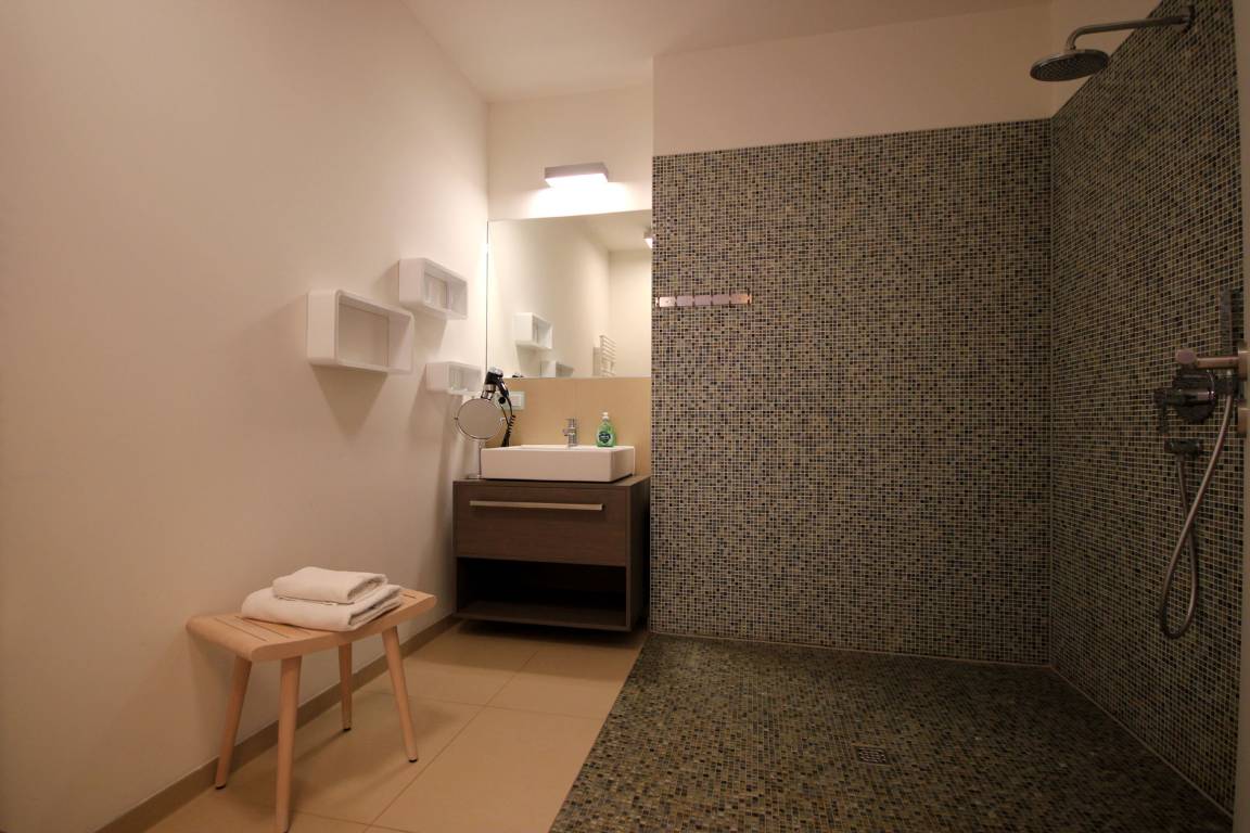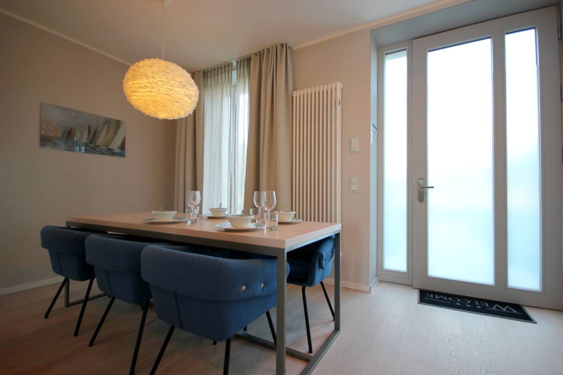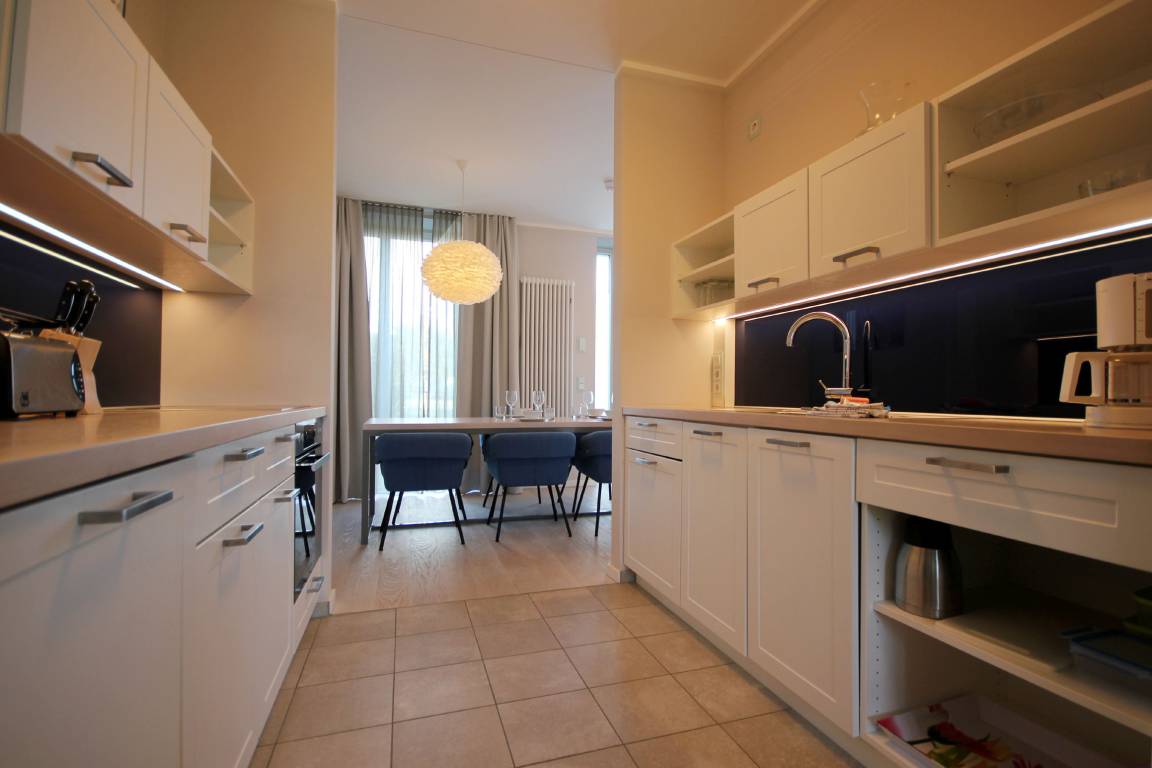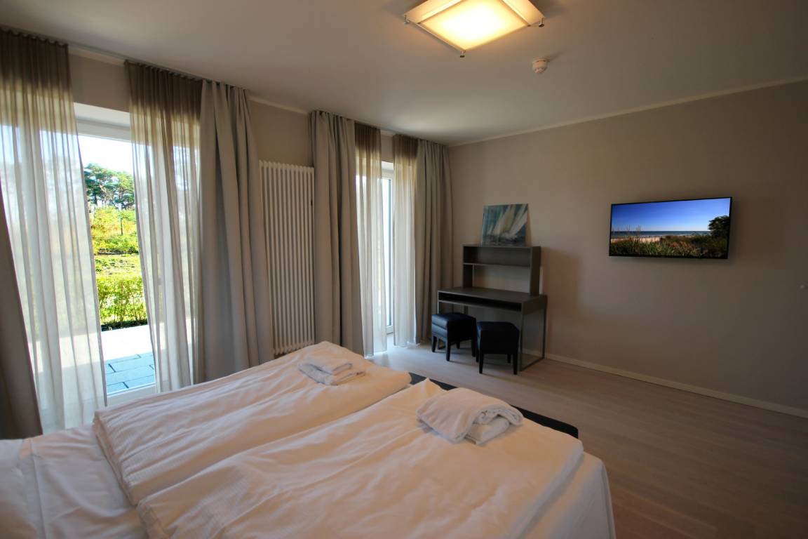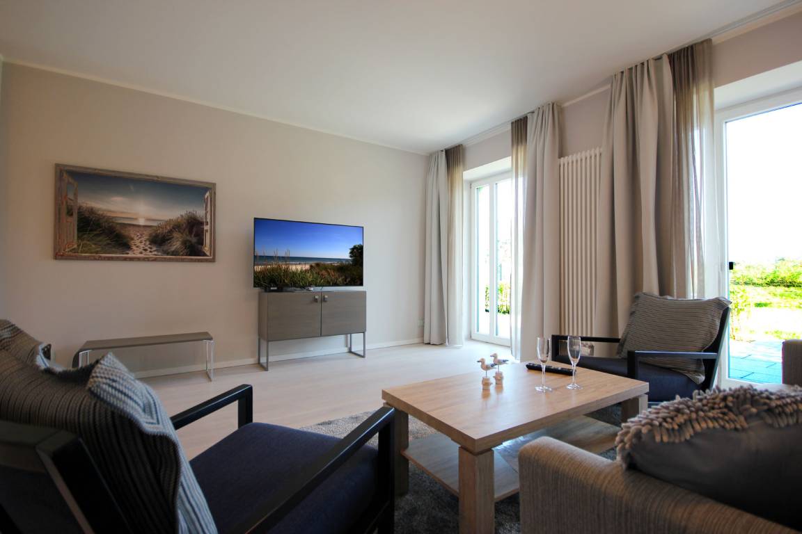 Ihre sonnige 3-Raum-Wohnung 104RB24A mit seitlicher Meerblickterrasse verfügt über 108 qm2 Wohnfläche im Erdgeschoss. Die hochmodern eingerichtete Wohnung ist mit bis zu 5 Personen belegbar. Ihre Nichtraucherwohnung verfügt über einen vorgelagerten Flur mit Garderobe. Angrenzend ist der schöne Essbereich und auch die moderne Wohnküche zu finden. Der stilvoll eingerichtete Wohnbereich ist mit einer Sitzgruppe inkl. Schlafcouch für 2 Personen, großem Flachbild-TV und WLAN ausgestattet. Im Küchenbereich erwartet Sie ein Backofen, Cerankochfeld, Geschirrspüler, Kühlschrank mit Tiefkühlfach, eine Kaffeemaschine, Wasserkocher, Toaster sowie umfangreiches Kücheninventar. Zudem ist eine zusätzliche Kühl- und Gefrierkombination vorhanden. Das Badezimmer mit ebenerdiger Dusche bietet genügend Abstellflächen für Kosmetika, einen Fön, Kosmetikspiegel und einen Handtuchheiztrockner. Das Hauptschlafzimmer verfügt über einen weiteren Flachbild-TV, Schreibtisch, Kleiderschrank und ein neues Boxspringbett. Im kleineren Schlafzimmer befindet sich ein ein Doppelstockbett, bei dem auf der unteren Ebene (1,40m breit) bis zu 2 Personen nächtigen können, ein TV und ein Kleiderschrank.