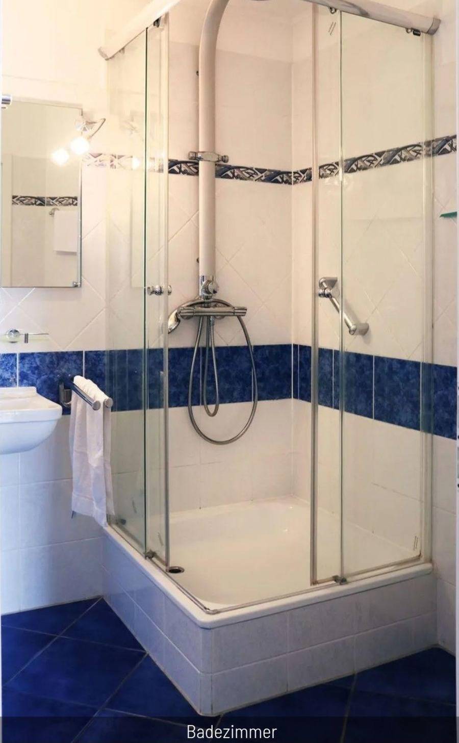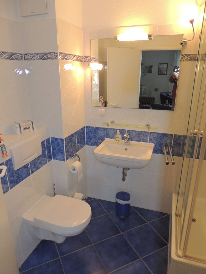 Im Badezimmer befindet sich eine Regendusche, WC und Waschtisch sowie eine Fußbodenheizung.