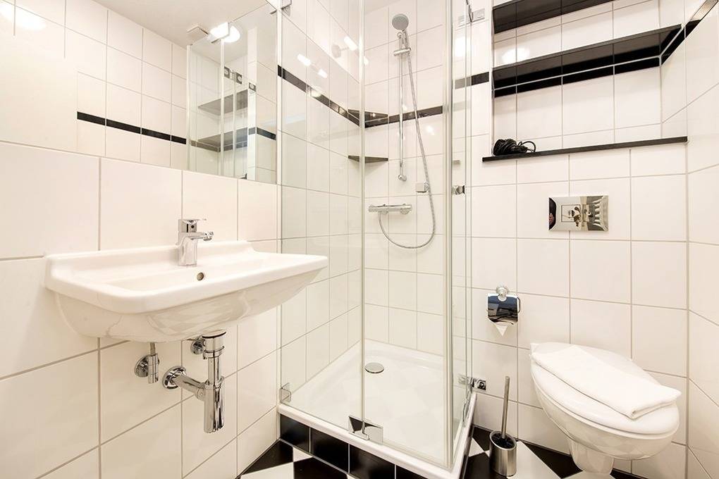 Innenliegendes Badezimmer mit Glasdusche, Waschtisch, Spiegel, WC, Handtuchheizkörper und Föhn
