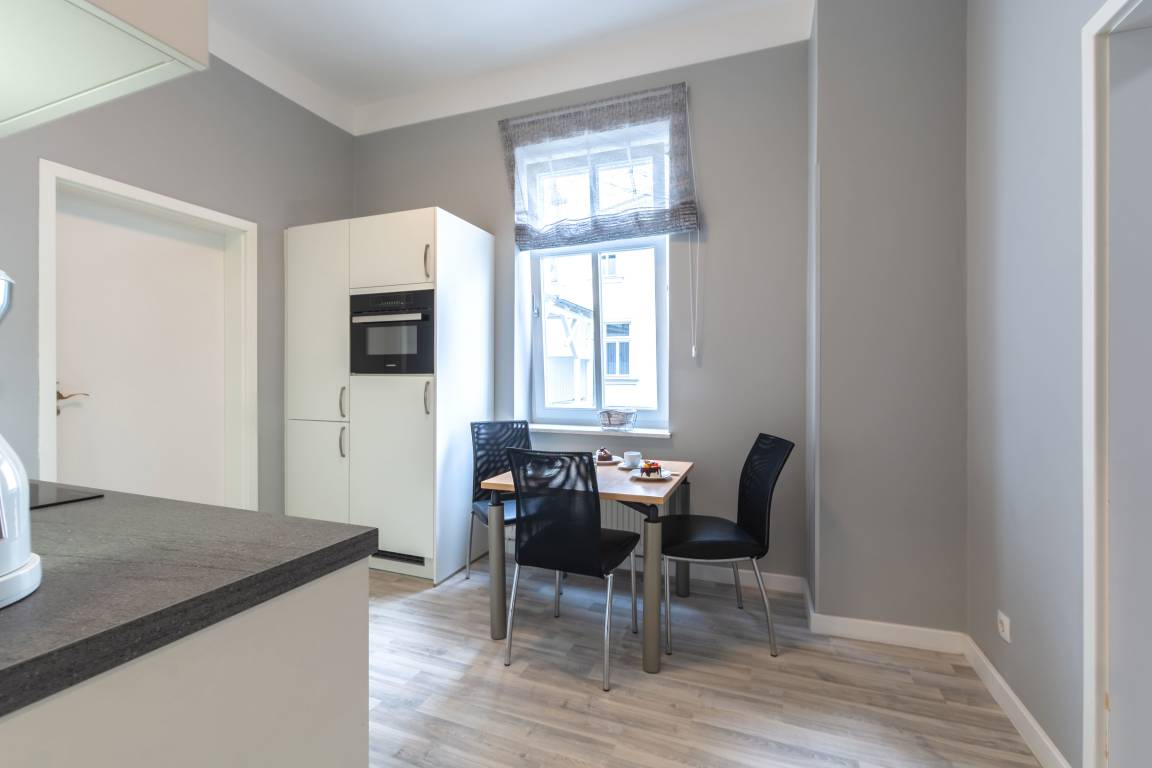 Separate, hochwertige Küche, voll ausgestattet u. a. mit Spülmaschine, Kühlschrank mit Gefrierfach, Glaskochfeld mit Touchcontrol-Bedienung, Backofen mit integrierter Mikrowelle, Kaffeemaschine, Wasserkocher und Toaster. Küchentisch mit 3 Stühlen. Extra Schrank mit Putzutensilien und Staubsauger.