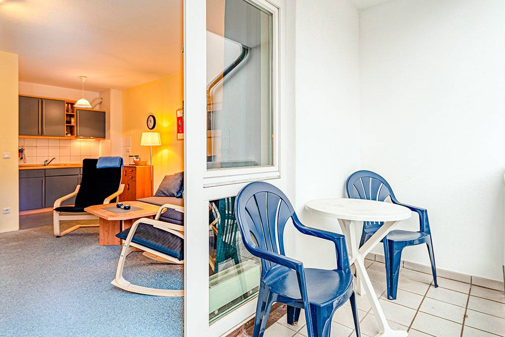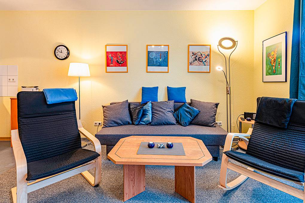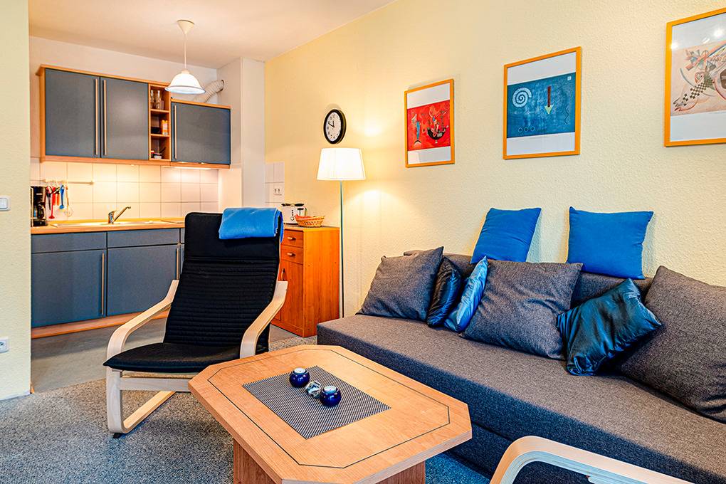 D 90.30 Wohnung 2-4 Pers.: Geschmackvolle 2-Zimmerwohnung mit 42 qm Wohnfläche, 1. Etage. Großer, heller Wohn-/Essraum mit Couchgarnitur (Ausziehcouch 2 Pers.), Kabel-TV, Radio, Esstisch, moderner Küchenzeile. Doppelzimmer. Bad/WC. Balkon mit Sitzmöbeln.