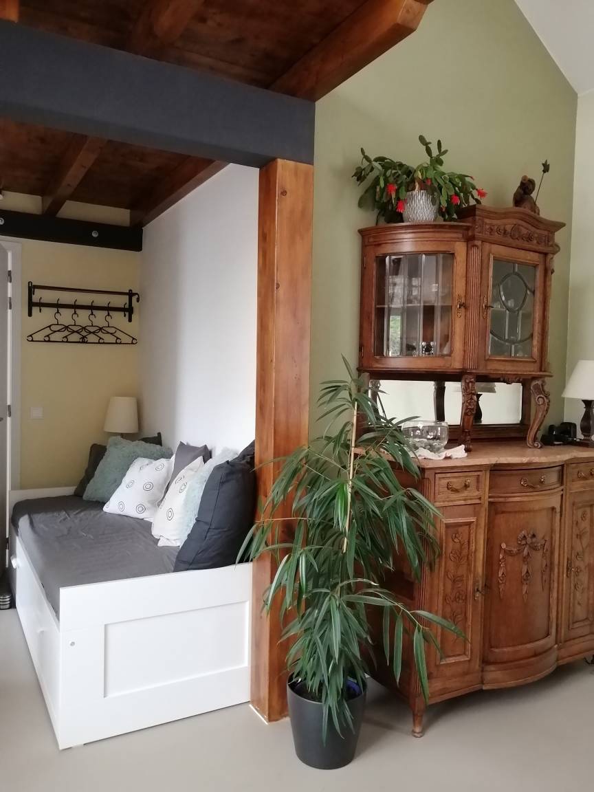 Das Haus verfügt über ein großes Schlafzimmer mit einem Boxspringbett von 180x200, ein Zwischengeschoss mit einem Boxspringbett von 150x200 und ein Schlafsofa im Wohnzimmer von 90x200.