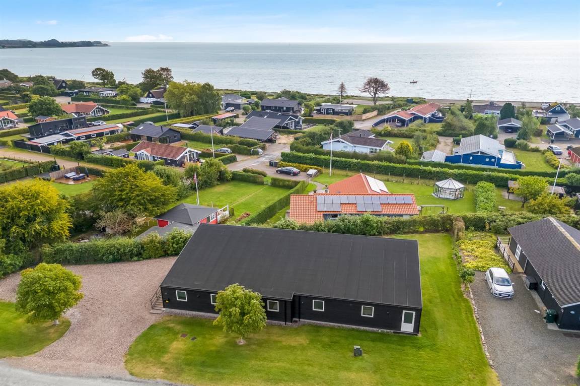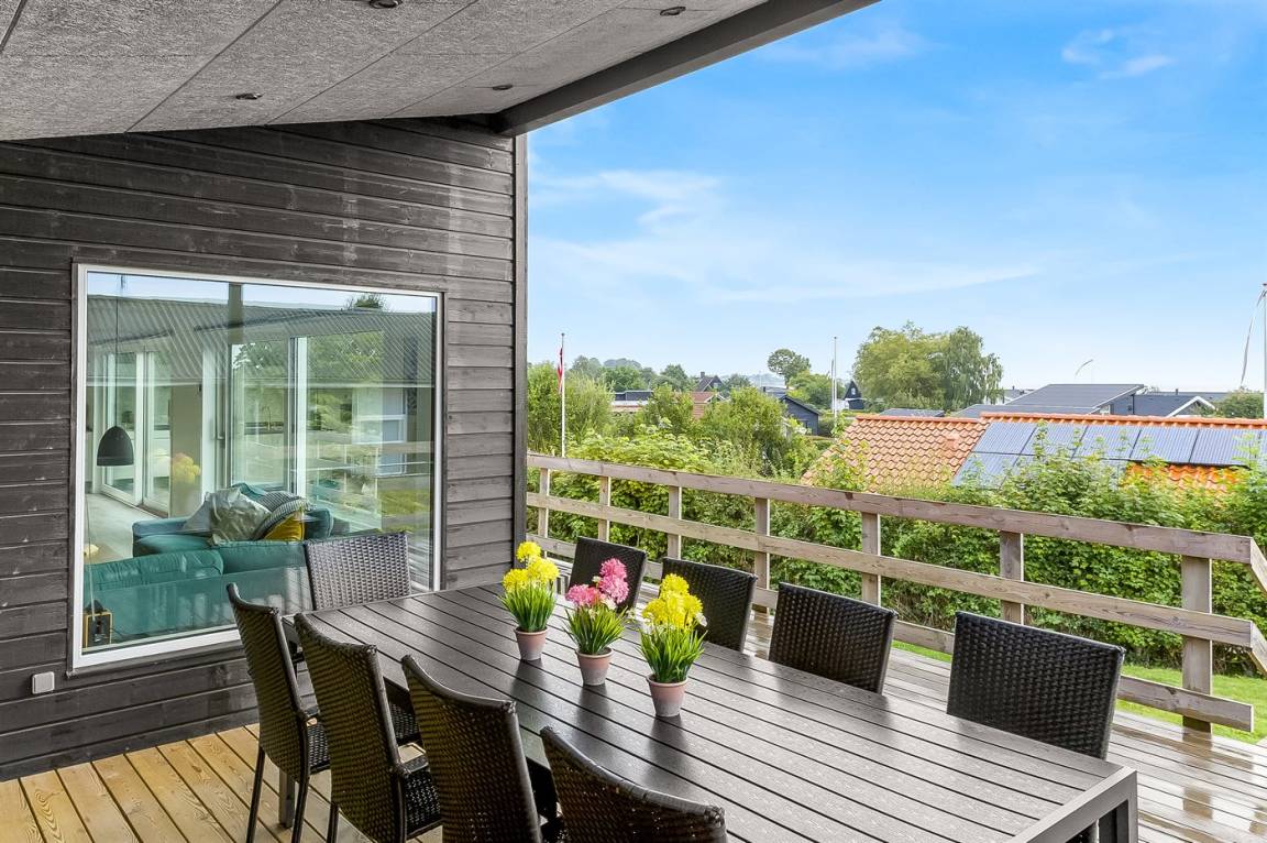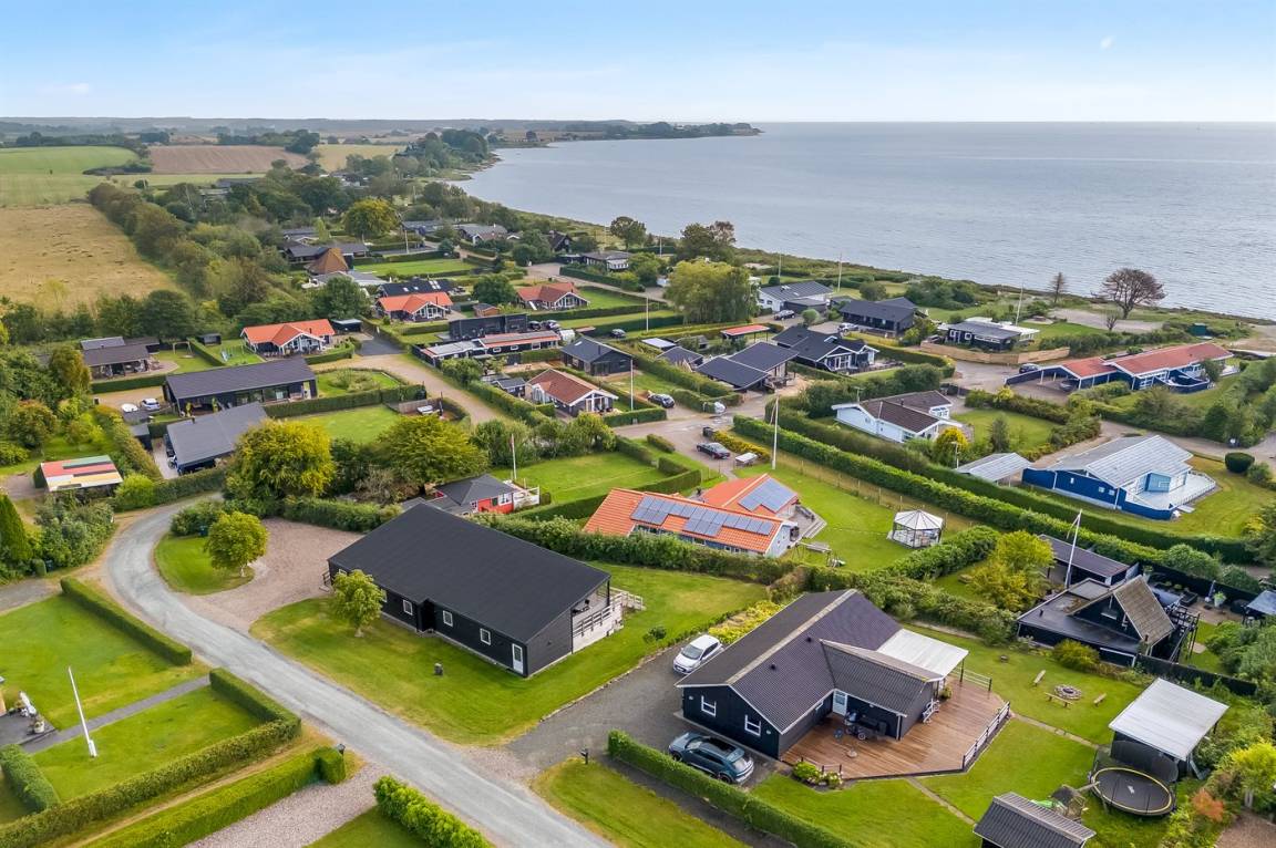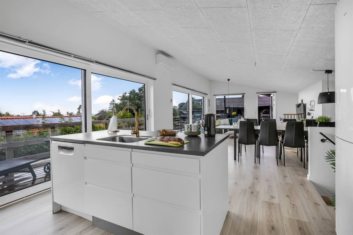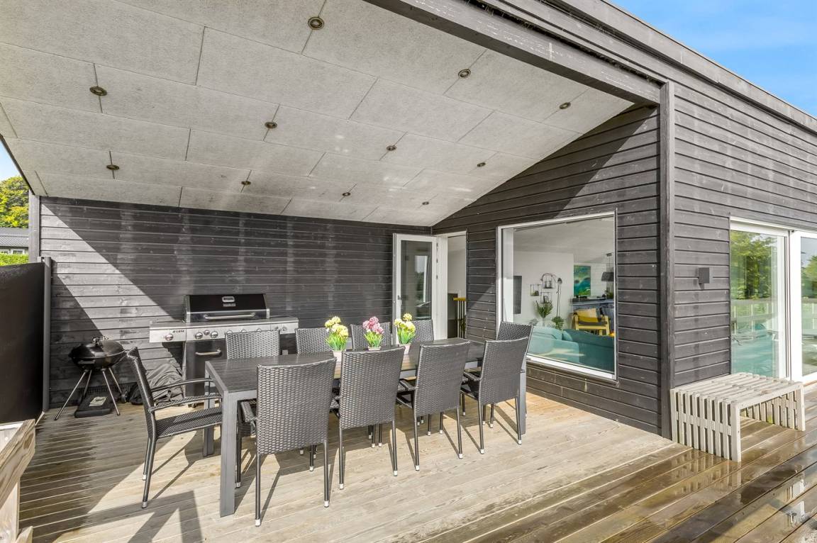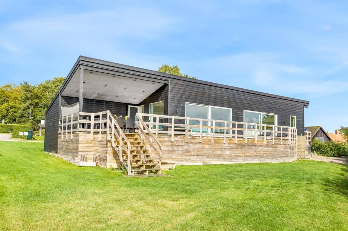 Im attraktiven Ferienhausgebiet bei Binderup Strand findest du dieses moderne Ferienhaus, das im Sommer 2022 erbaut wurde. Architektur und Lage schenken dir hier einen einzigartigen Ausblick auf den Kleinen Belt. Vom großen Wohn-/Essbereich aus kannst du das Leben auf dem Wasser beobachten, während das Abendessen zubereitet wird, und wenn du auf die Terrasse trittst, setzt sich die fantastische Aussicht fort. Die erhöhte Terrasse schafft einen besonderen Rahmen für das Leben im Freien, und hier findest du sowohl einen großen überdachten Bereich, in dem du bei jedem Wetter verweilen kannst, als auch einen Gasgrill, der zu gemütlichen Grillabenden mit Meerblick einlädt.