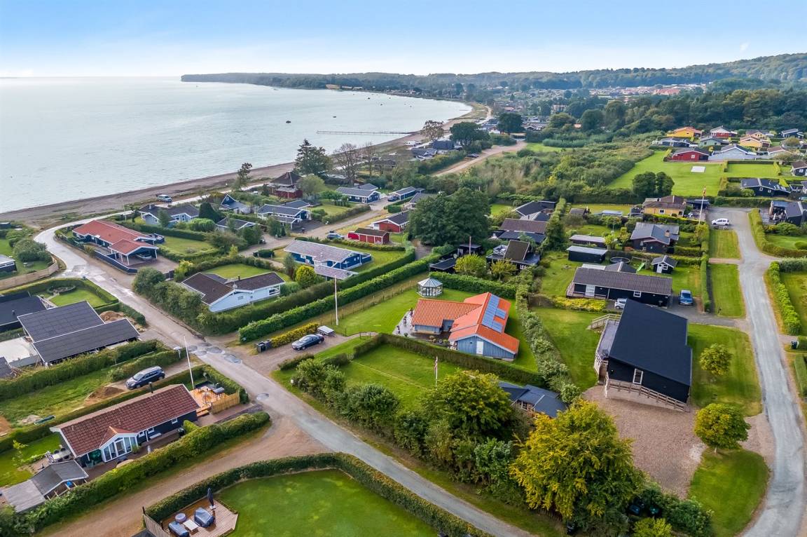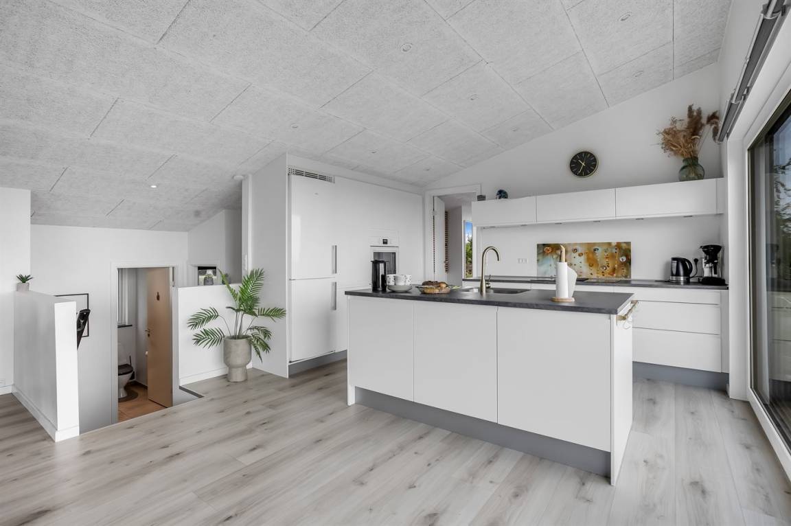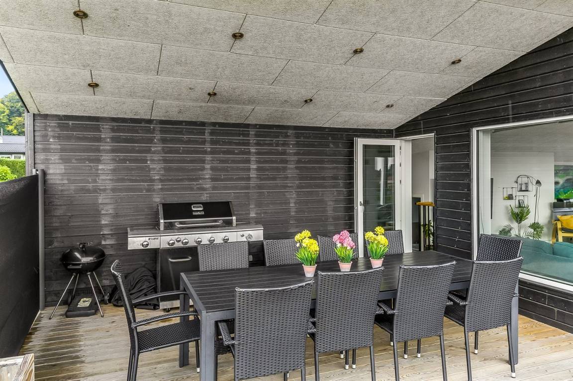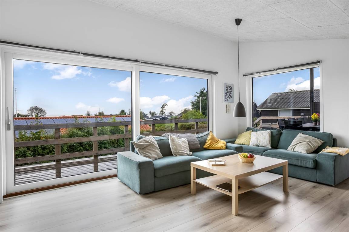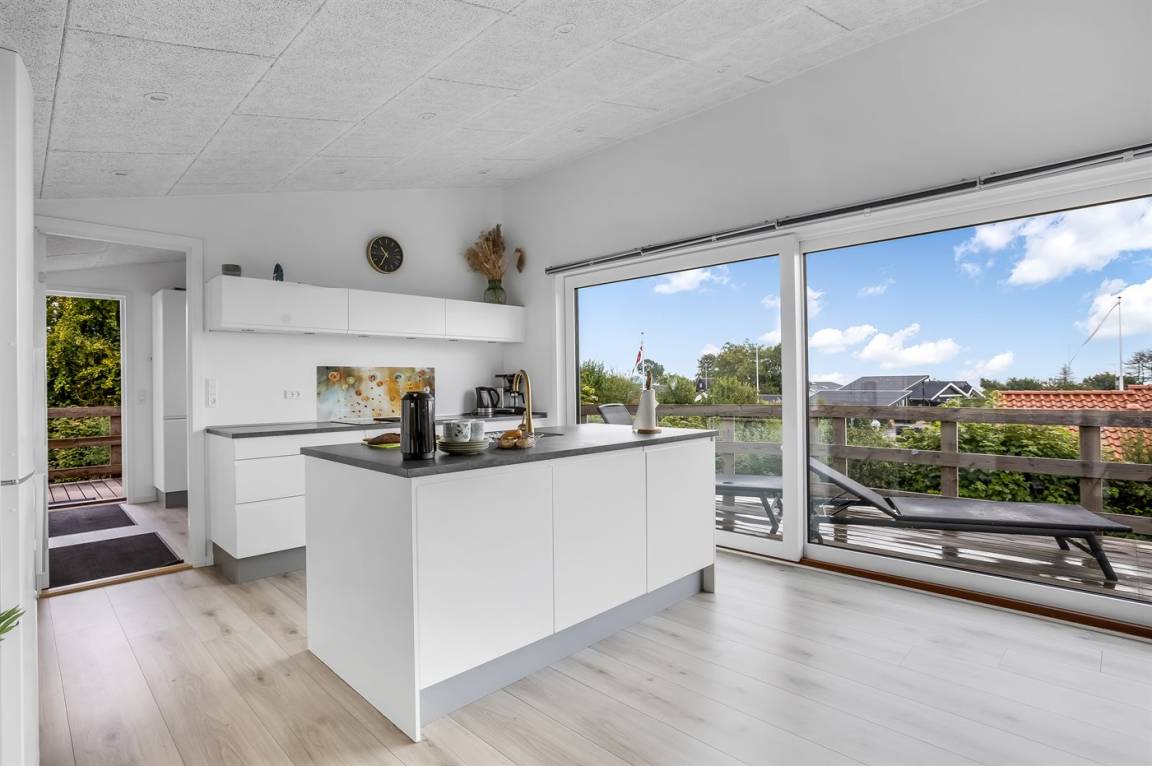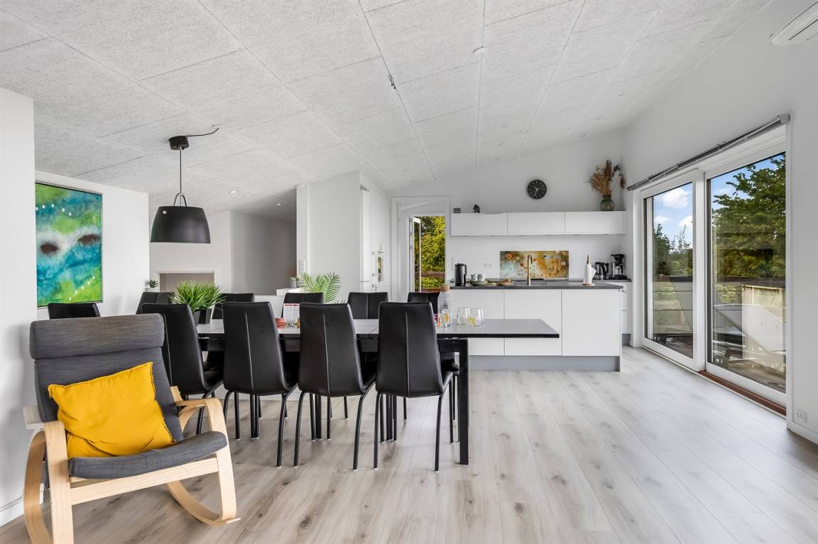 Im attraktiven Ferienhausgebiet bei Binderup Strand findest du dieses moderne Ferienhaus, das im Sommer 2022 erbaut wurde. Architektur und Lage schenken dir hier einen einzigartigen Ausblick auf den Kleinen Belt. Vom großen Wohn-/Essbereich aus kannst du das Leben auf dem Wasser beobachten, während das Abendessen zubereitet wird, und wenn du auf die Terrasse trittst, setzt sich die fantastische Aussicht fort. Die erhöhte Terrasse schafft einen besonderen Rahmen für das Leben im Freien, und hier findest du sowohl einen großen überdachten Bereich, in dem du bei jedem Wetter verweilen kannst, als auch einen Gasgrill, der zu gemütlichen Grillabenden mit Meerblick einlädt.