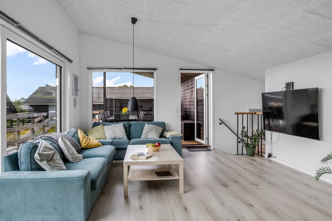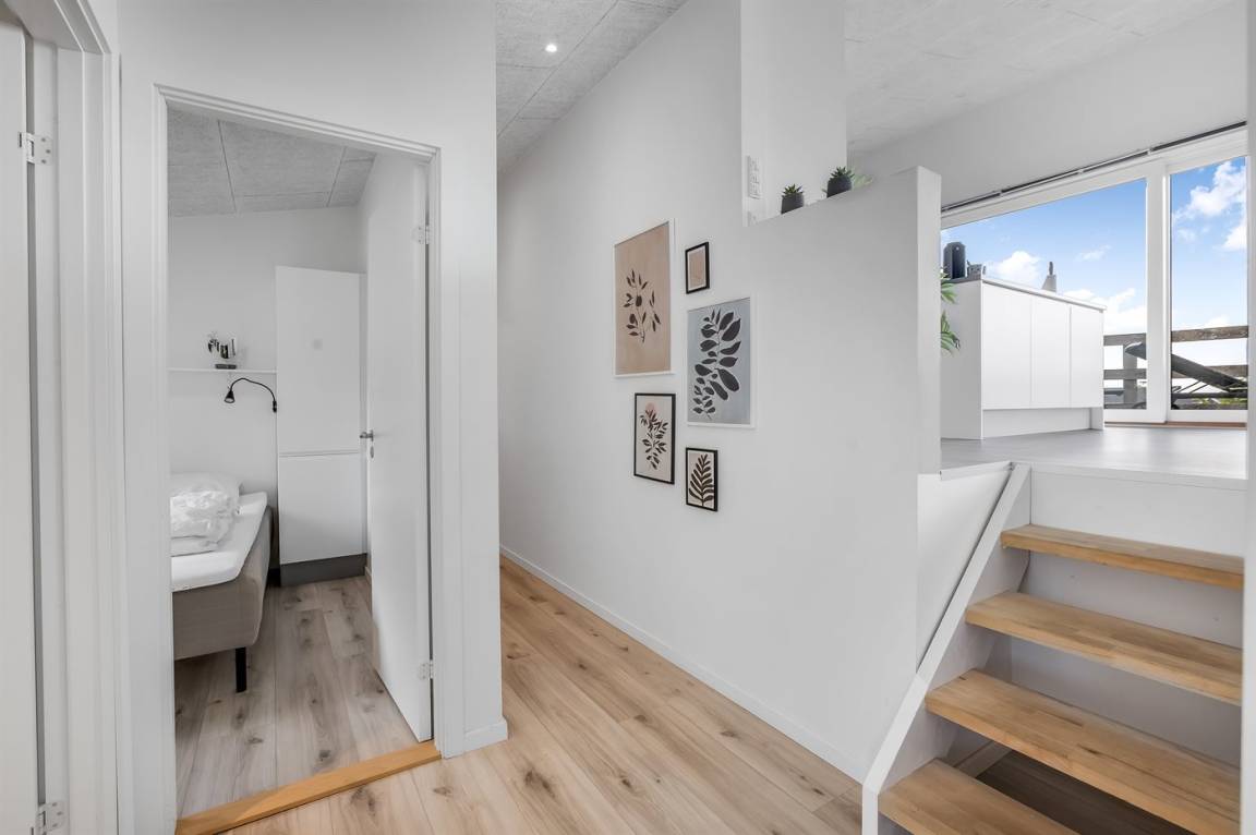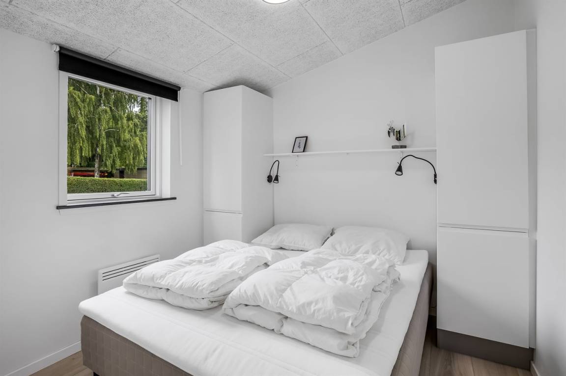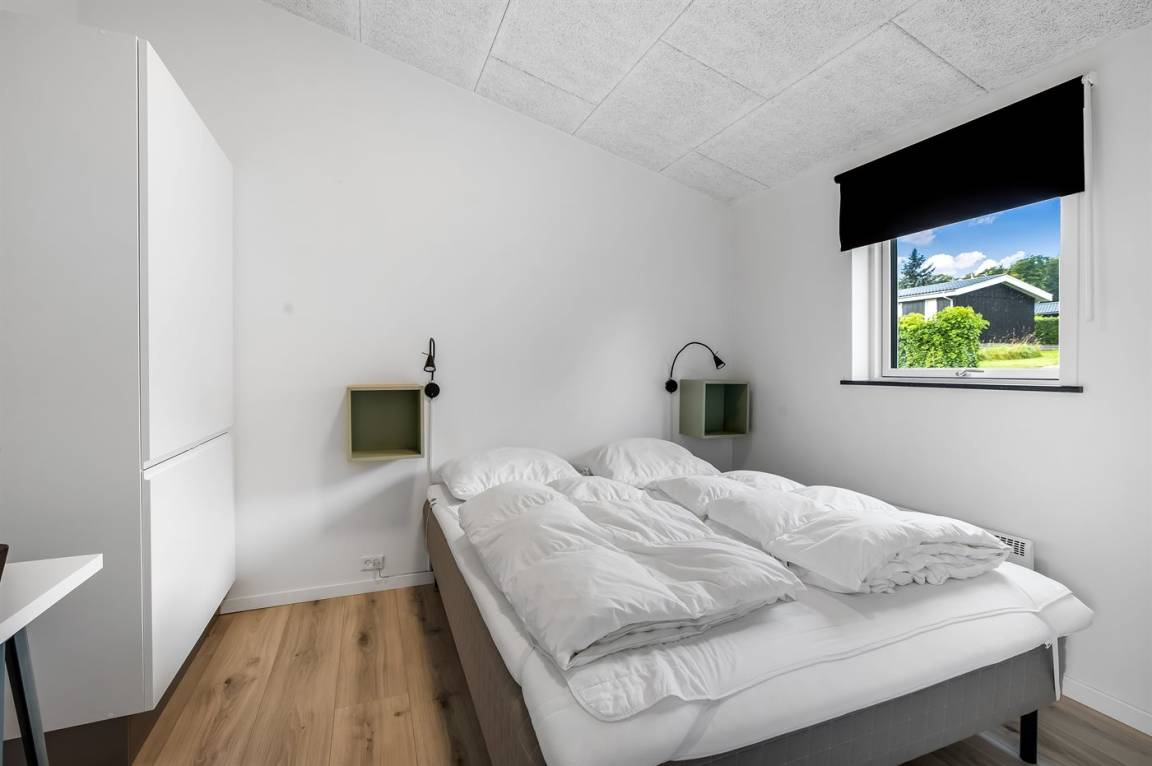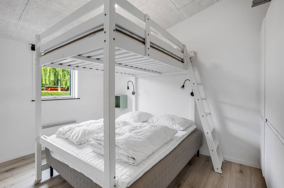 Das Ferienhaus verfügt über vier Schlafzimmer, die alle in einem leicht versetzten Bereich zum Wohnraum liegen, was eine praktische Aufteilung von Wohn- und Schlafbereichen ermöglicht. Eines der Zimmer bietet Platz für vier Personen, und als besonderes Detail gibt es ein gemütliches offenes Obergeschoss, der vom versetzten Geschoss aus zugänglich ist. Hier können die Kinder ihre eigene kleine Höhle haben, oder du kannst das offene Obergeschoss als zusätzliche Schlafgelegenheit nutzen. Nach einem Tag am kinderfreundlichen Strand von Binderup, der nur wenige Schritte entfernt liegt, kannst du dich im hauseigenen Whirlpool für zwei Personen oder in der Sauna verwöhnen – hier steht die Entspannung im Mittelpunkt.