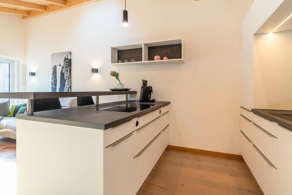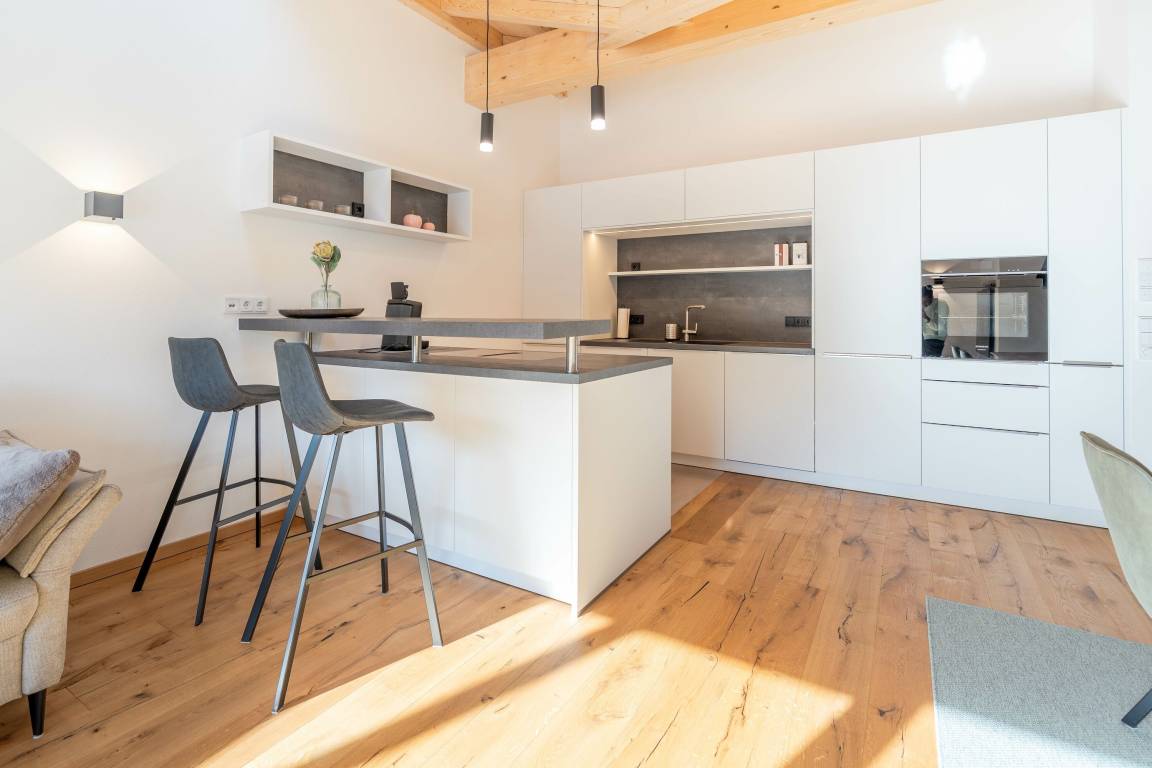 Außerdem finden Sie in der Wohnküche einen Essbereich und natürlich die hochmodern ausgestattete Küche (alle Elektrogeräte von Siemens) mit Theke und Barhockern. Hier können Sie Ihrer kulinarischen Kreativität freien Lauf lassen und gemeinsam feine Speisen zaubern.