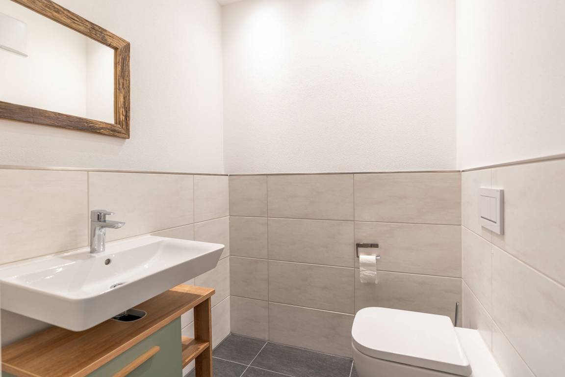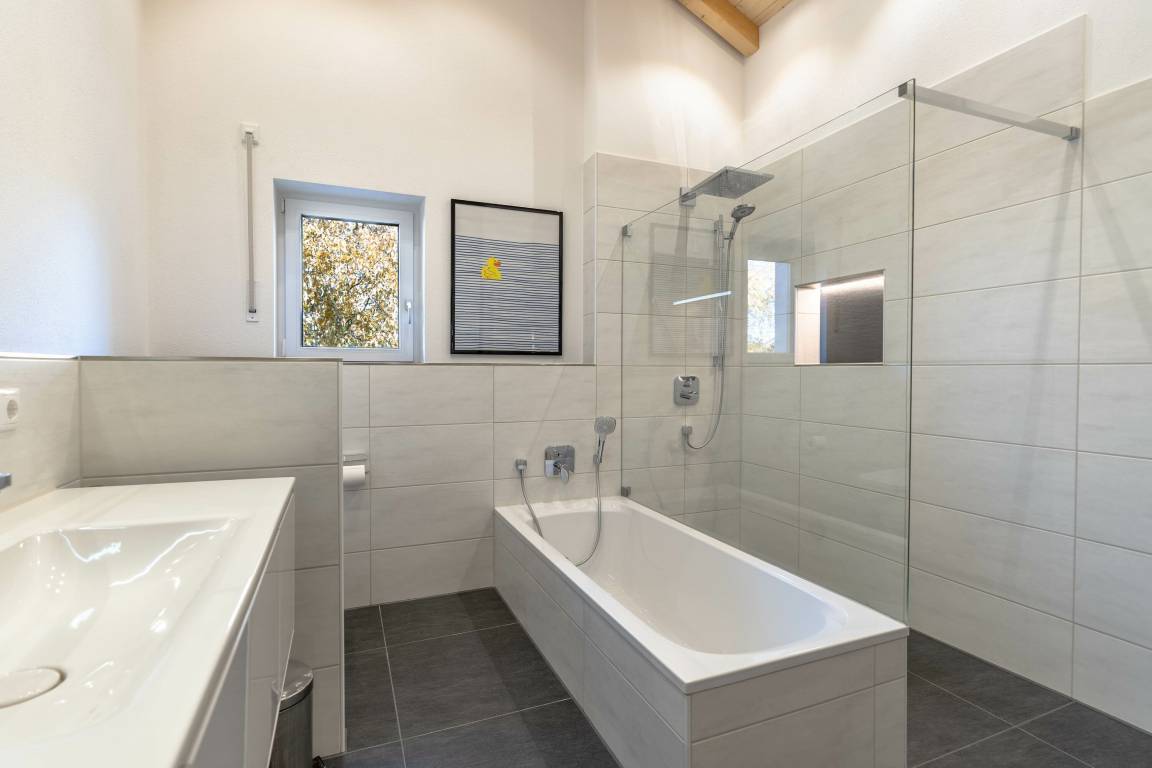 Das Badezimmer verfügt über einen großen Waschtisch, eine Badewanne, eine große Dusche und ein WC. Ihre Handtücher hängen angewärmt an der Handtuchheizung. Zusätzlich finden Sie ein separates Gäste-WC in der Wohnung.