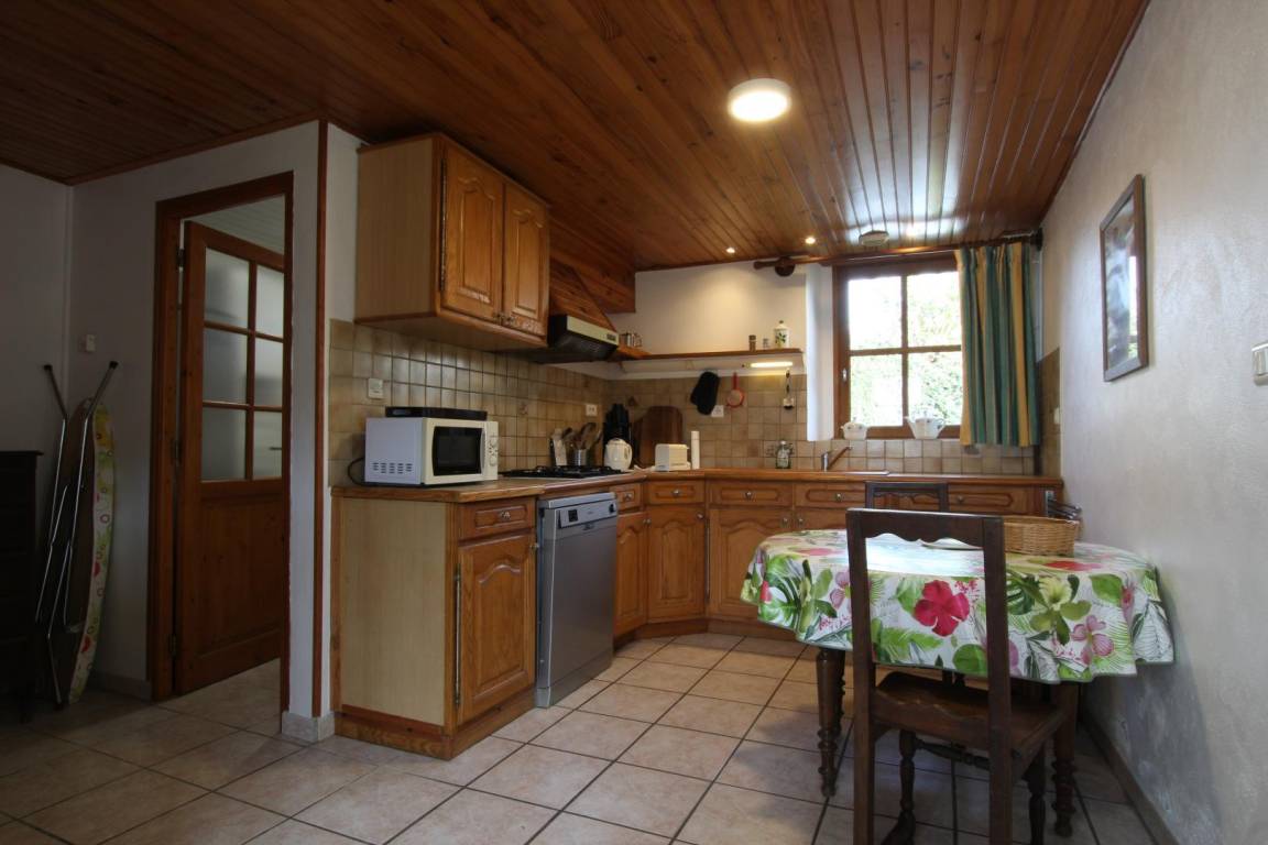 Freistehendes Haus. Erdgeschoss: Wohnzimmer mit Sitzecke. Küche (Backofen, Mikrowelle, Geschirrspüler). Duschbad mit WC (Waschmaschine). Schlafzimmer 1 (1 Doppelbett 140x200 cm). Obergeschoss: Schlafzimmer 2 (1 Doppelbett 140x200 cm). Schlafzimmer 3 (3 Einzelbetten 90x190 cm). Ein Kinderbett ist auf Anfrage erhältlich. Badezimmer mit WC. Kamin. Bettwäsche und Handtücher können gemietet werden. Reinigungsservice auf Anfrage. Brennholz wird bereitgestellt. Internetzugang (Glasfaser). Fernseher. Elektrische Heizung (gegen Gebühr). Privater, umzäunter Garten. Zwei Gartenmöbelgarnituren. Grill. Fahrradabstellraum. Überdachte Terrasse.
