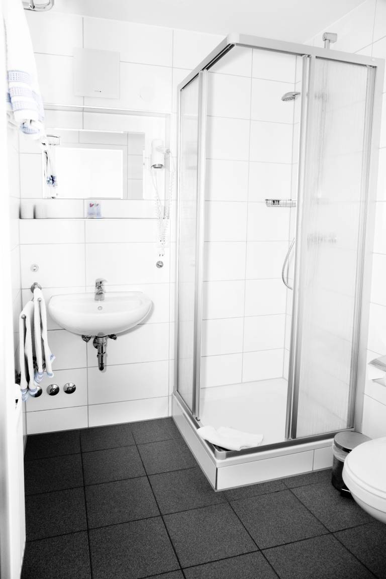 Das Badezimmer ist ausgestattet mit einer Dusche und einem Haartrockner.