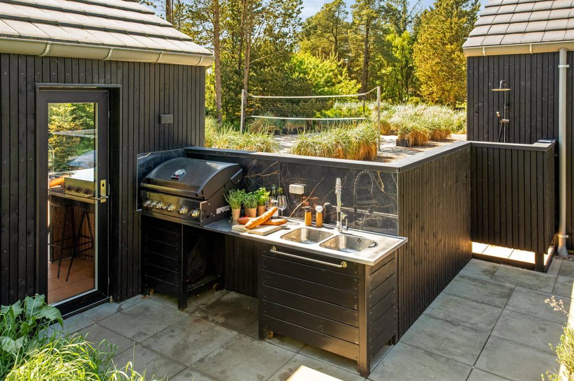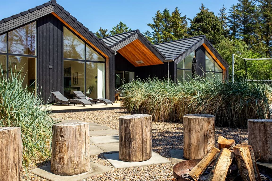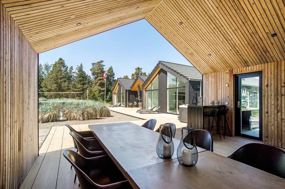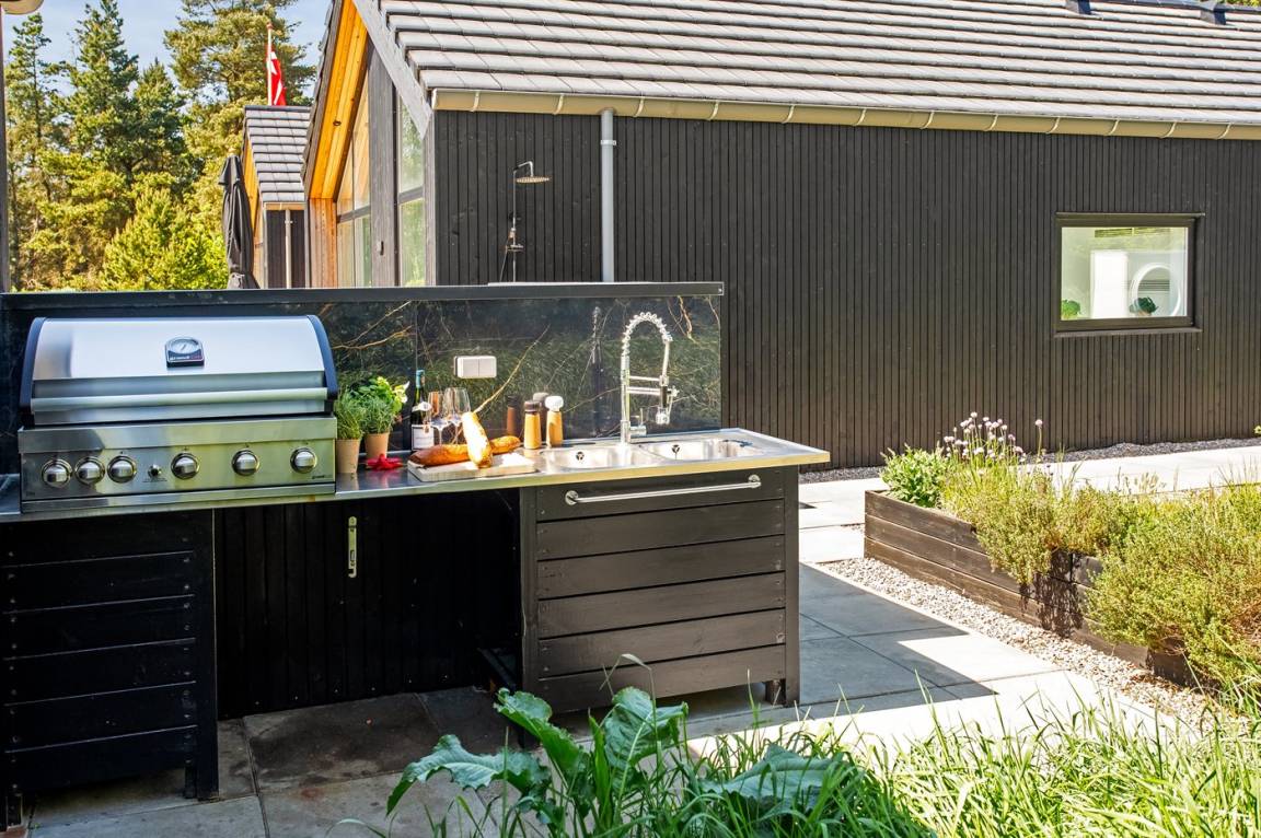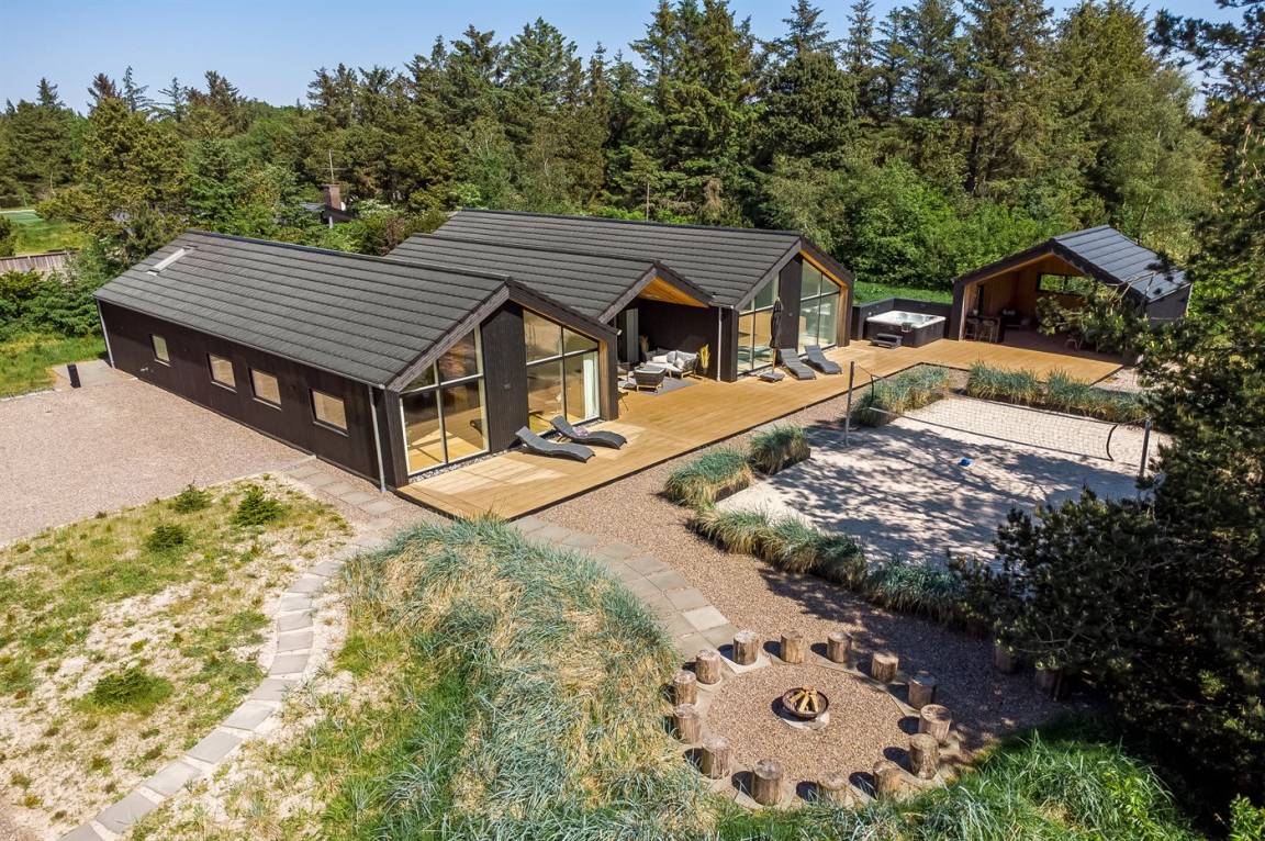 DraußenDie Ferienunterkunft liegt auf einem 2900 m² großen Naturgrundstück. Die Entfernung zum Meer beträgt 1400 m. Die nächste Einkaufsmöglichkeit liegt 1400 m entfernt. Es steht ein 200 m² Terrassenareal zur Verfügung. Außerdem gibt es 54 m² überdachte Terrasse. Schaukel. Sandkasten. Trampolin. Spielturm. Rutsche.Beachvolley. Petanque. Lagerfeuerstelle. Außendusche. An Sommerabenden sorgt der Außenkamin für eine gemütliche Atmosphäre. Außerdem stehen 4 Terrassenheizer (2000 W) zur Verfügung. Es beteht die Möglichkeit das Essen in der Außenküche zuzubereiten (Im Zeitraum von November bis einschl. Februar ist das Wasser abgestellt). Es stehen 2 Grills zur Verfügung. Es ist ein Ladestecker für Elektroautos installiert. Parkplatz auf dem Grundstück.
