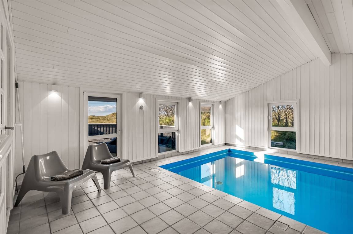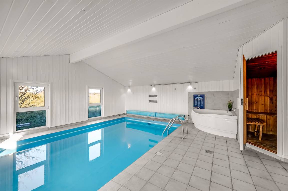 Ferienhaus mit Poolbereich, der mit einem Swimmingpool (20 m²) mit Gegenstromanlage, einem 2-Personen-Whirlpool und einer Sauna ausgestattet ist.