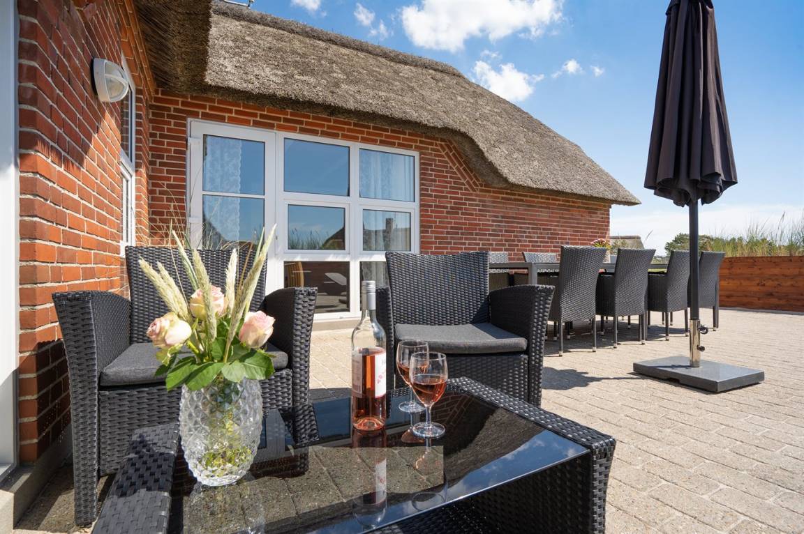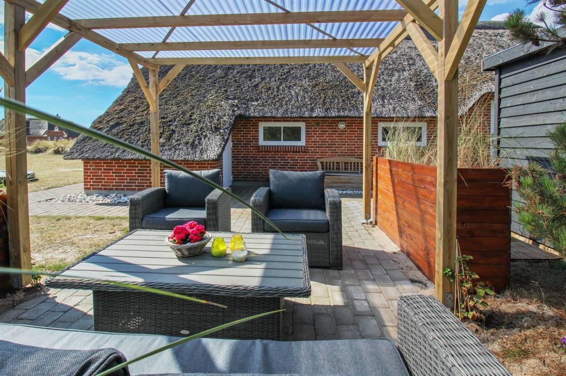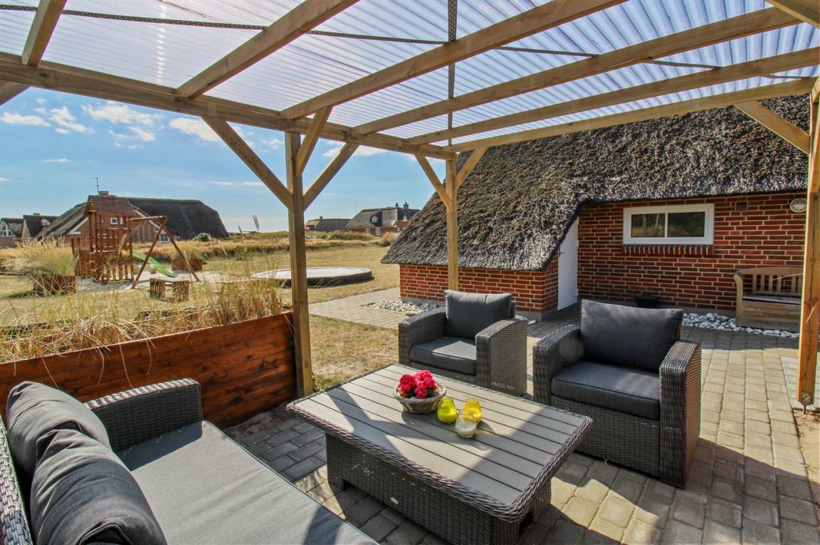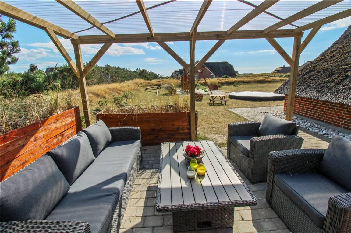 DraußenDie Ferienunterkunft liegt auf einem 1524 m² großen Dünengrundstück. Die Entfernung zum Meer beträgt 100 m. Die nächste Einkaufsmöglichkeit liegt 900 m entfernt. Es steht ein 50 m² Terrassenareal zur Verfügung. Außerdem gibt es 12 m² überdachte Terrasse. Schaukel. Sandkasten. Trampolin. Spielturm. Rutsche. Es gibt eine Außendusche, wo das Wasser von der Sonne erwärmt wird. Es steht ein Grill zur Verfügung. Es ist ein Ladestecker für Elektroautos installiert. Parkplatz auf dem Grundstück.