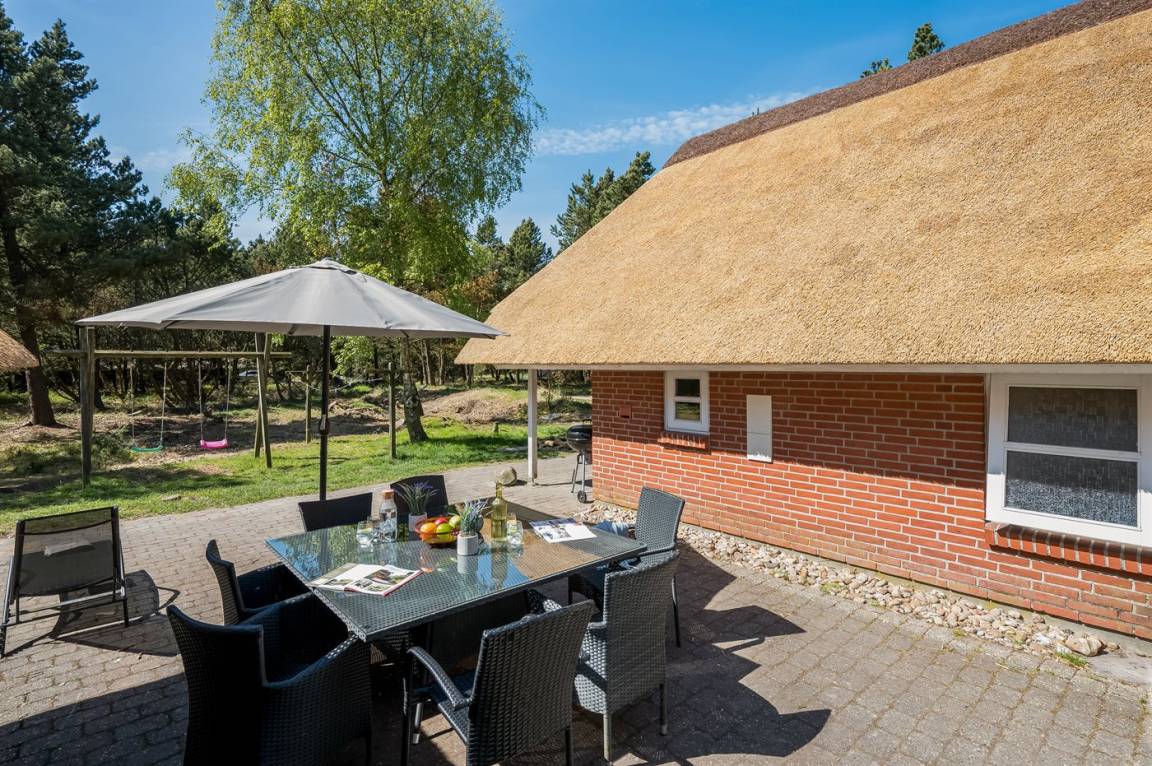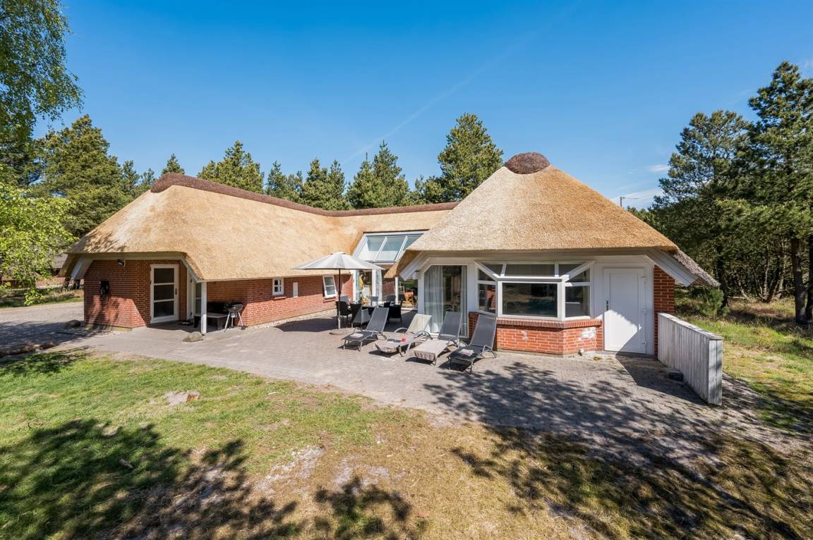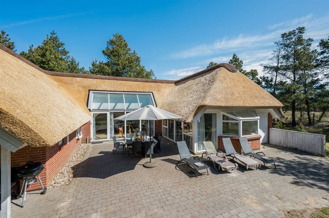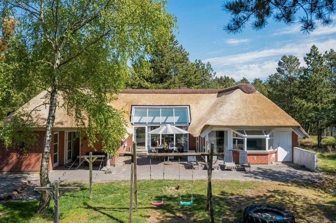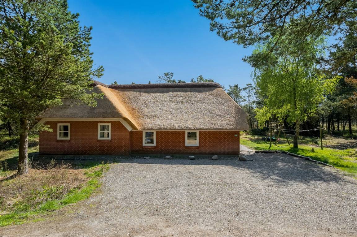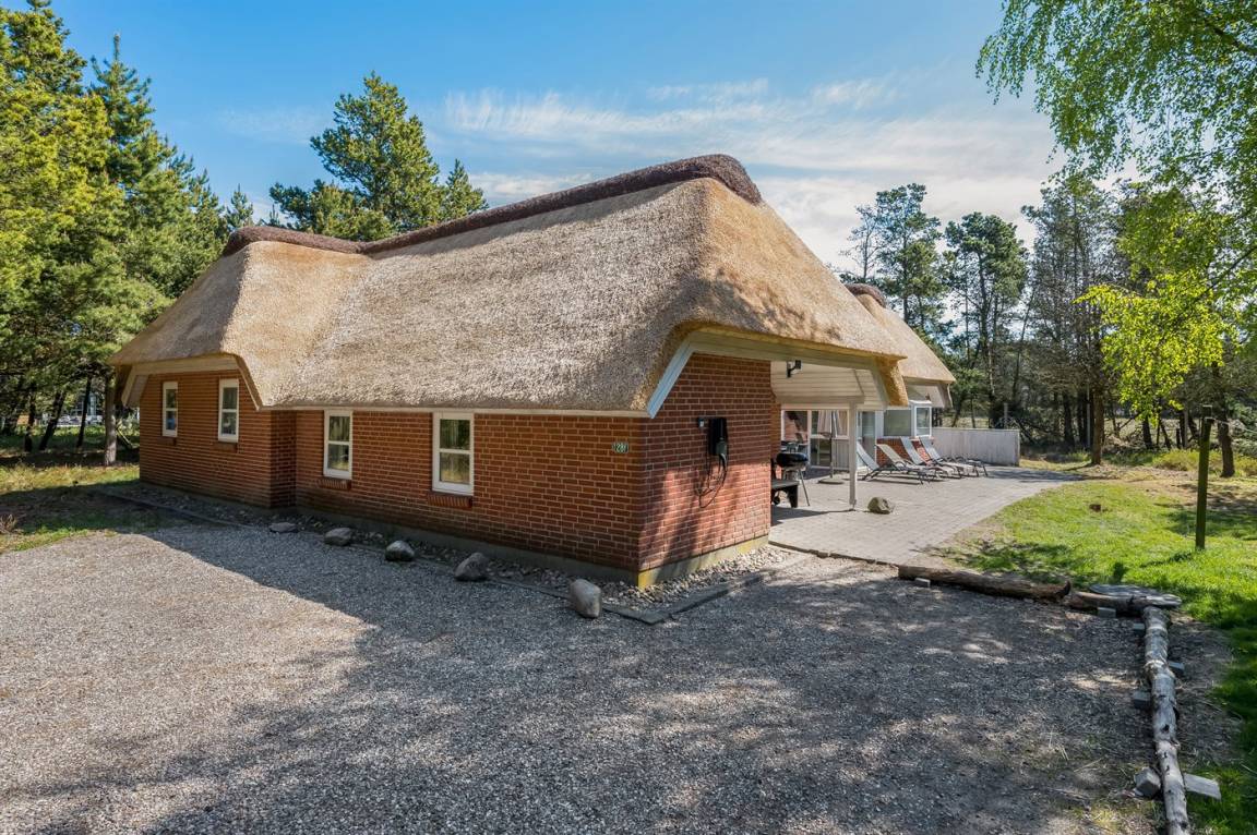 Dieses schöne Ferienhaus mit Reetdach ist auf einem großen, geschlossenen Naturgrundstück, nur 700 m von einem der besten Badestrände Dänemarks entfernt gelegen. Zum Haus gehört ein ungestörtes, offenes Terrassenareal. Innen befinden sich 2 Schlafplätze im offenen Obergeschoss.