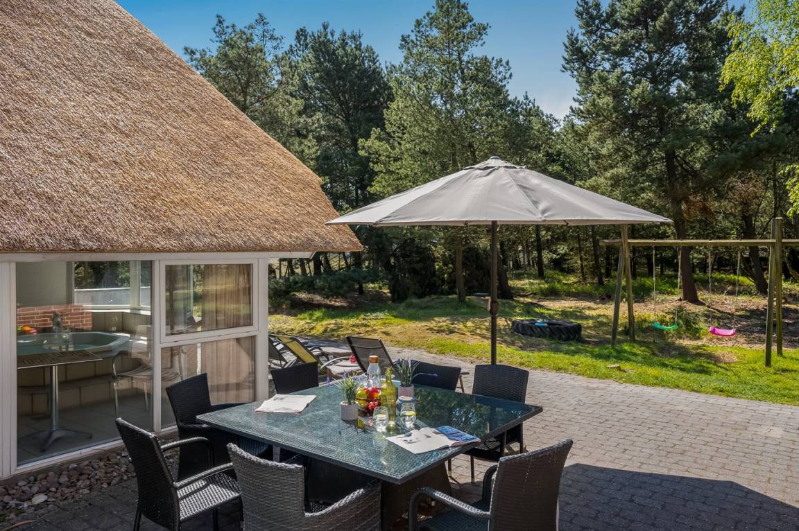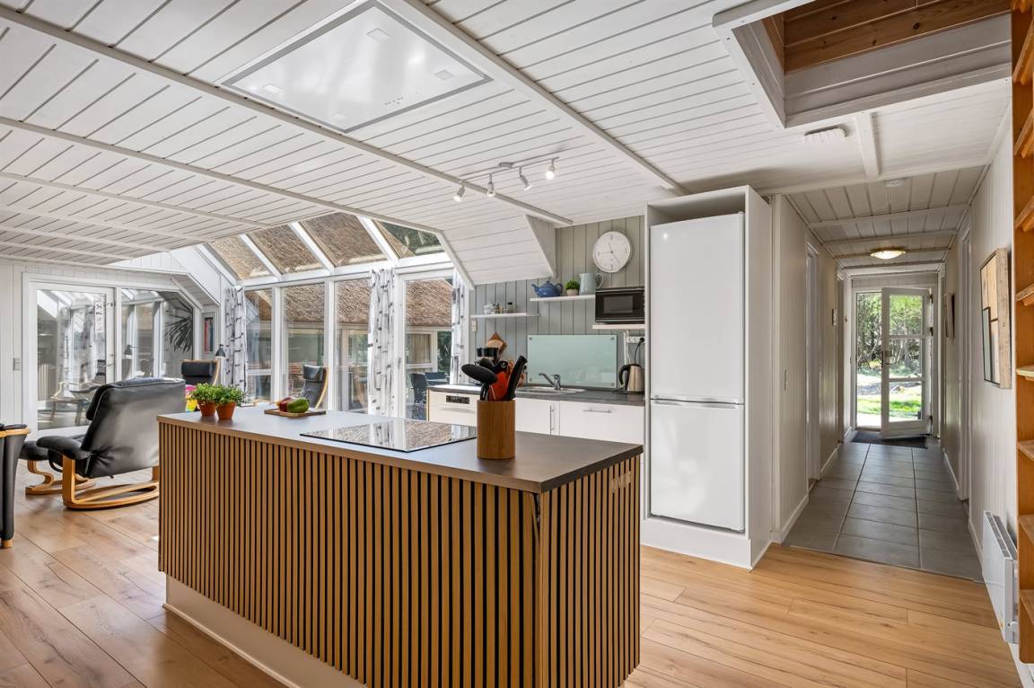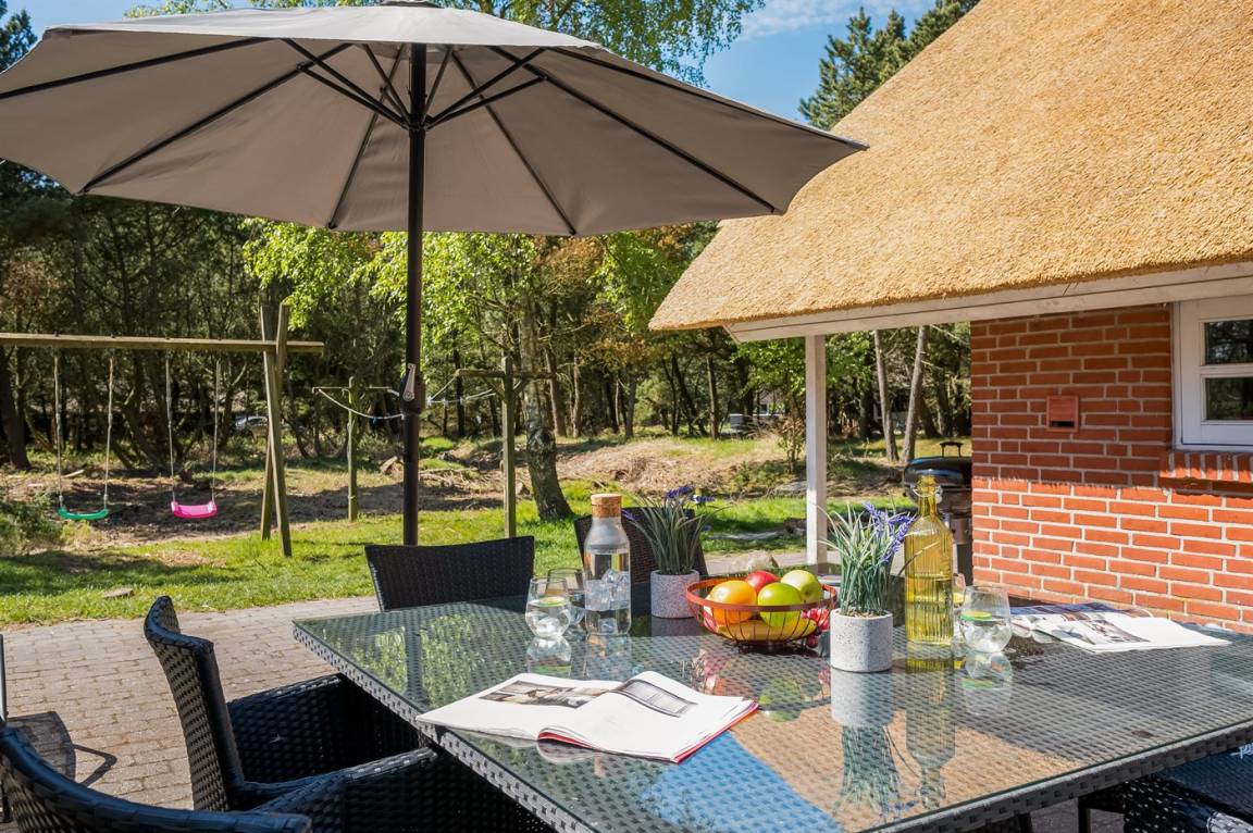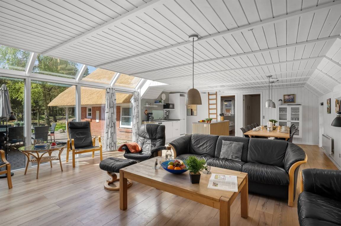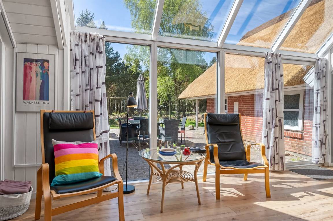 Dieses schöne Ferienhaus mit Reetdach ist auf einem großen, geschlossenen Naturgrundstück, nur 700 m von einem der besten Badestrände Dänemarks entfernt gelegen. Zum Haus gehört ein ungestörtes, offenes Terrassenareal. Innen befinden sich 2 Schlafplätze im offenen Obergeschoss.