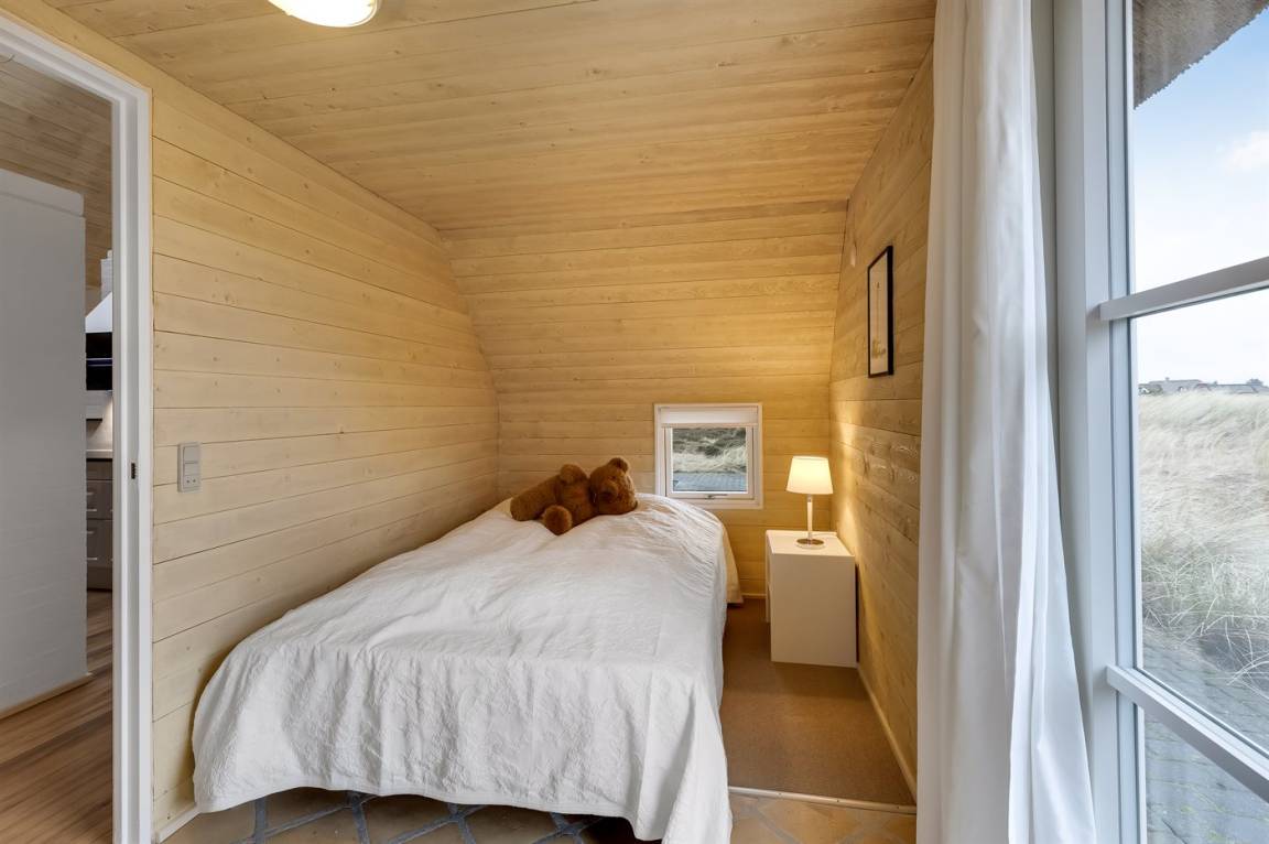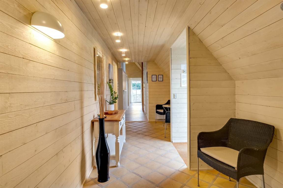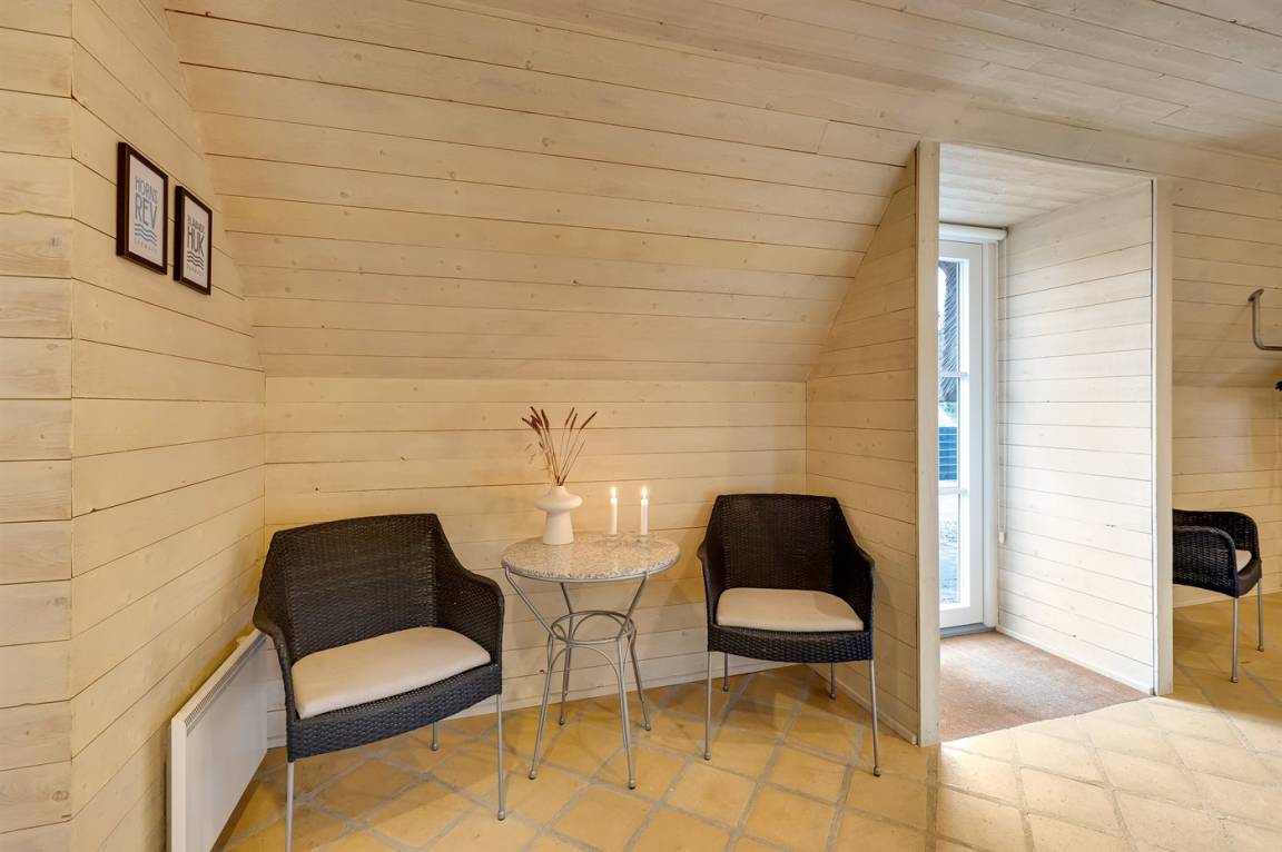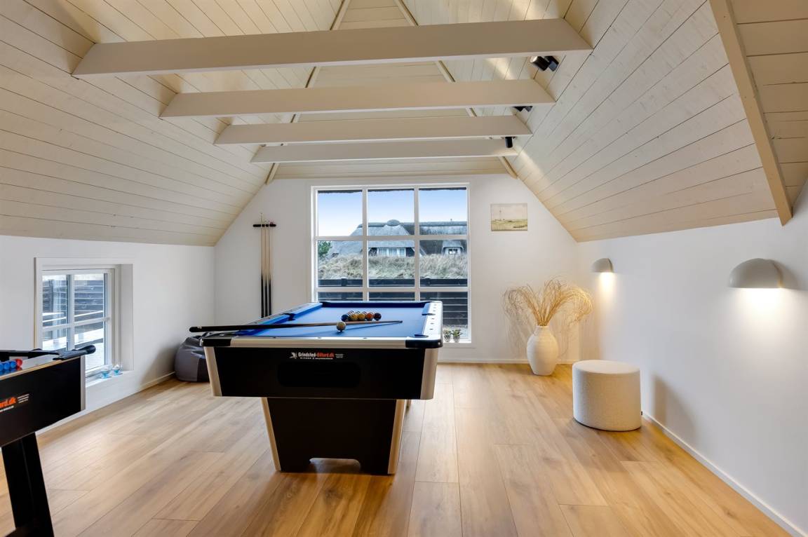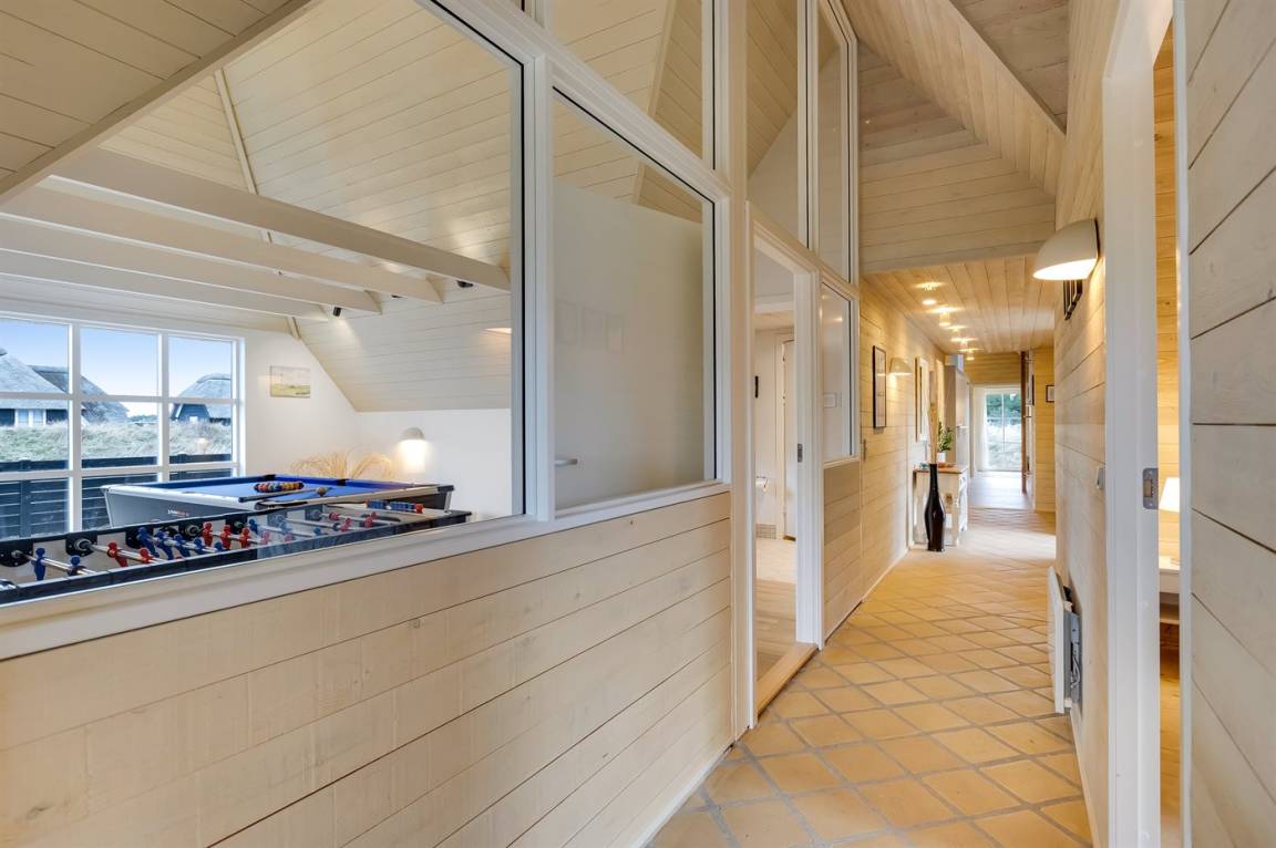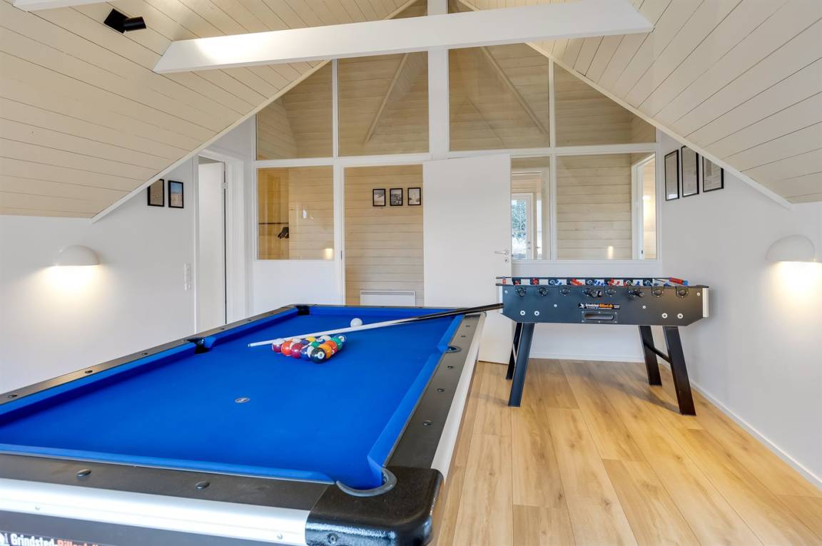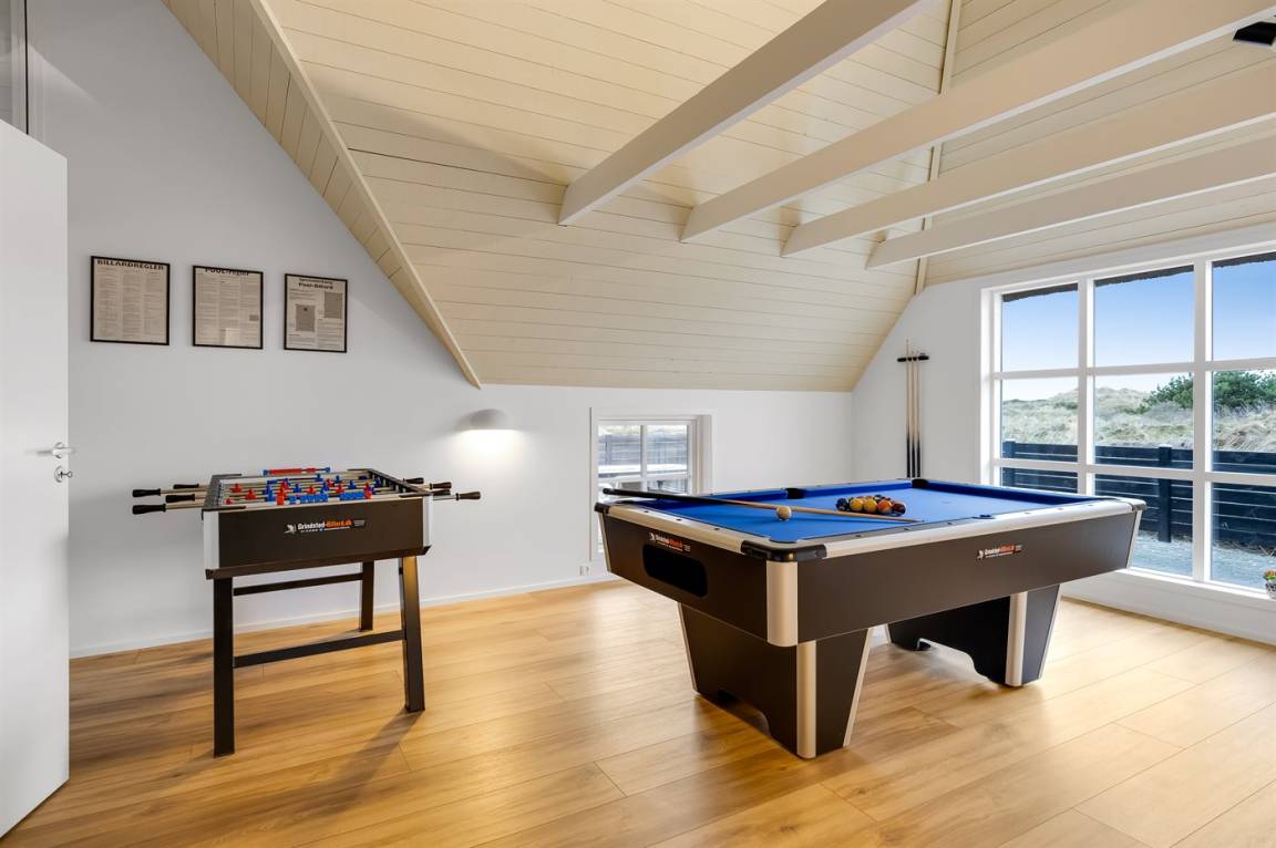 Die Schlafplätze verteilen sich auf 4 Schlafzimmer; 2 mit Doppelbett und 2 mit je 2 Einzelbetten. Ferner gibt es 2 Schlafplätze auf Matratzen im offenen Obergeschoss. 2 schöne Badezimmer, beide mit Fußbodenheizung, Duschnische und Toilette. Von dem einen Badezimmer haben Sie außerdem Zugang zur Sauna, in der Sie sich so richtig entspannen können. Im Hobbyraum gibt es Billardtisch und Tischfußball. Hauswirtschaftsraum mit Waschmaschine und Wäschetrockner. Außerdem steht ein Tiefkühlgerät mit einer Kapazität von 80 Liter zur Verfügung.