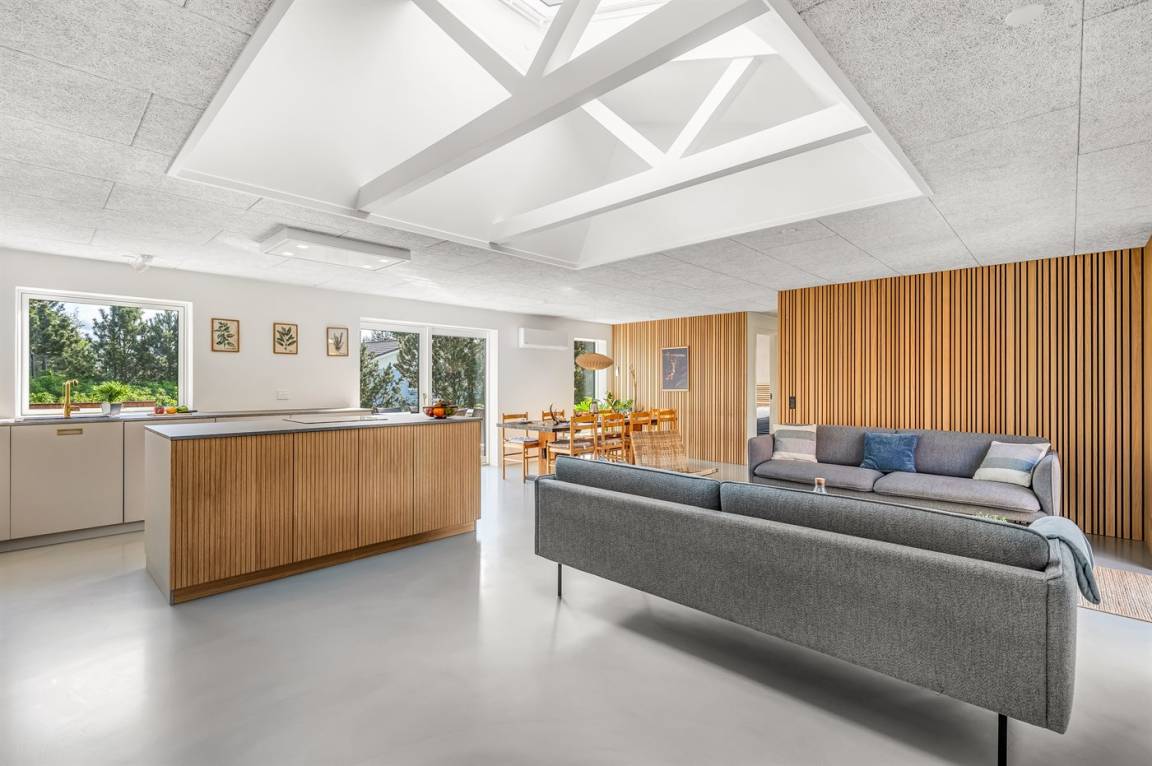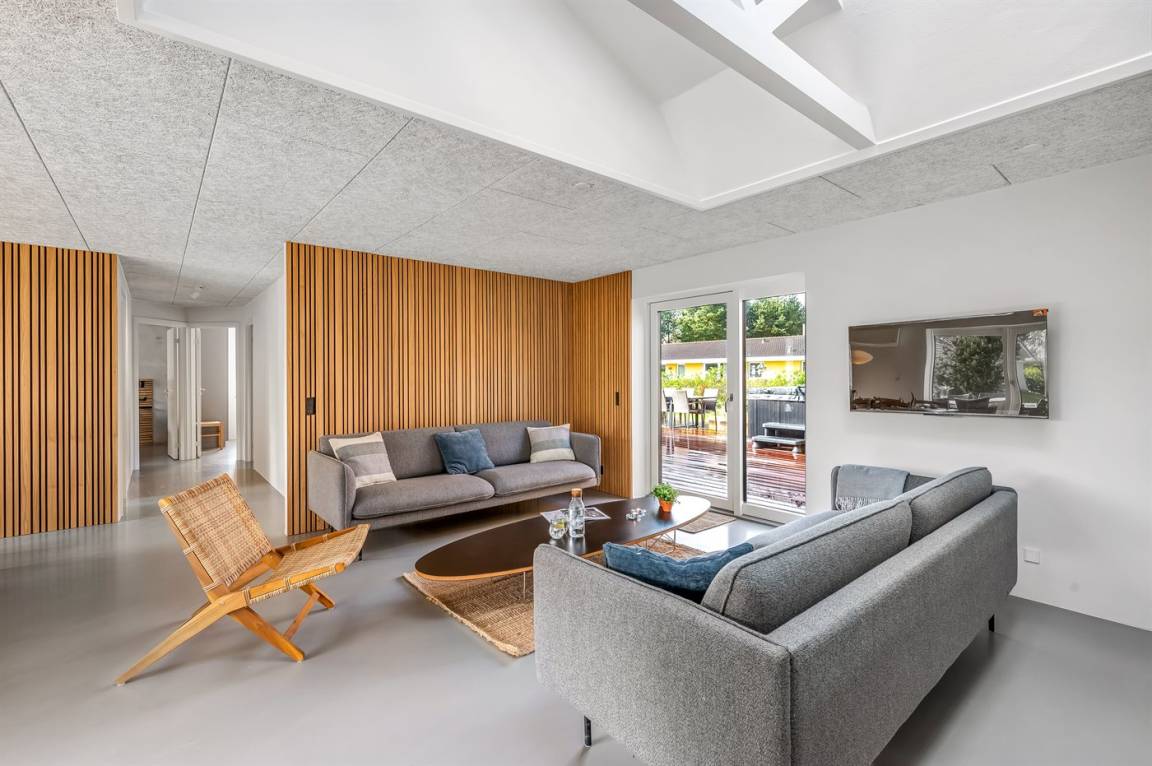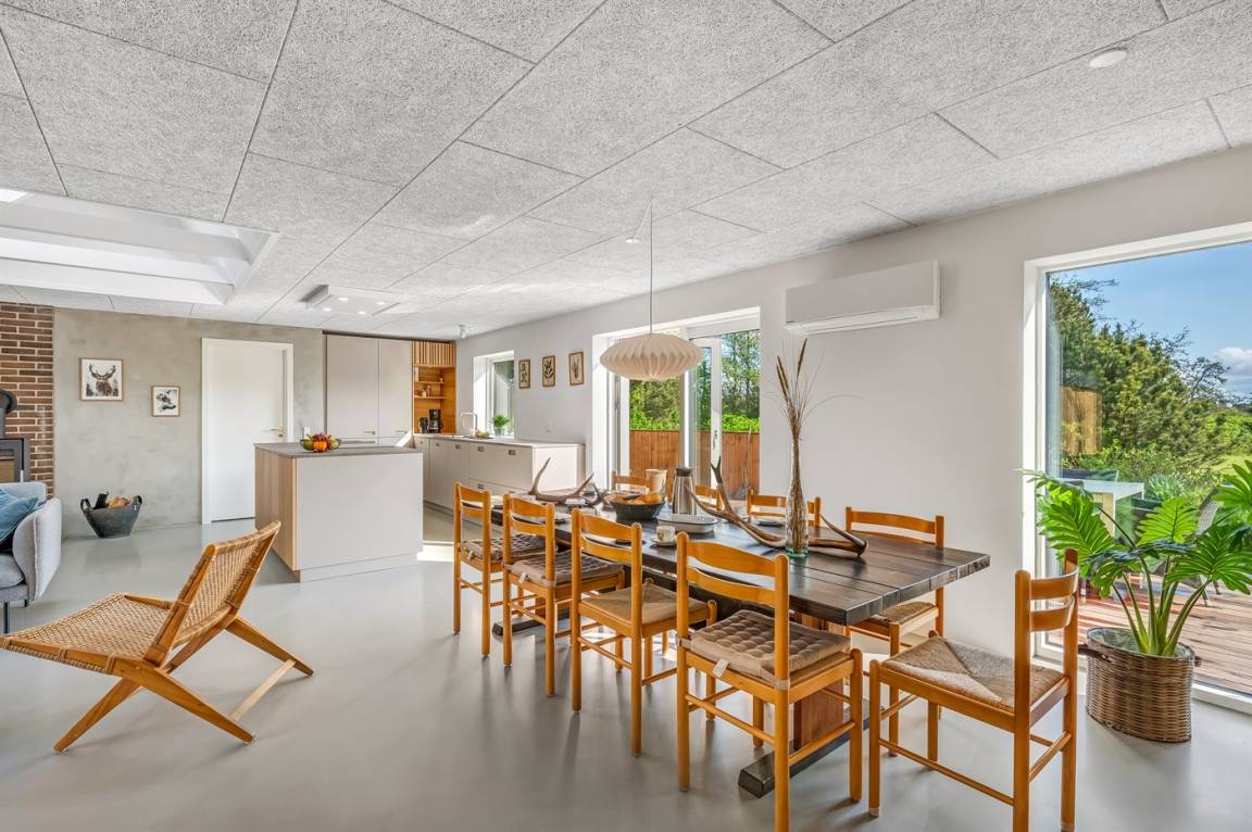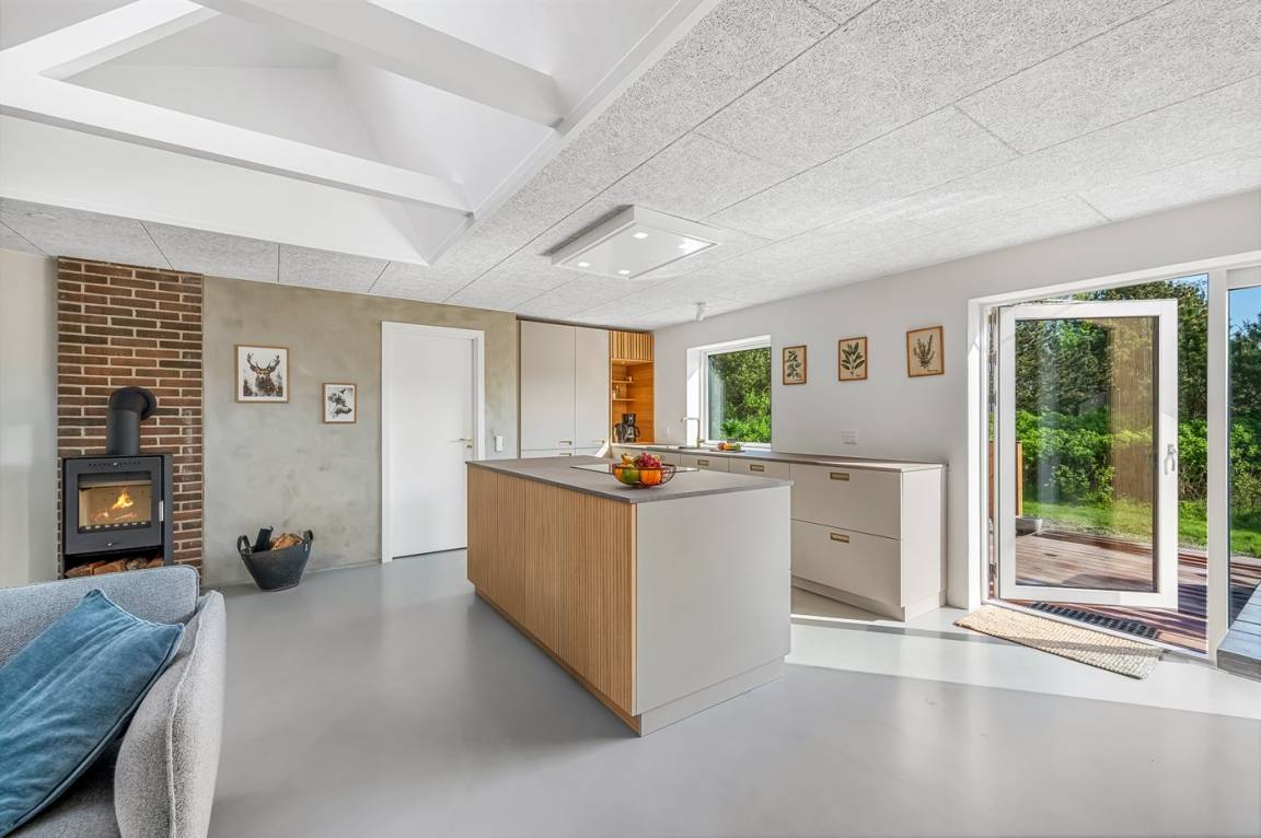 DraußenDie Ferienunterkunft liegt auf einem 1800 m² großen Naturgrundstück. Die Entfernung zum Meer beträgt 3000 m. Die Entfernung zum Fjord beträgt 500 m. Die nächste Einkaufsmöglichkeit liegt 750 m entfernt. In einem Abstand von 500 m gibt es einen Golfplatz. Es steht ein 38 m² Terrassenareal zur Verfügung. Schaukel. Sandkasten. Parkplatz auf dem Grundstück.