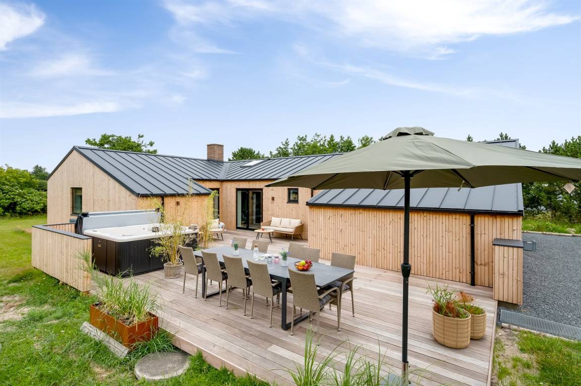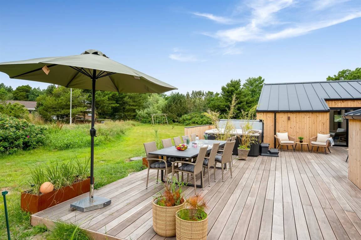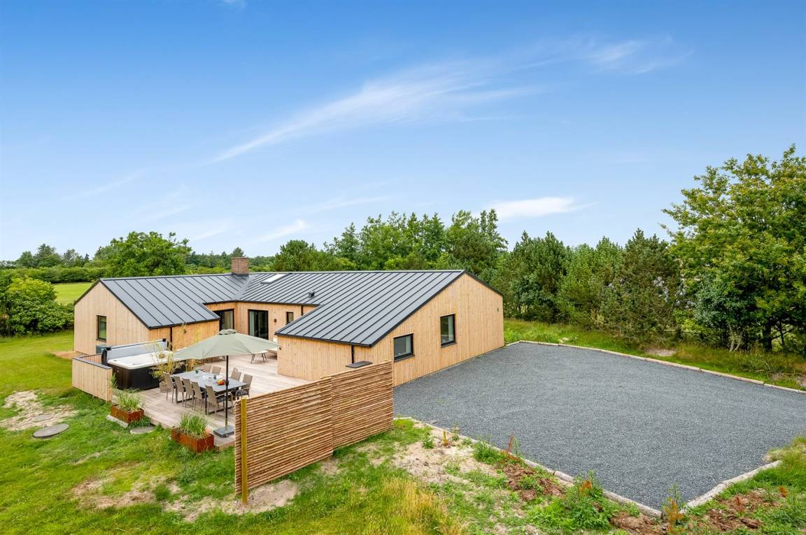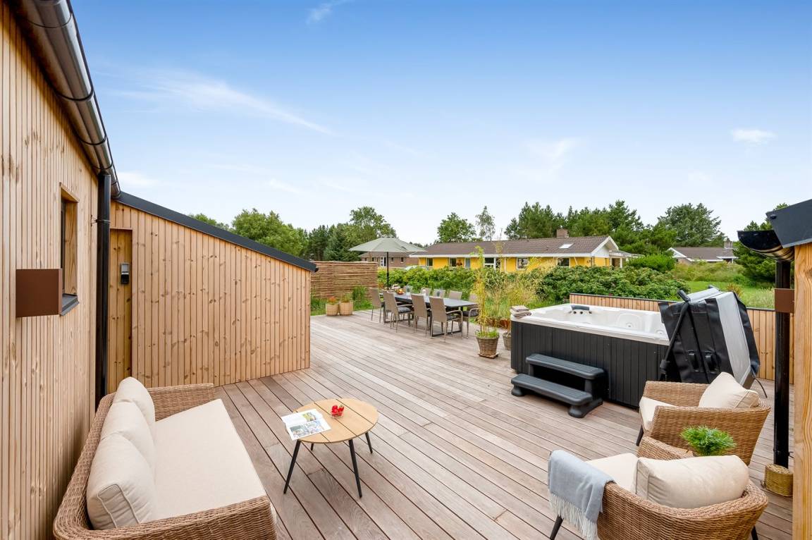 Ferienhaus mit Swimmingpool aus exklusiven Materialien in ruhiger Umgebung gelegen. Das Ferienhaus ist der Mittelpunkt deines Urlaubs mit einem schönen Wohnbereich mit offener Küche und Wohnzimmer, einem Poolraum mit Sauna und der großen Terrasse mit einem großzügigen Whirlpool. Die Umgebung bietet eine reiche Tierwelt und liegt in der Nähe des Blåvandshuk Golfklubs und Skallingen, wo du den feinsten, langgestreckten Strand und eine Heidelandschaft findest, auf der im Sommer Rinder weiden.