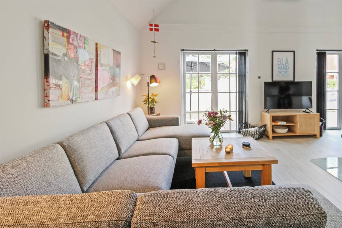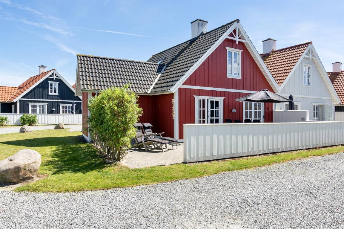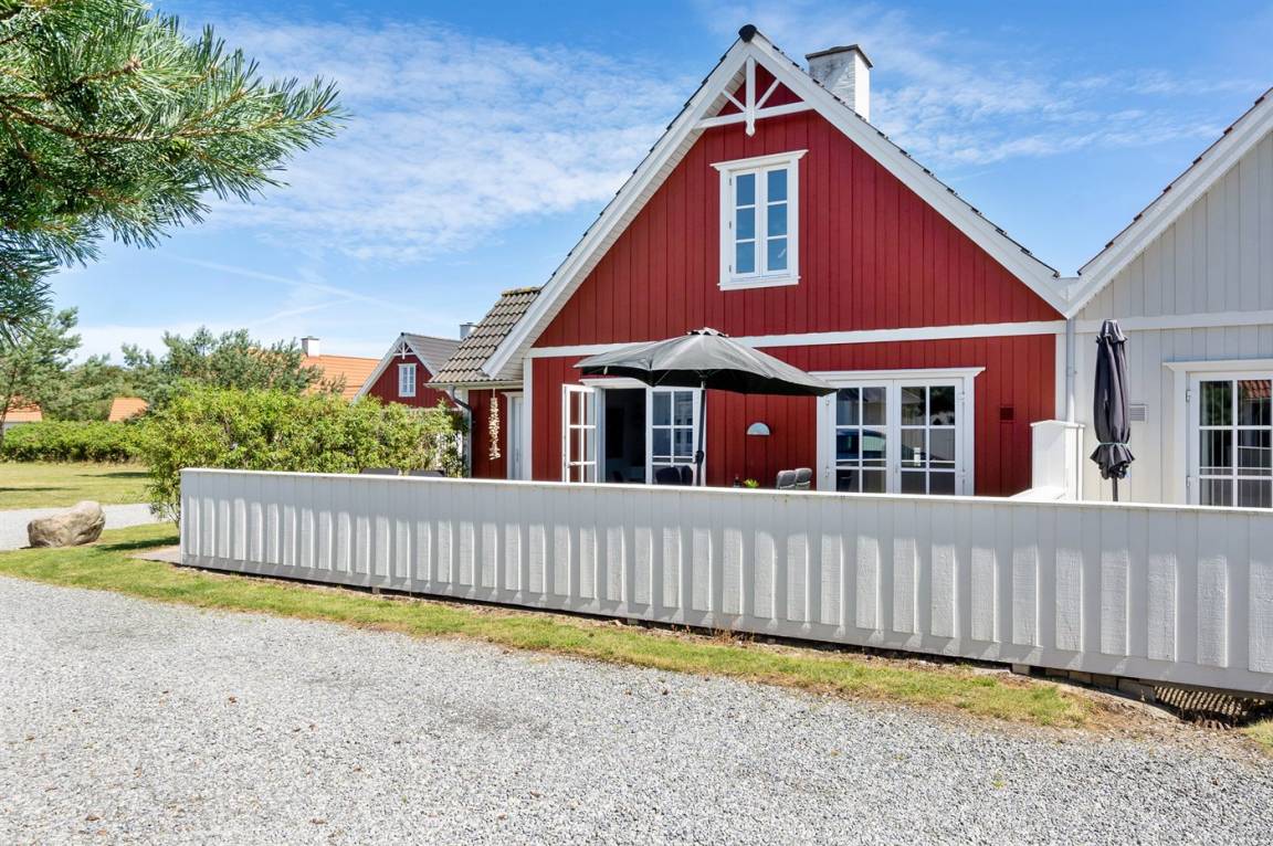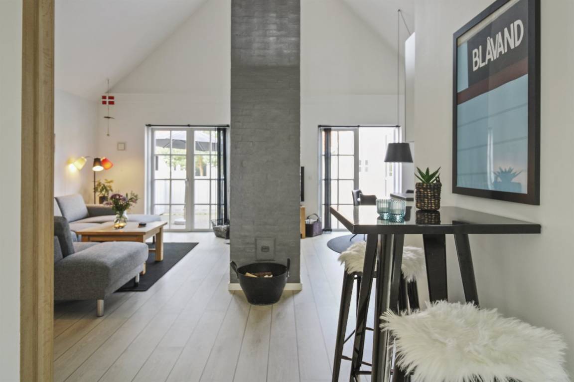 Dieses romantische Ferienhaus mit weißen Sprossenfenstern liegt in der exklusiven Siedlung Blåvandslyst. Das Ferienhaus liegt zentral in einer Gegend mit einem kleinen Wasserlauf und weißen Brücken, in der Nähe von Restaurants, Einkaufsmöglichkeiten und Strand.
