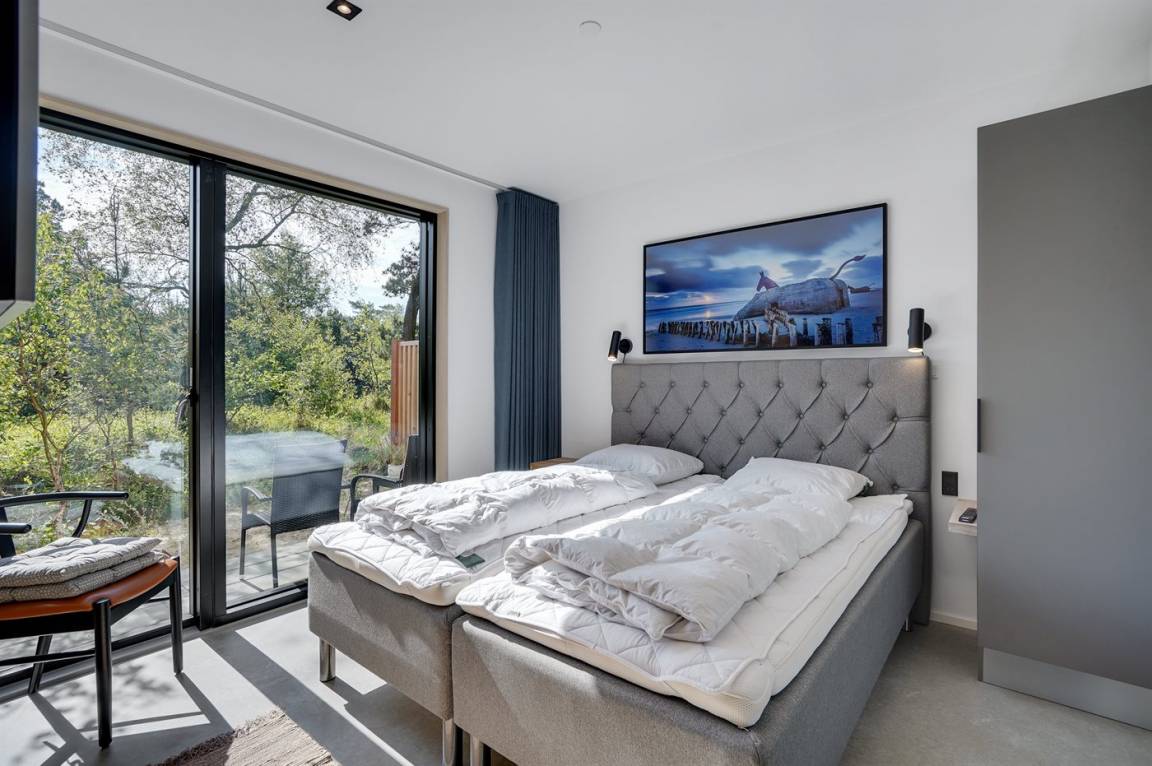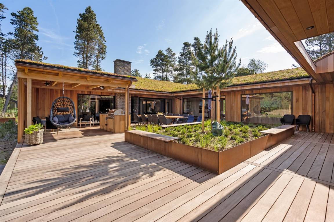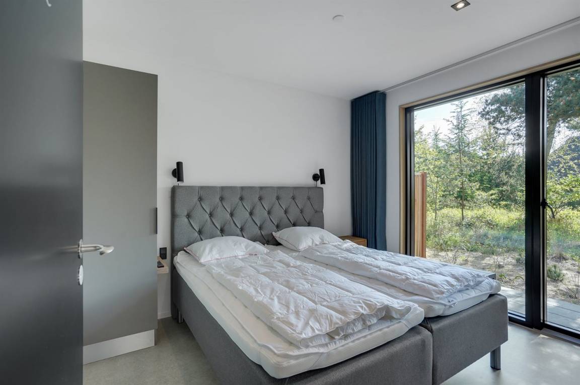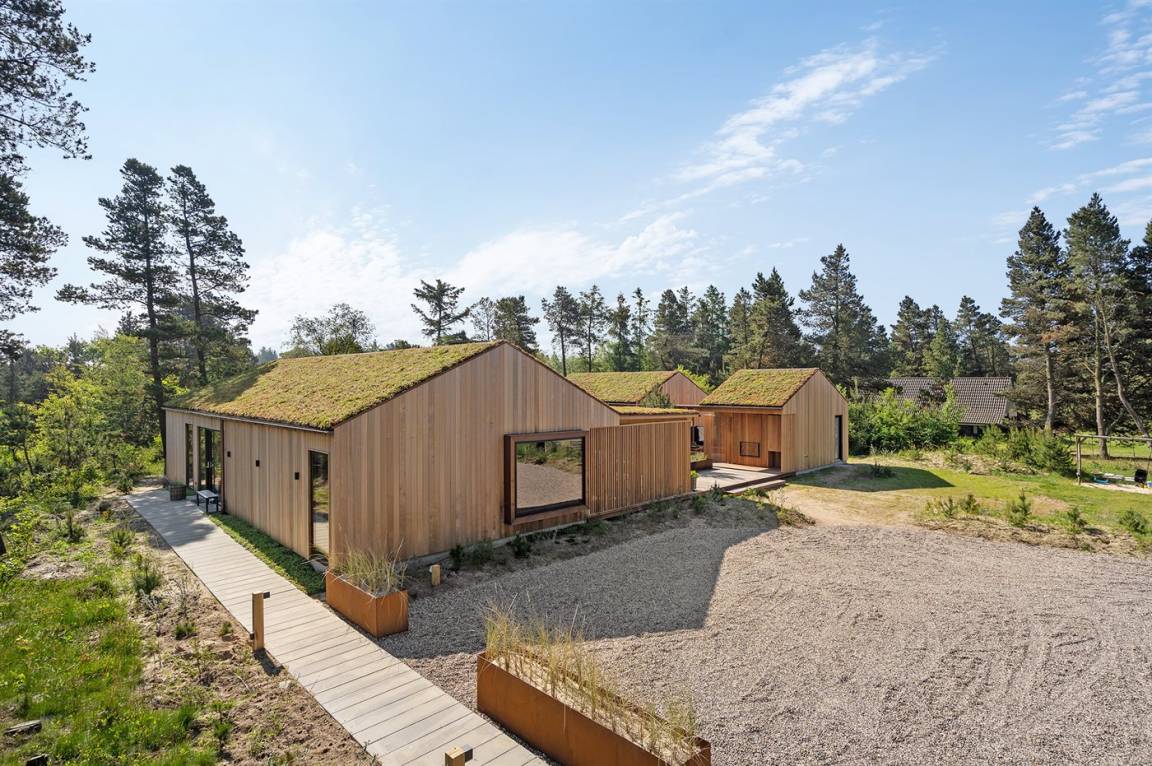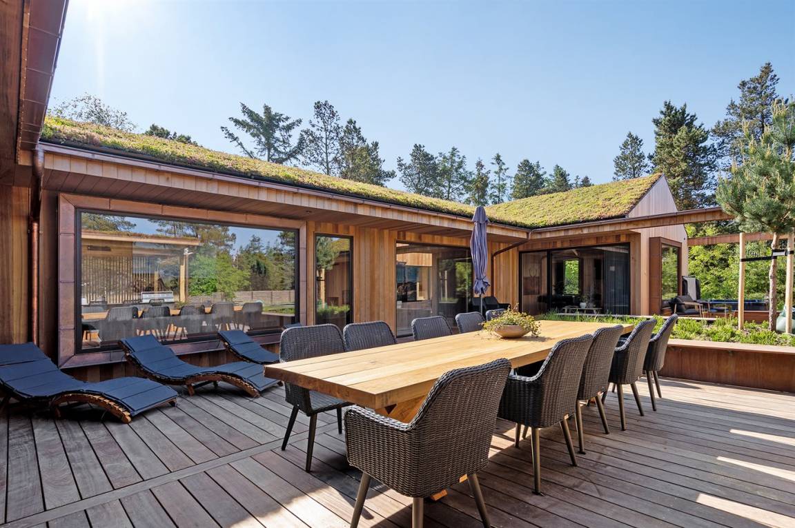 Ein tolles, von einem Architekten entworfenes Ferienhaus aus hochwertigen Materialien wie z. B. Eichenholz und Kupfer. Das Haus liegt in Blåvand – auf einem 2800 m² großen, ruhigen Naturgrundstück am Ende einer Sackgasse in malerischer Natur.