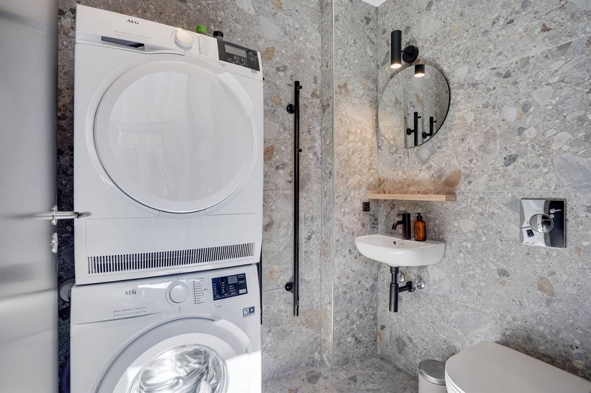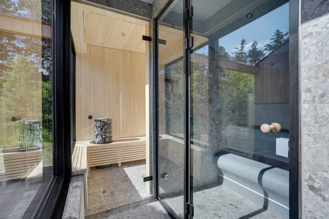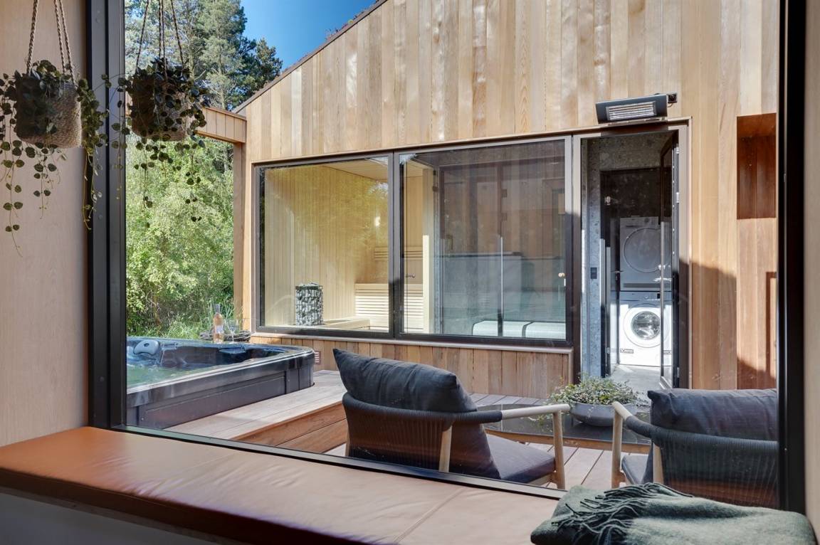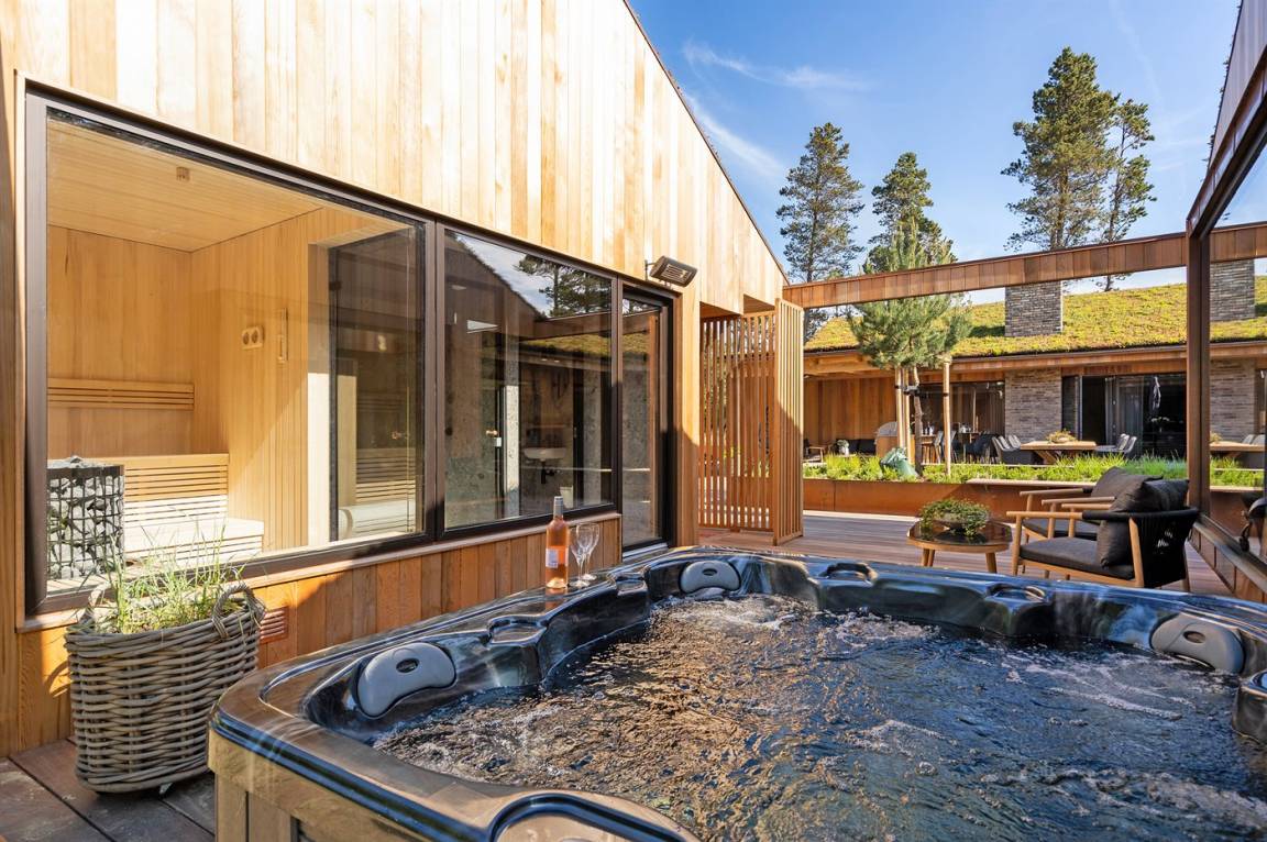 In Verbindung mit der großen Terrasse steht ein Freiluft-Wellnessbereich mit Freiluft-Whirlpool für bis zu 5 Personen und Freiluftdusche zur Verfügung. Im Anschluss daran befinden sich eine Sauna und eine Dampfdusche sowie eine weitere Toilette mit Waschmaschine und Trockner.