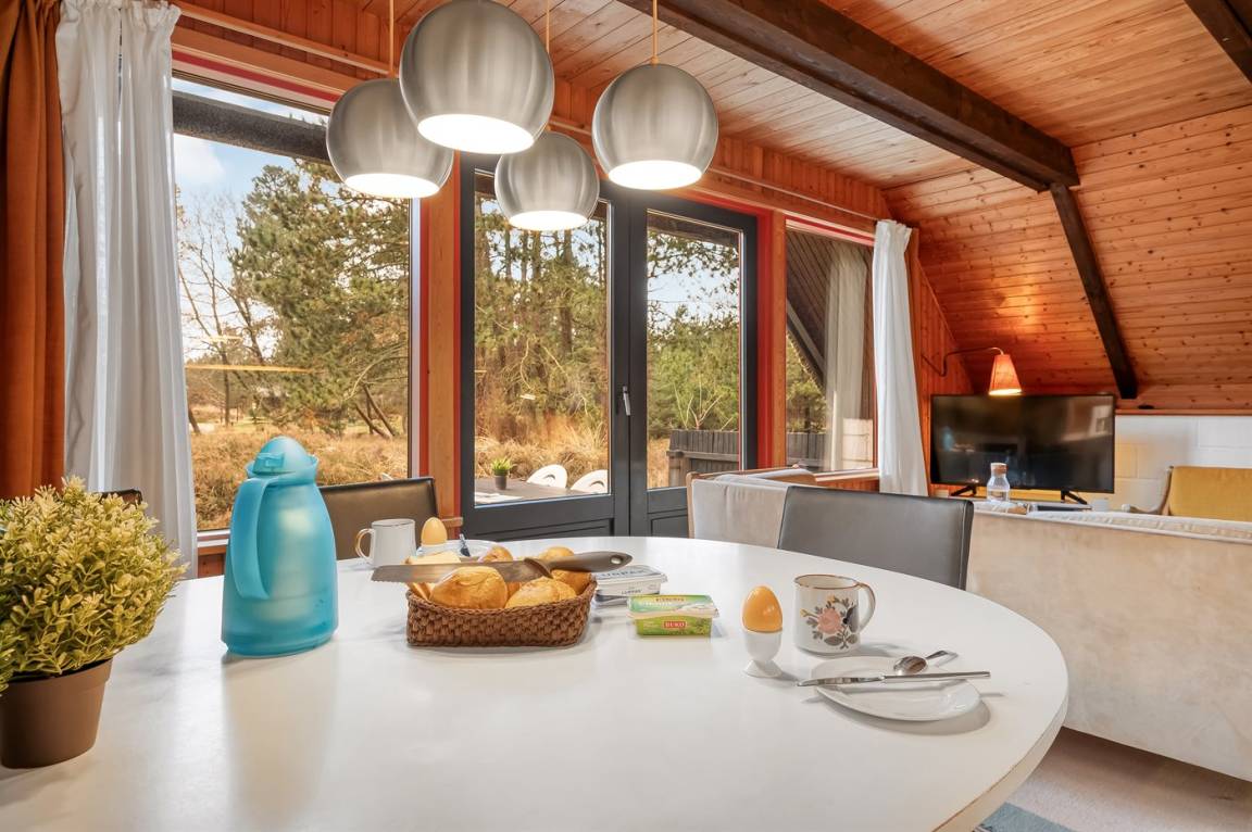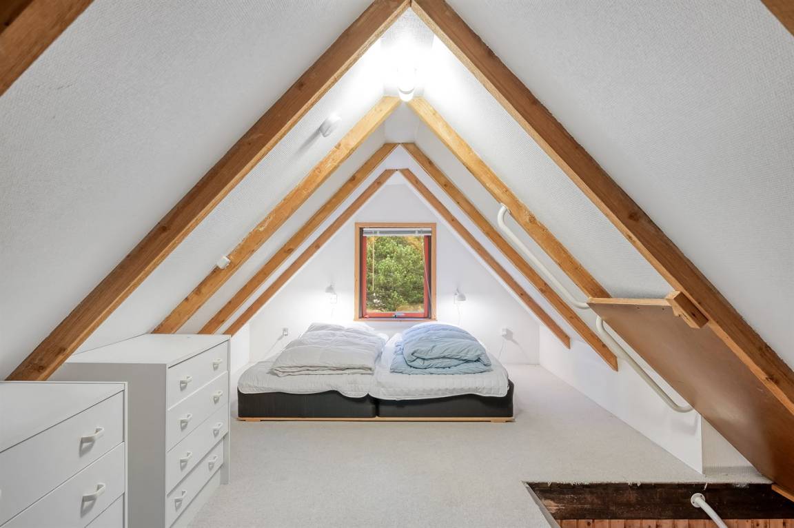 Ferienhaus auf einem leicht hügeligen Dünengrundstück. Zusätzlich zu den rund 60 m² Grundfläche verfügt das Haus über einen 25 m² großen Obergeschoß mit einem Doppelbett, das über eine Treppe zugänglich ist.