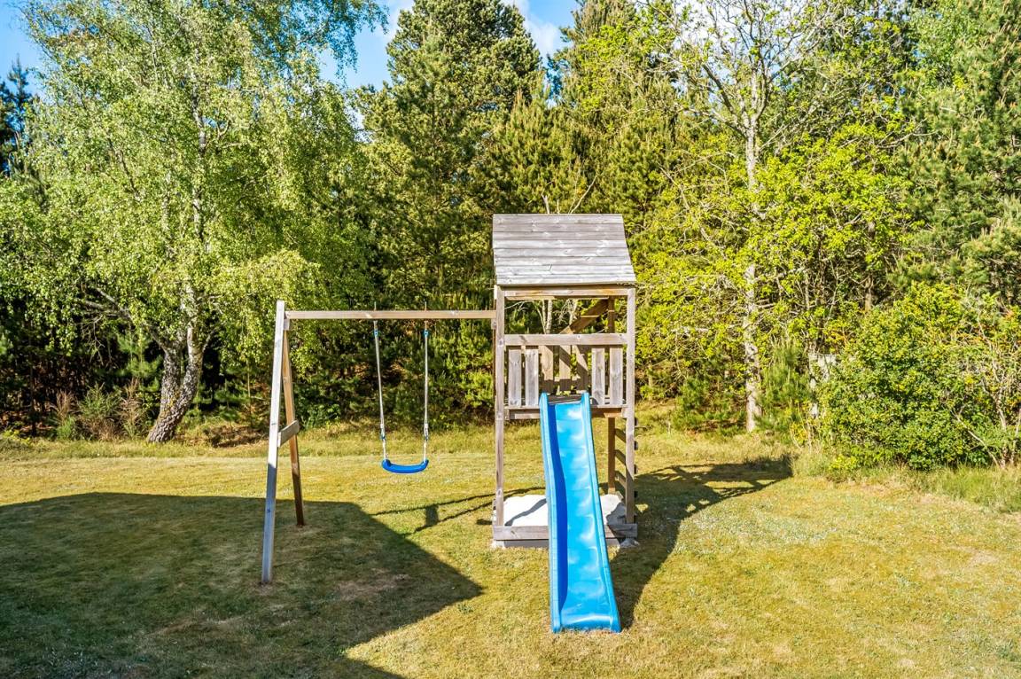 Um das Ferienhaus gibt es mehrere Terrassen und gemütliche Sitzecken, unter anderem eine überdachte. Für die Jüngsten sind ein Sandkasten, eine Schaukel und ein Spielturm vorhanden.