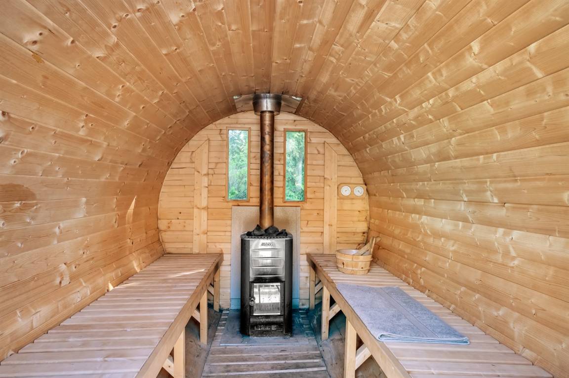 Das Haus liegt auf einem großen Grundstück am Ende einer Sackgasse, umgeben von Kiefern. Hier hat man mit Outdoorsauna und einem Hot-Tub seinen eigenen Luxusbereich unter freiem Himmel. Die Voraussetzungen für einen kleinen Wellnessurlaub sind also bestens.