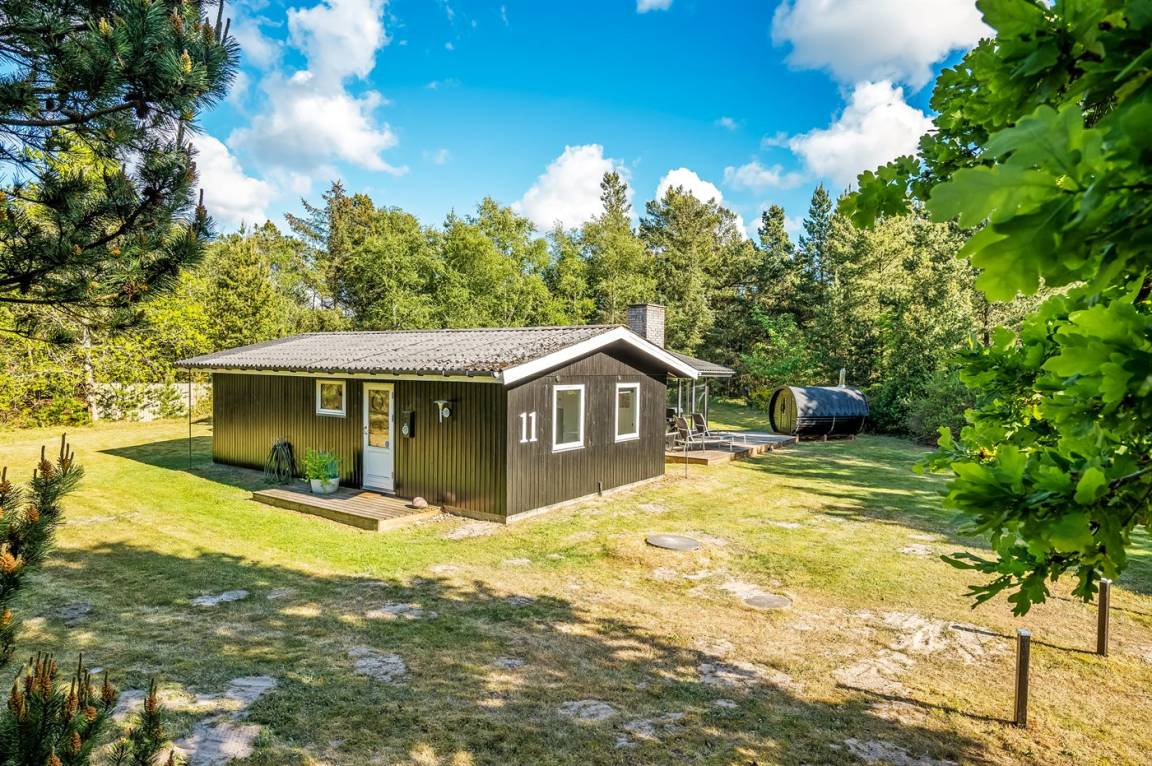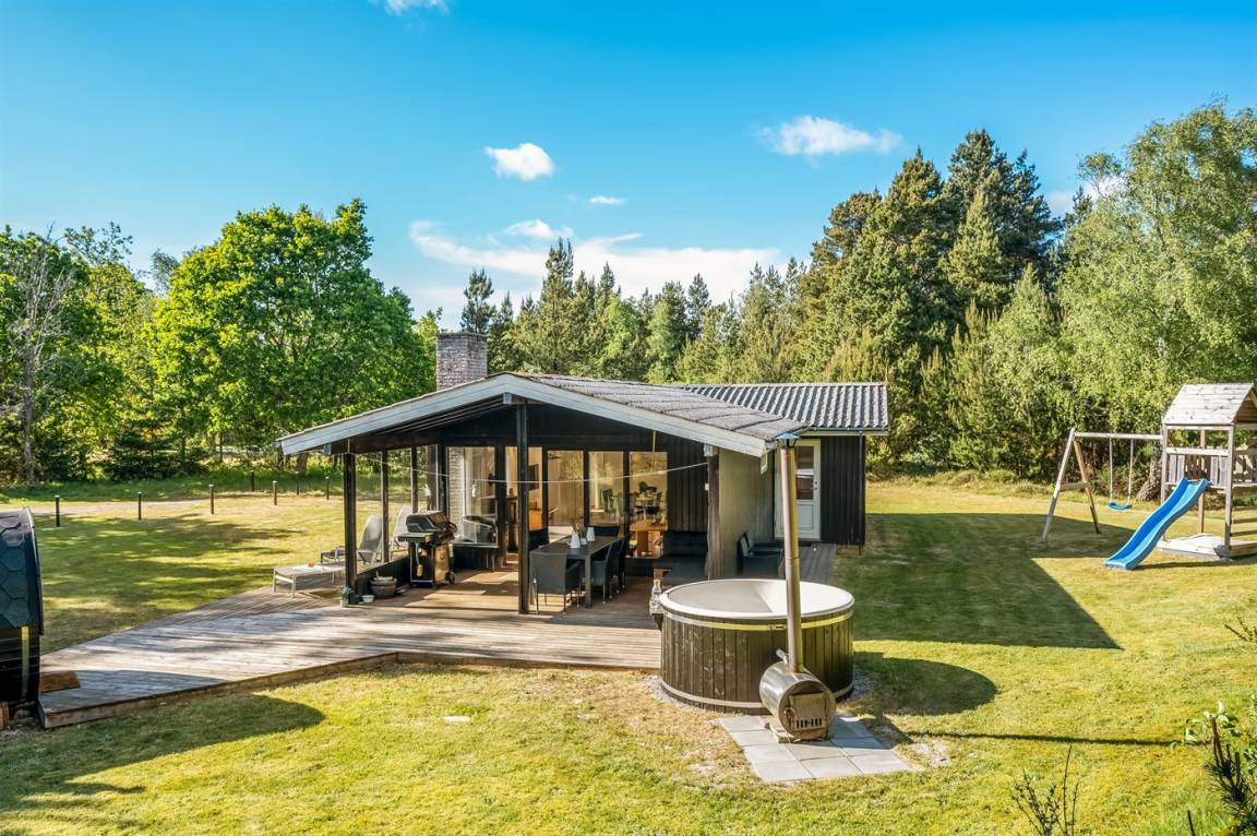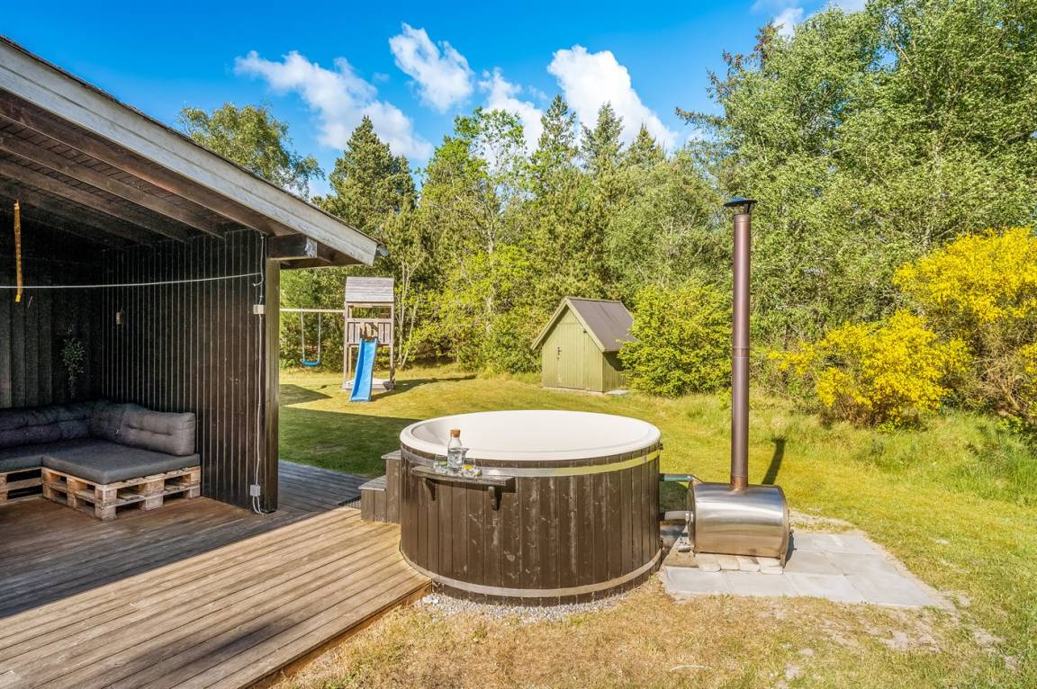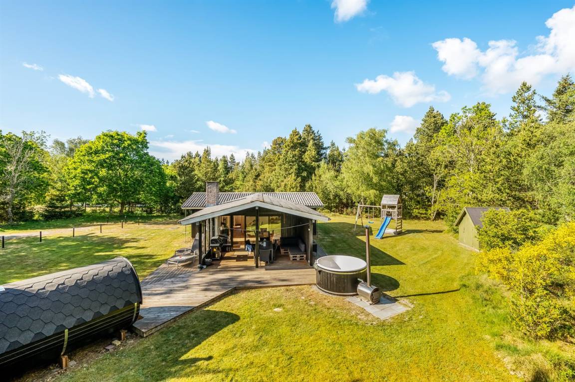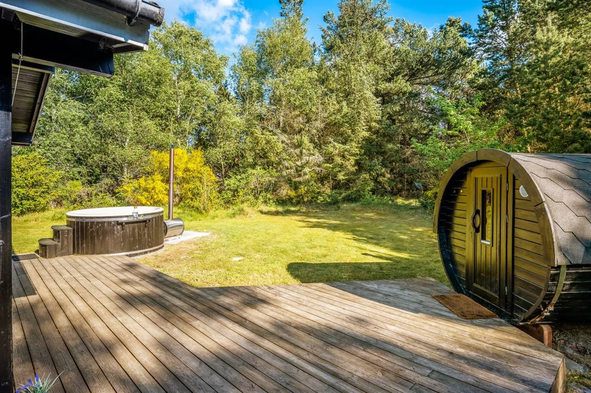 Das Ferienhaus liegt auf einem über 2.800 m² großen Naturgrundstück am Ende einer Sackgasse. Die hohen Bäume vermitteln den Eindruck, man sei allein in der Natur, und schirmen das Grundstück von der restlichen Umgebung ab, was für Windschutz und Privatsphäre sorgt. Hier inmitten der Natur Westjütlands könnt ihr euch mit einer Runde Sauna oder Hot-Tub verwöhnen und den Abend im warmen Wasser unter dem Sternenhimmel verbringen.