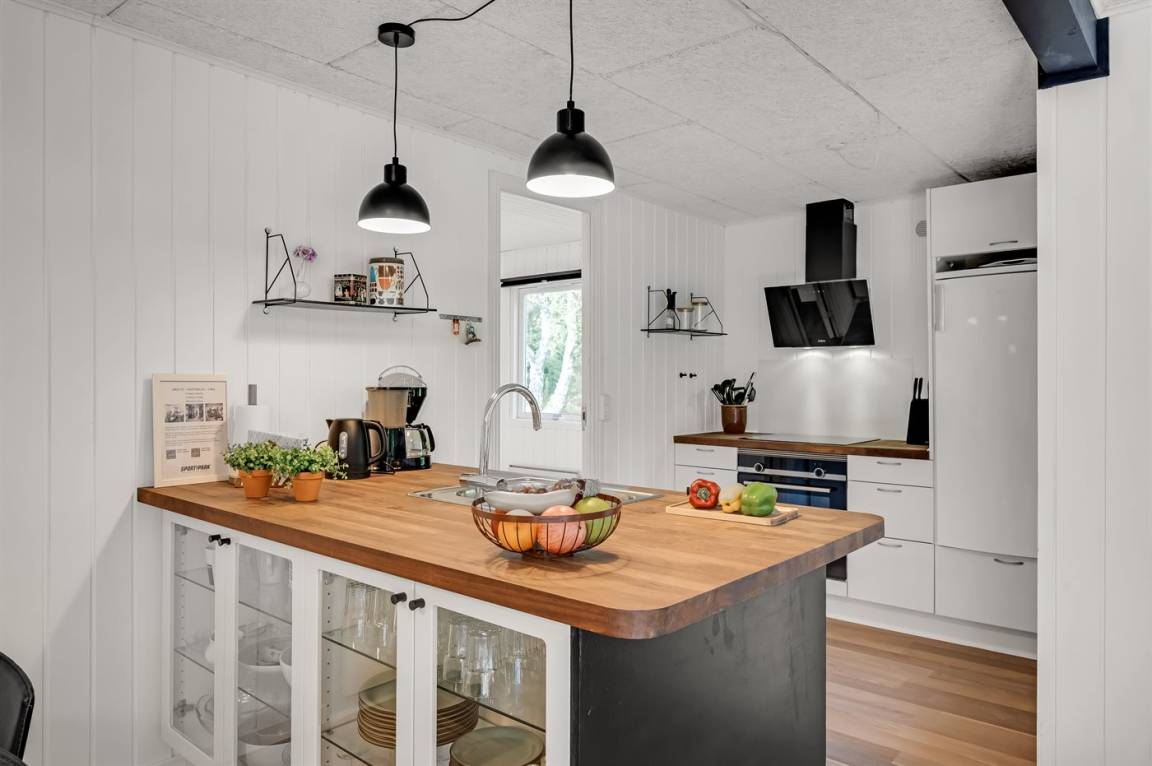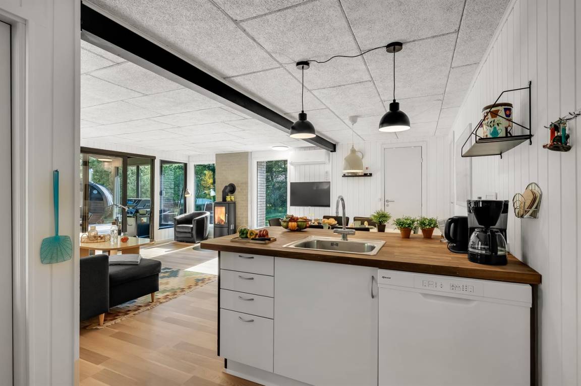 Der Mittelpunkt des Hauses ist der offene Koch-Wohnbereich. Hier kann sich die ganze Familie zu leckeren Urlaubsgerichten am Esstisch oder zu schönen Stunden vor dem Kamin zusammenfinden. Um den Abwasch kümmert sich die Geschirrspülmaschine, damit sich alle auf die schöne gemeinsame Zeit konzentrieren können.