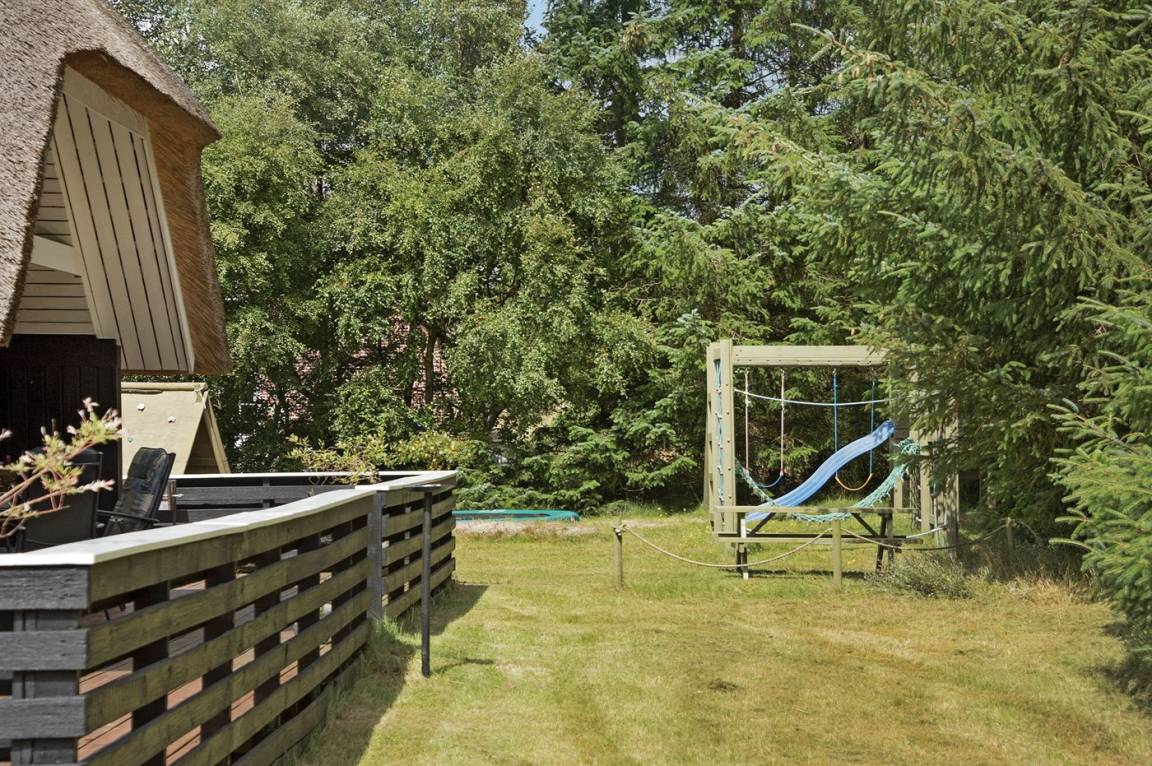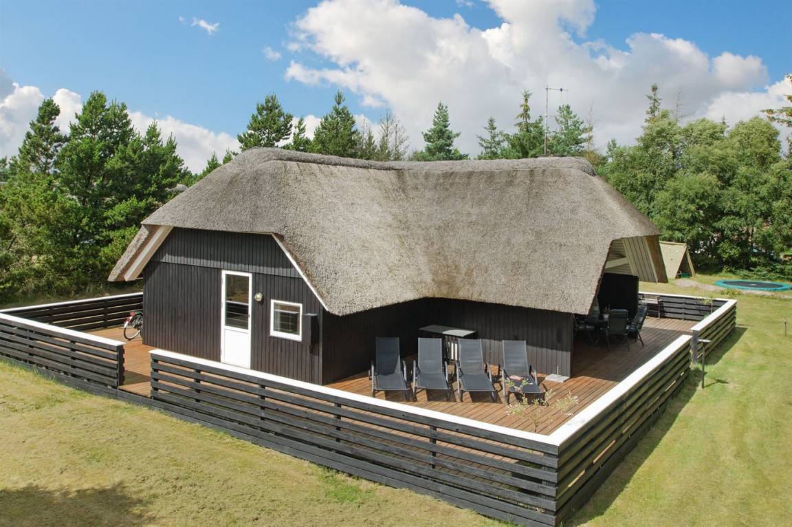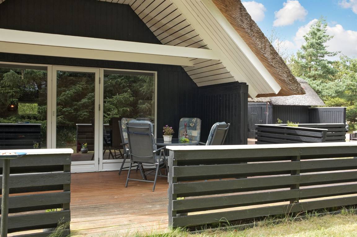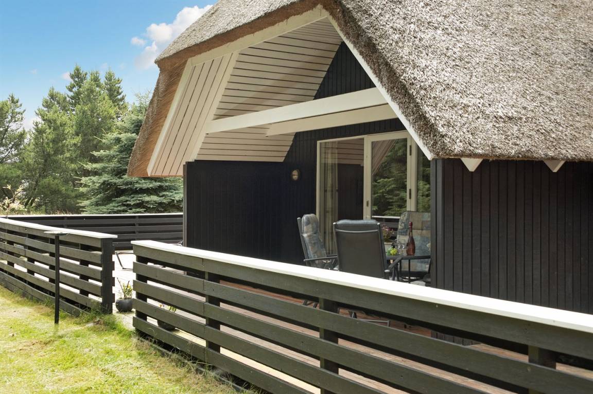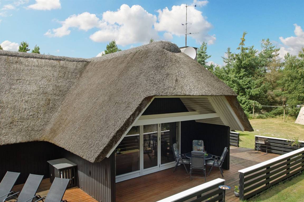 Schönes Ferienhaus mit Reetdach und Zugang zu großem, abgeschirmtem Holzterrassenareal. Das Wohnzimmer hat sichtbare Balken und schrägende Decken. Vom Wohnzimmer gelangen Sie in das kinderfreundliche, offene Obergeschoss mit TV ohne Antennenanschluss (nur für Spiele geeignet) und Minitischfußball.
