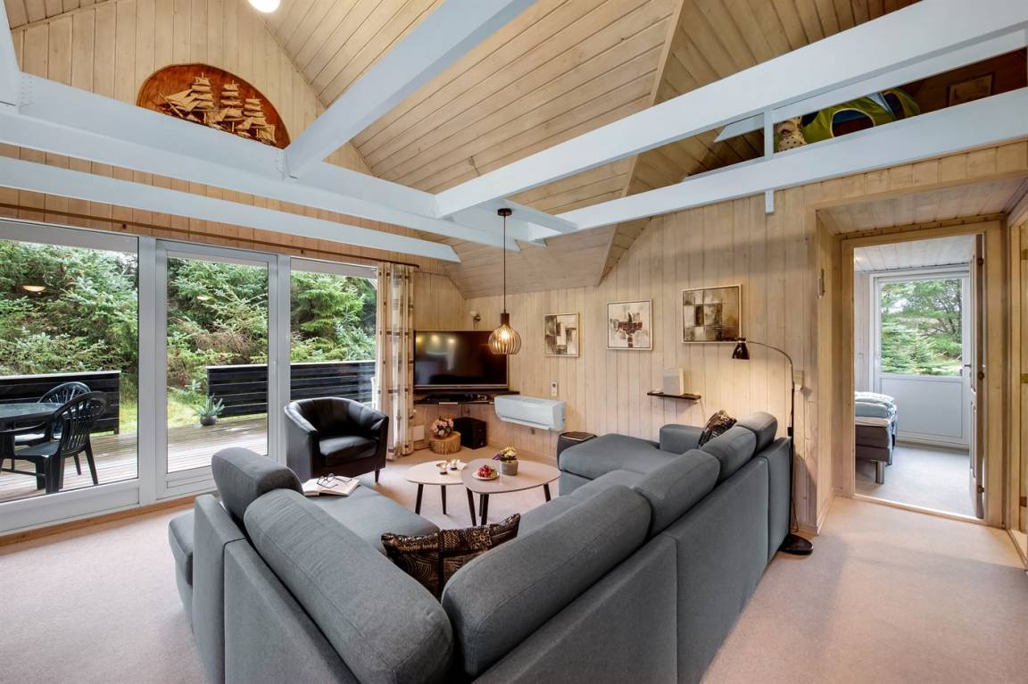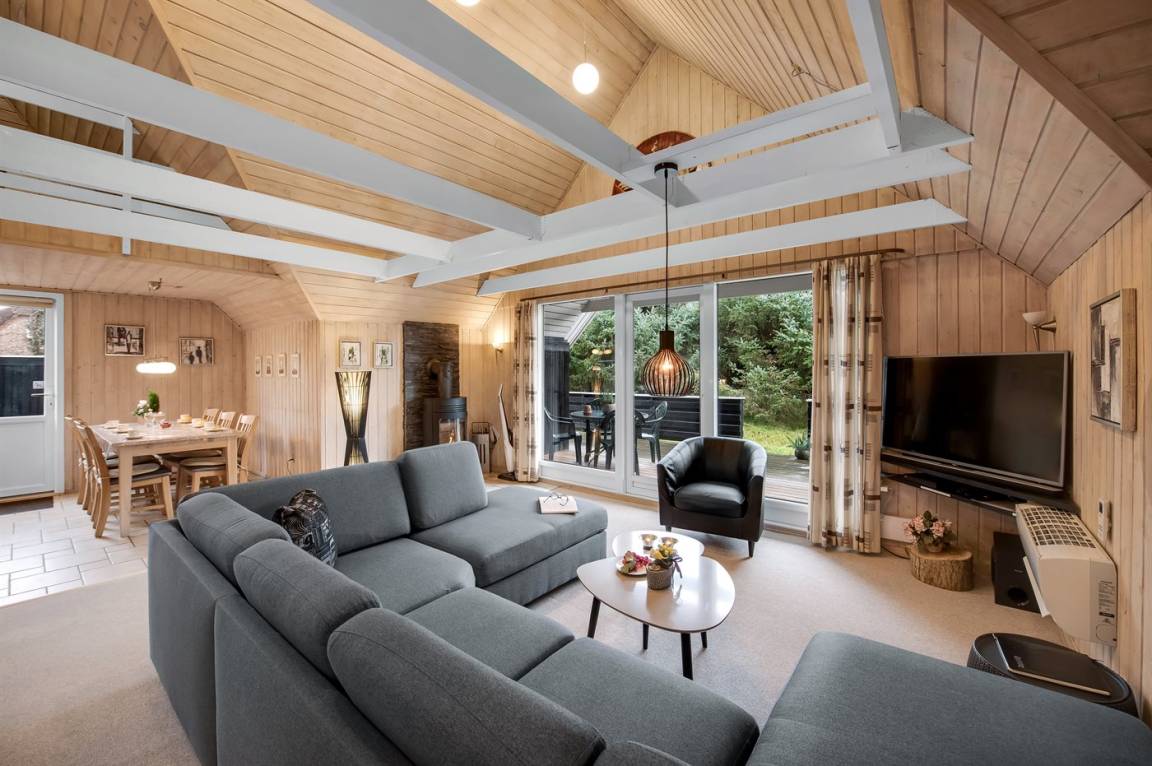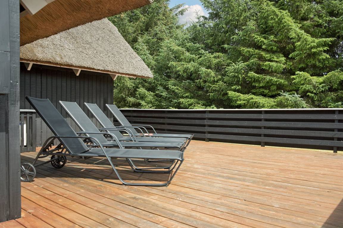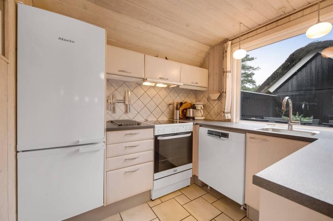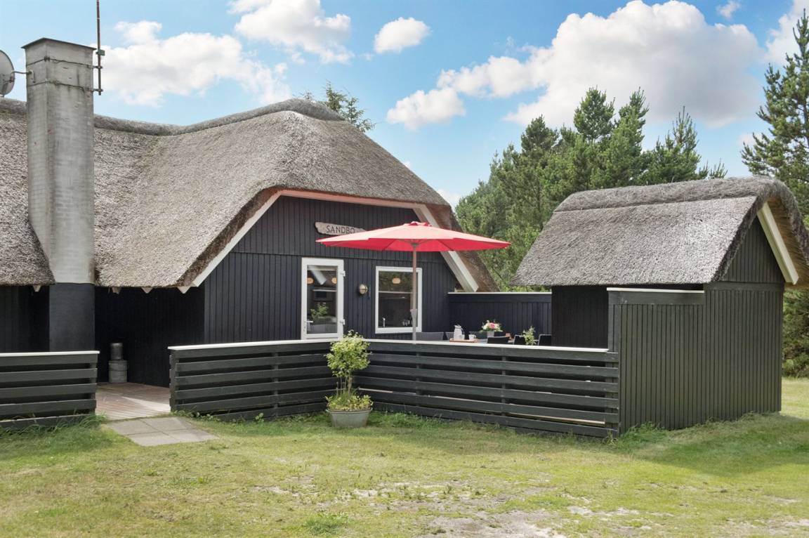 Schönes Ferienhaus mit Reetdach und Zugang zu großem, abgeschirmtem Holzterrassenareal. Das Wohnzimmer hat sichtbare Balken und schrägende Decken. Vom Wohnzimmer gelangen Sie in das kinderfreundliche, offene Obergeschoss mit TV ohne Antennenanschluss (nur für Spiele geeignet) und Minitischfußball.