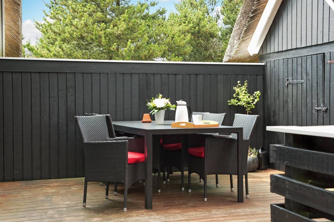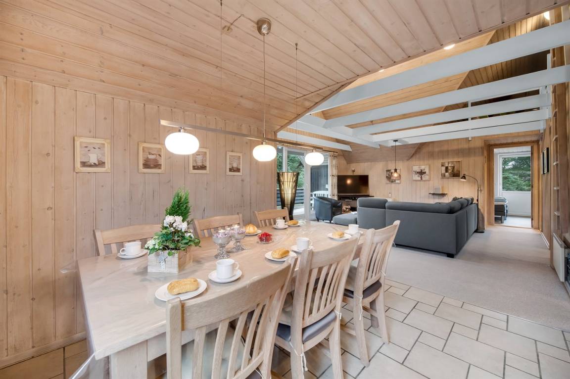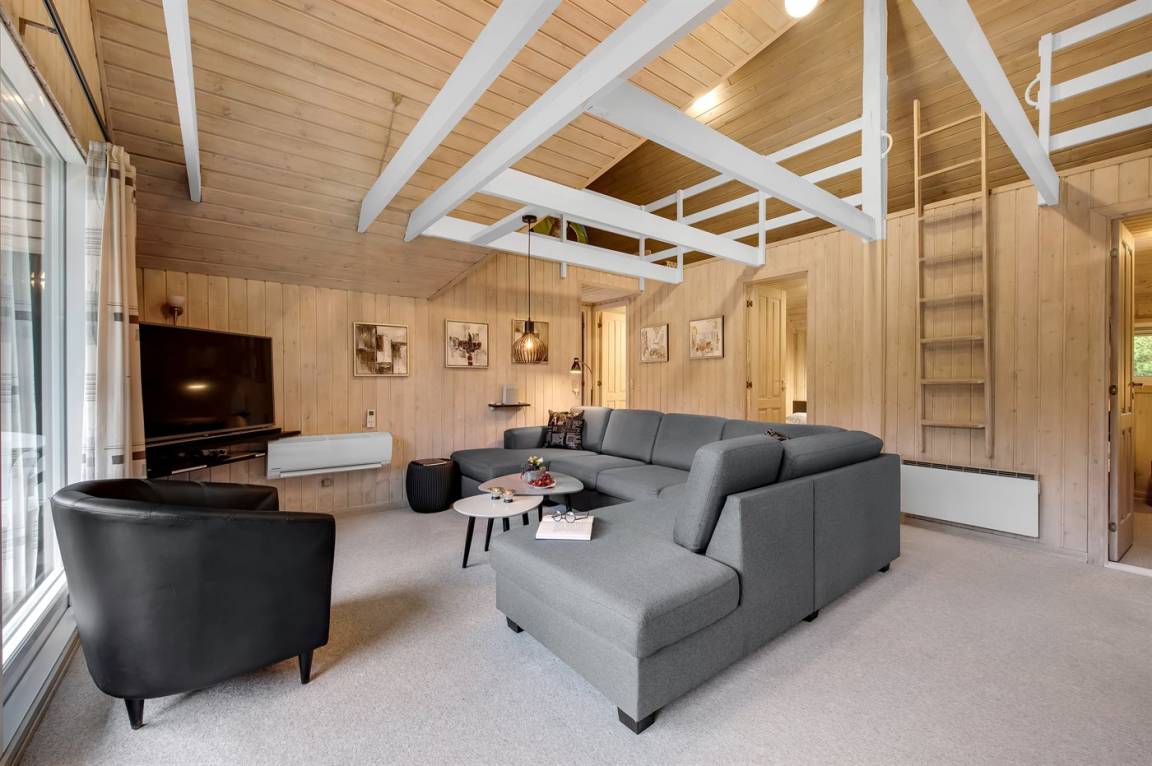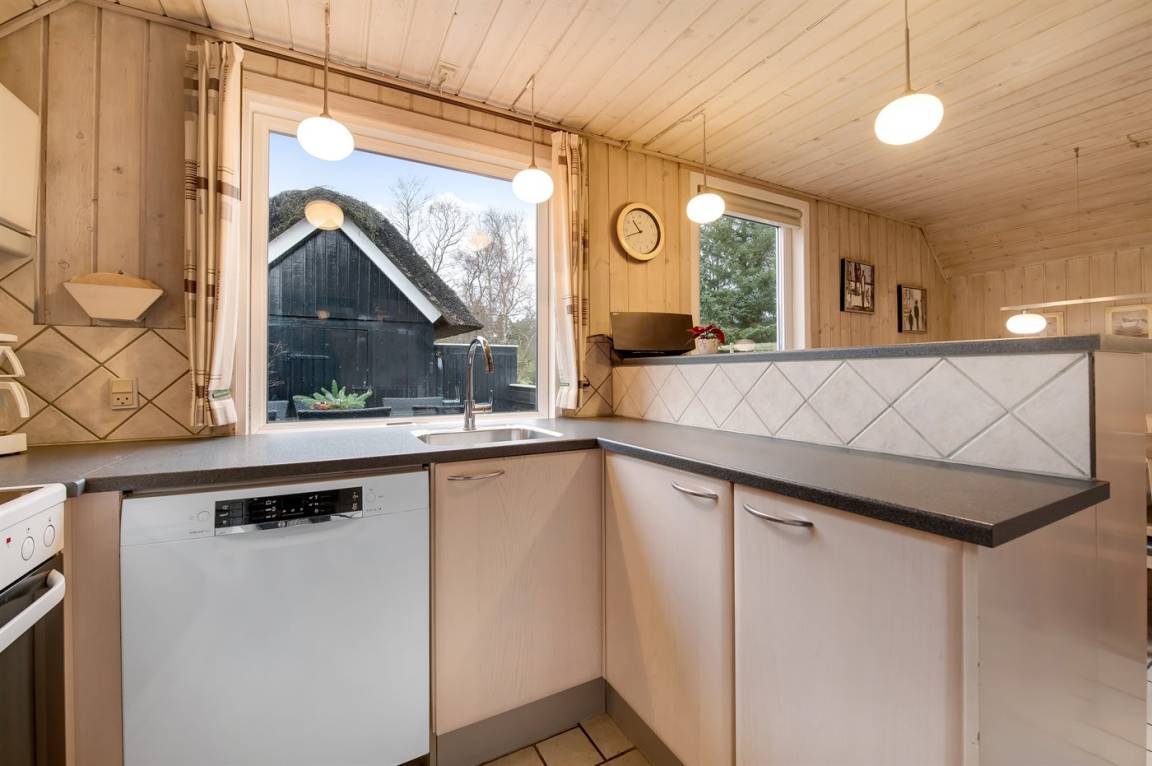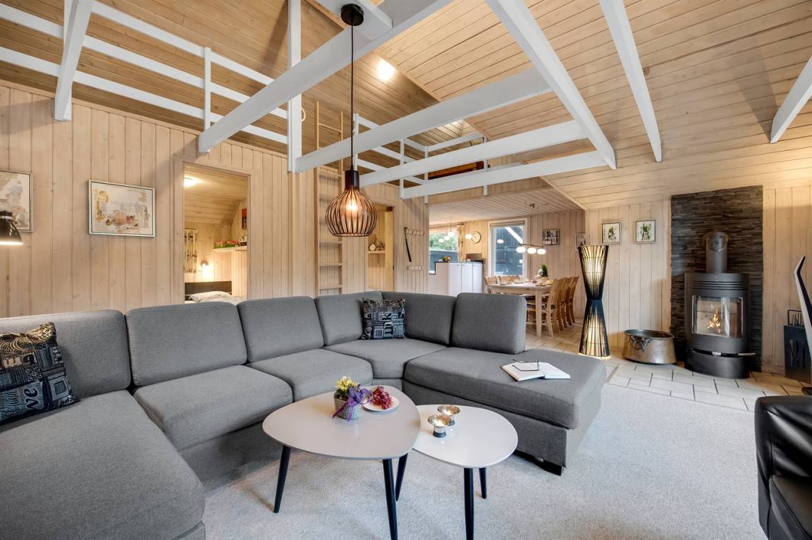 Schönes Ferienhaus mit Reetdach und Zugang zu großem, abgeschirmtem Holzterrassenareal. Das Wohnzimmer hat sichtbare Balken und schrägende Decken. Vom Wohnzimmer gelangen Sie in das kinderfreundliche, offene Obergeschoss mit TV ohne Antennenanschluss (nur für Spiele geeignet) und Minitischfußball.