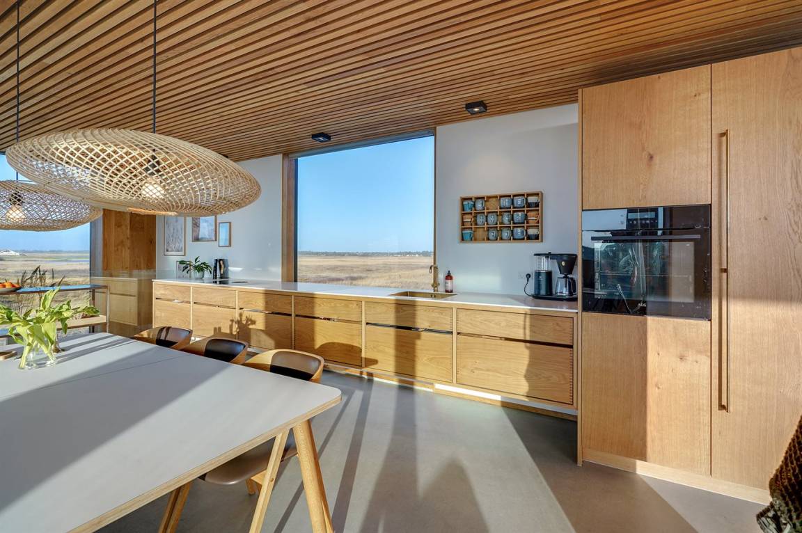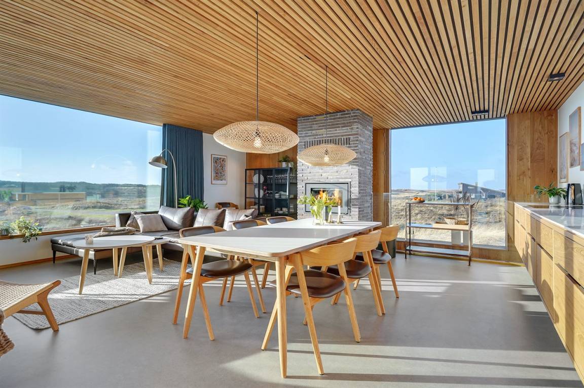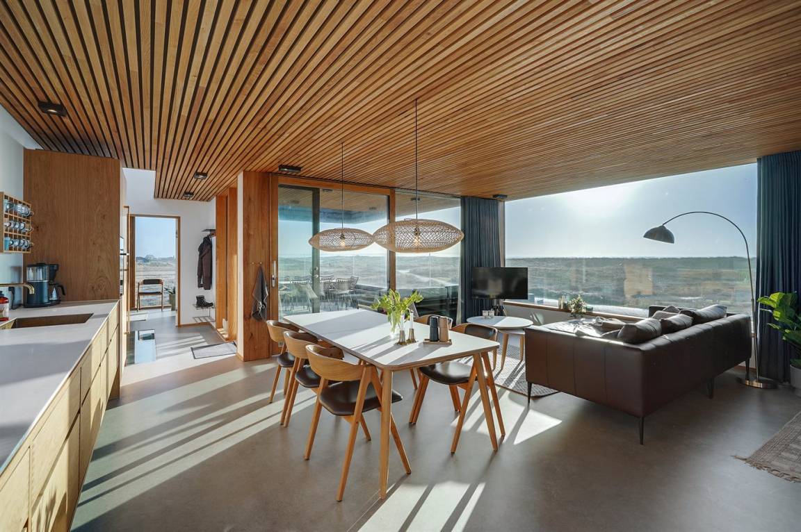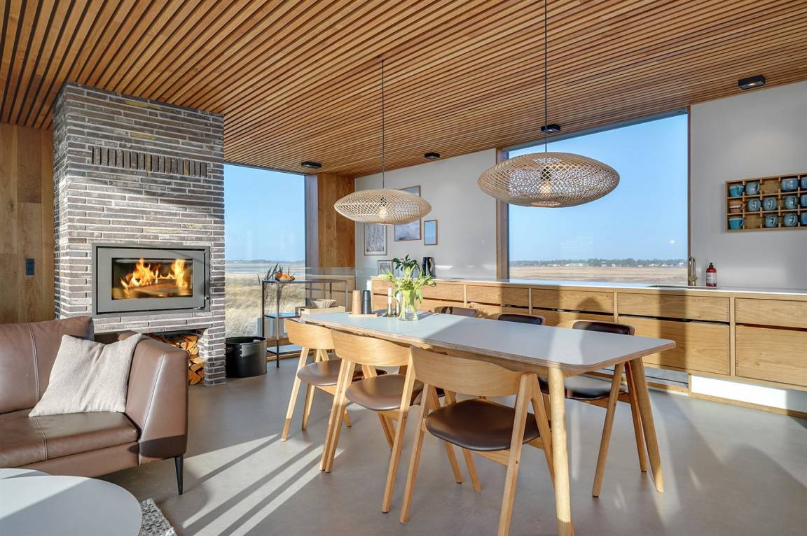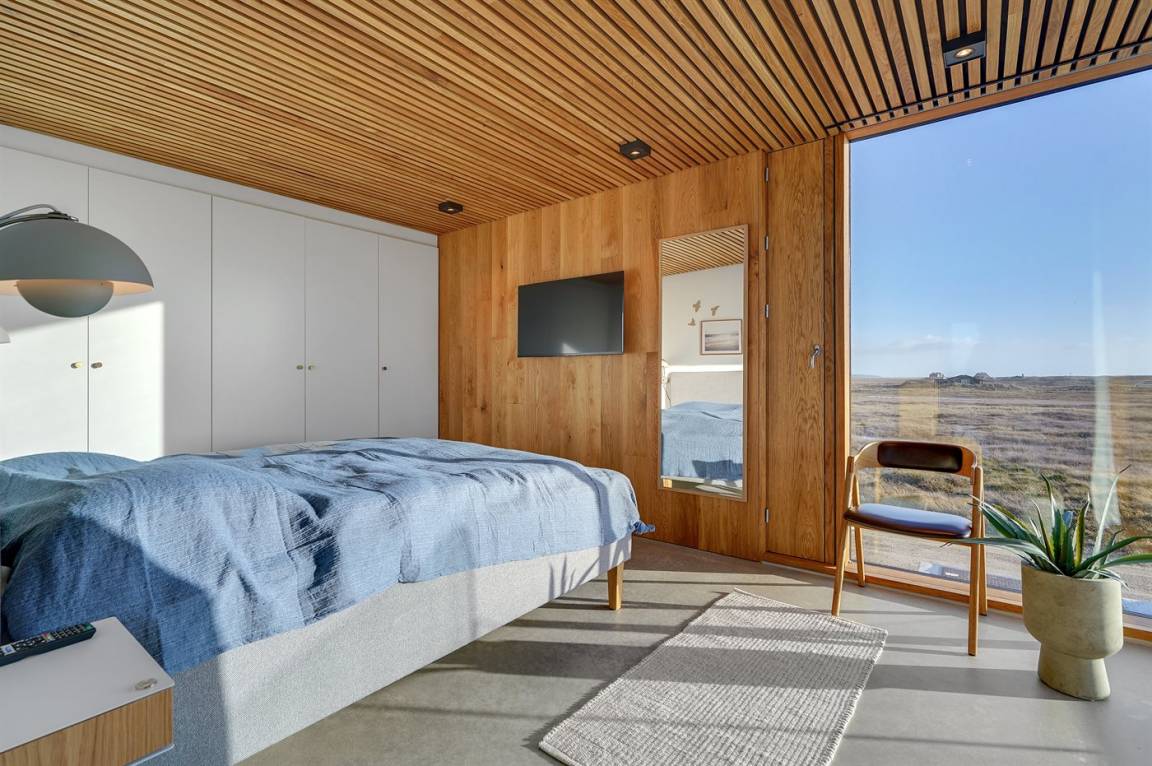 Die Innenräume des Hauses empfangen Sie mit hellen Wänden, Eichenholzdecken und -möbeln sowie mit modernen polierten Betonböden mit Fußbodenheizung. Das Haus hat zwei Stockwerke mit je 83 m² und verfügt über Eingangsbereich, Wohnzimmer/Küche, ein großes Schlafzimmer mit Stauraum, ein schönes Badezimmer mit Badewanne und Ausblick auf den Leuchtturm von Blåvand sowie das offene Land.