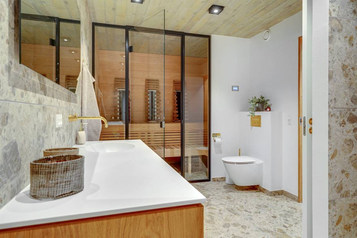Alle Schlafzimmer im Keller sowie das Wohnzimmer und der Aufenthaltsraum sind mit einem Smart-TV ausgestattet. In Wohnzimmer/Küche kann man es sich vor dem Kamin gemütlich machen. Abgesehen davon wird das Haus hauptsächlich mit einer energiesparenden Wärmepumpe beheizt.