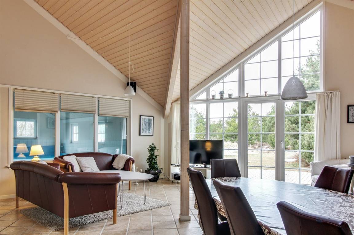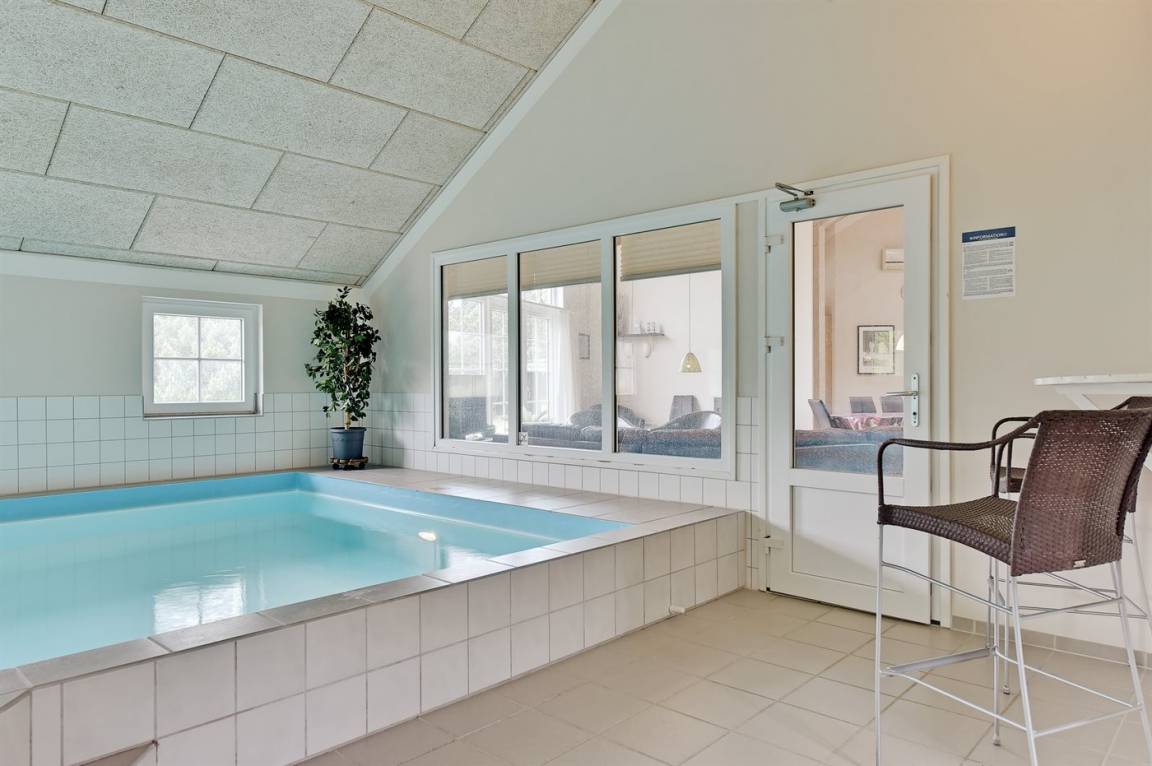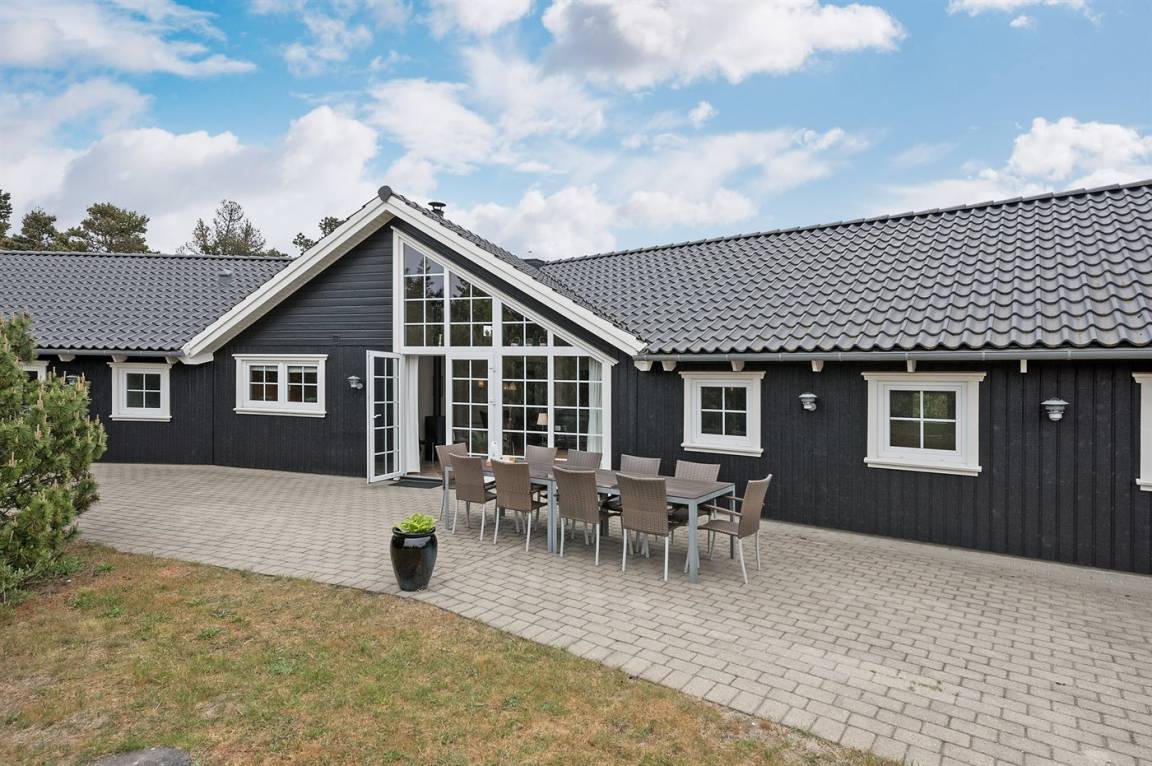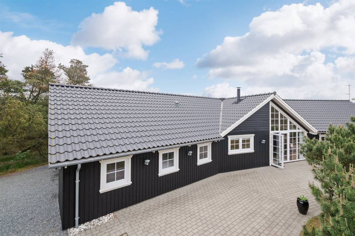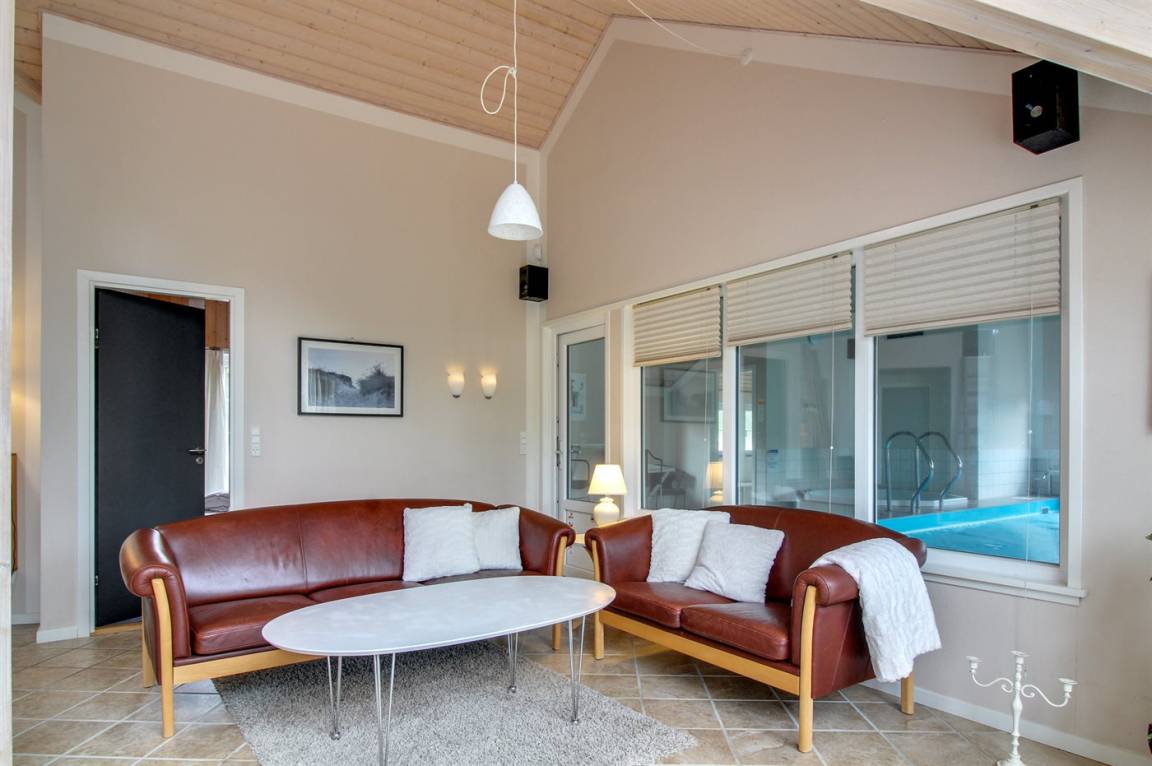 Dieses exklusive und einzigartige Ferienhaus aus Holz, 2008 gebaut, liegt auf einem großen Grundstück in einem kinderfreundlichen Gebiet ohne Verkehr. Schönes Terrassenareal mit Gartenmöbeln. Teils Holzwände, teils weiß verputzte Wände. Beheizbare Klinkerböden jedoch Teppichböden in den Zimmern und im offenen Obergeschoss. Die herrliche und gut ausgestattete Küche ist u. a. mit Geschirrspüler, Mikrowelle, Umluftofen, Herd mit Ceran-Feld sowie amerikanischer Kühlschrank mit 120 l Tiefkühlgerät und Eiswürfelmaschine. Die Küche ist mit dem ausgesprochen exklusiv eingerichtetem Wohnzimmer mit Essecke, die durch eine große Glaspyramide die auf dem Dach angebracht ist, erhellt. Das Wohnzimmer ist ferner mit Kaminofen, DVD-Spieler, Stereoanlage mit CD-Spieler und TV ausgestattet. Vom Wohnzimmer haben Sie ferner Zugang zur Pool-Abteilung mit Swimmingpool (3,4 x 6,4 1,45 m) mit Gegenstromanlage, schönem 6-Personen-Whirlpool (Standwasser), geräumige Sauna und Badezimmer mit Fußbodenheizung. 2 zusätzliche Badezimmer mit Duschnische und Fußbodenheizung. 5 Schlafzimmer; 3 mit Doppelbett (180 x 200 cm) und 2 mit je 2 Einzelbetten (80 x 200 cm). Ferner 2 offene Obergeschosse mit je einem Schlafplatz. An weiterer Ausstattung können Waschmaschine, Wäschetrockner und kostenlose, kabellose Internetverbindung (Computer ist mitzubringen) erwähnt werden. Ferner Kinderbett und Kinderhochstuhl sowie Sandkasten und Schaukel vorhanden. Großer Carport für 2 PKW's.