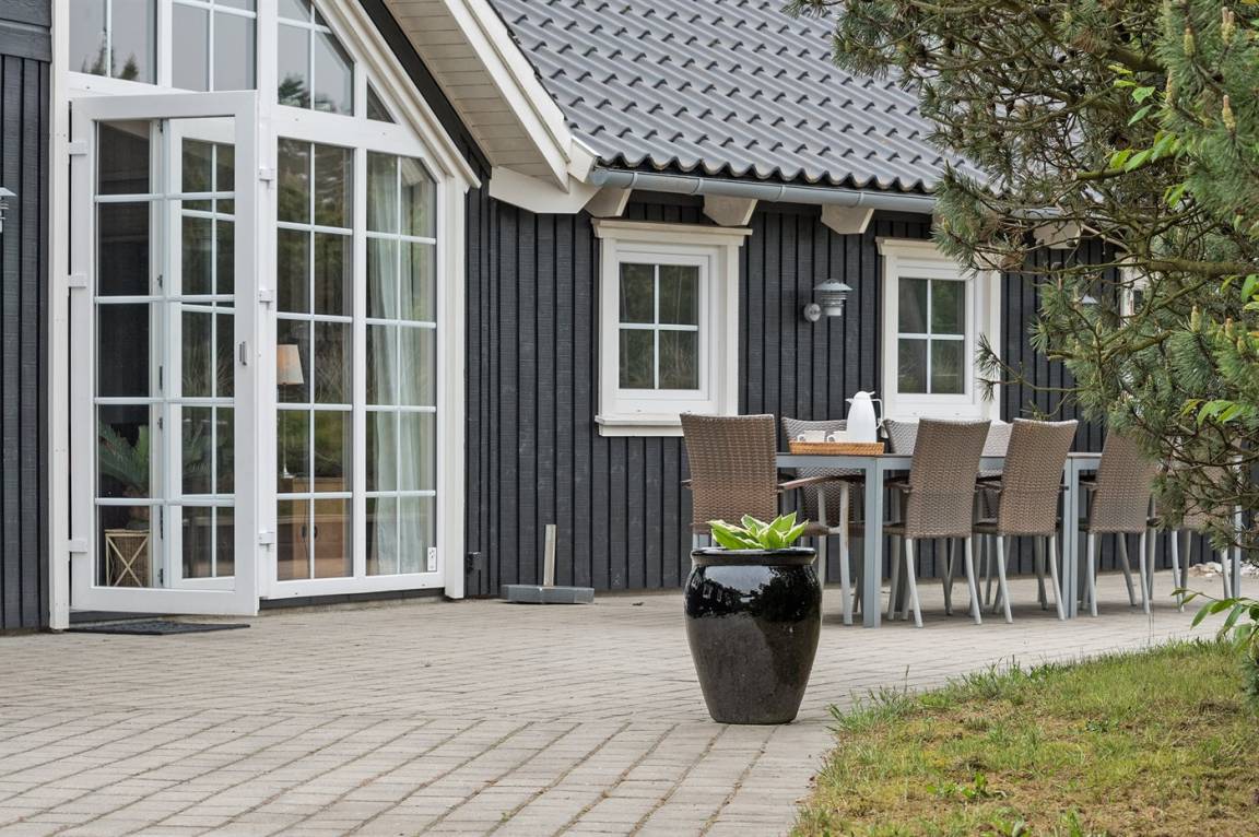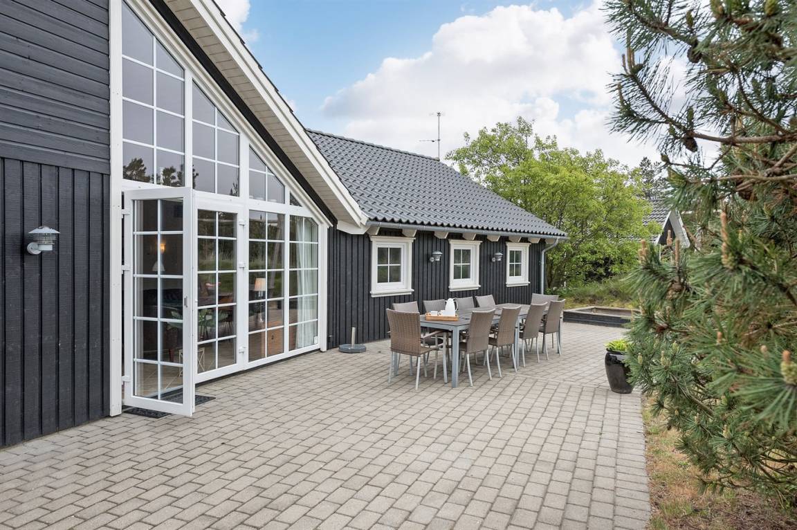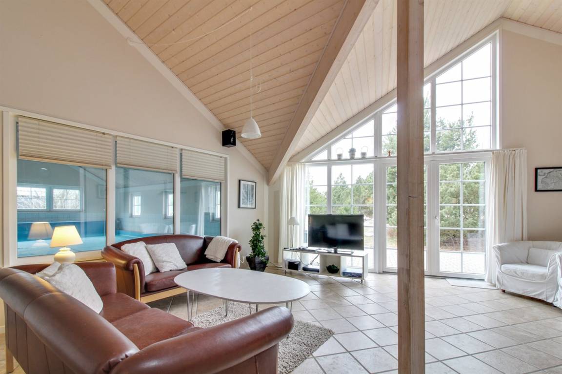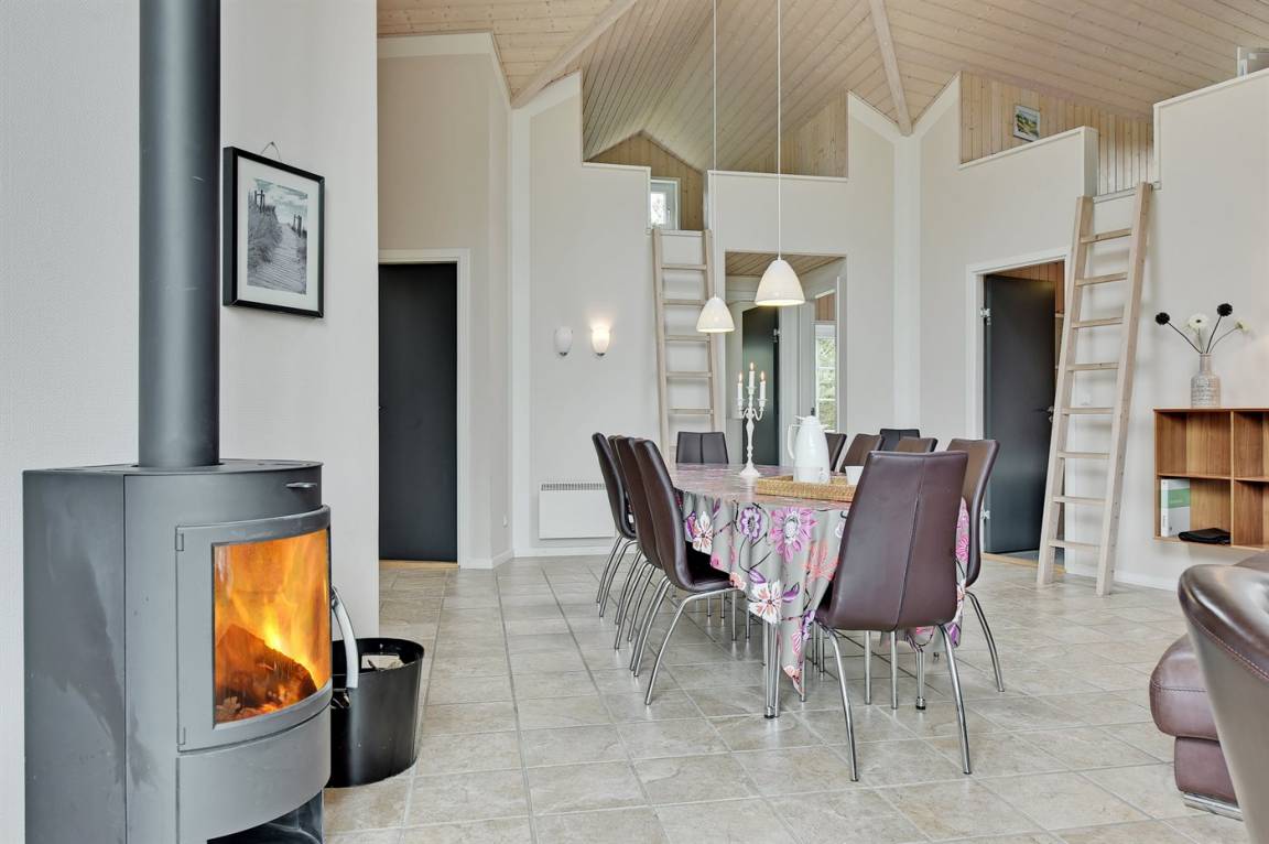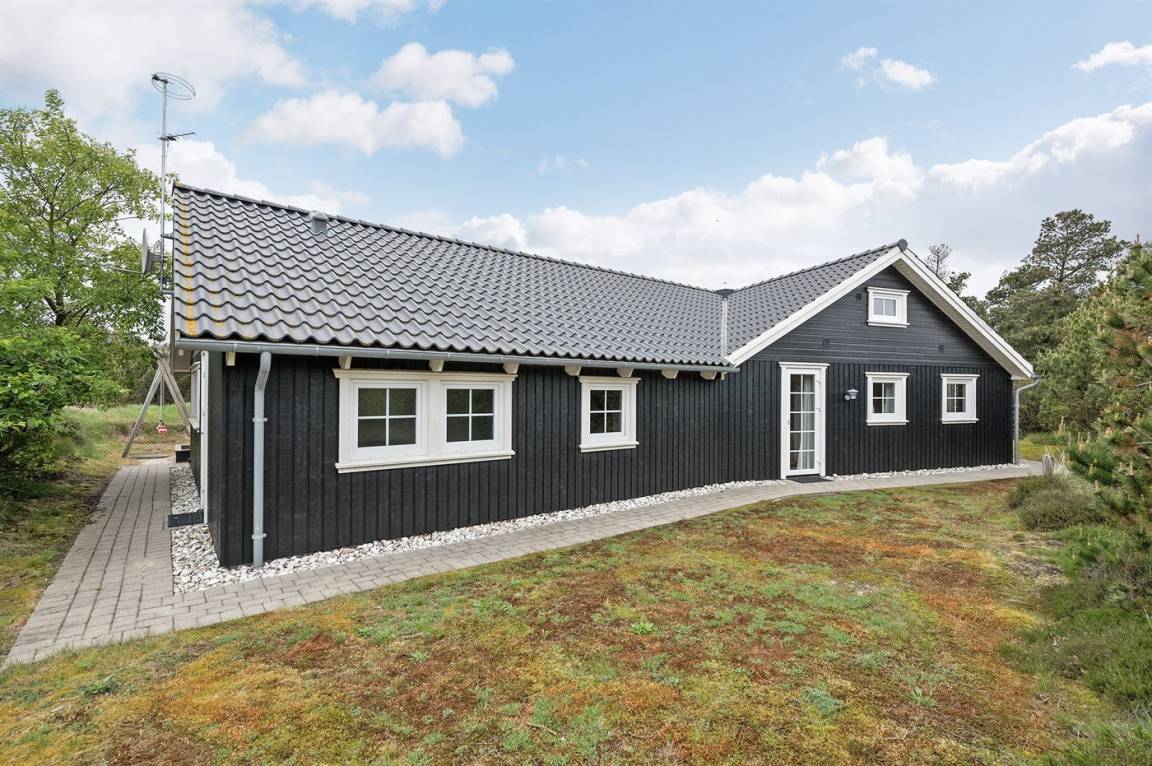 Dieses exklusive und einzigartige Ferienhaus aus Holz, 2008 gebaut, liegt auf einem großen Grundstück in einem kinderfreundlichen Gebiet ohne Verkehr. Schönes Terrassenareal mit Gartenmöbeln. Teils Holzwände, teils weiß verputzte Wände. Beheizbare Klinkerböden jedoch Teppichböden in den Zimmern und im offenen Obergeschoss. Die herrliche und gut ausgestattete Küche ist u. a. mit Geschirrspüler, Mikrowelle, Umluftofen, Herd mit Ceran-Feld sowie amerikanischer Kühlschrank mit 120 l Tiefkühlgerät und Eiswürfelmaschine. Die Küche ist mit dem ausgesprochen exklusiv eingerichtetem Wohnzimmer mit Essecke, die durch eine große Glaspyramide die auf dem Dach angebracht ist, erhellt. Das Wohnzimmer ist ferner mit Kaminofen, DVD-Spieler, Stereoanlage mit CD-Spieler und TV ausgestattet. Vom Wohnzimmer haben Sie ferner Zugang zur Pool-Abteilung mit Swimmingpool (3,4 x 6,4 1,45 m) mit Gegenstromanlage, schönem 6-Personen-Whirlpool (Standwasser), geräumige Sauna und Badezimmer mit Fußbodenheizung. 2 zusätzliche Badezimmer mit Duschnische und Fußbodenheizung. 5 Schlafzimmer; 3 mit Doppelbett (180 x 200 cm) und 2 mit je 2 Einzelbetten (80 x 200 cm). Ferner 2 offene Obergeschosse mit je einem Schlafplatz. An weiterer Ausstattung können Waschmaschine, Wäschetrockner und kostenlose, kabellose Internetverbindung (Computer ist mitzubringen) erwähnt werden. Ferner Kinderbett und Kinderhochstuhl sowie Sandkasten und Schaukel vorhanden. Großer Carport für 2 PKW's.
