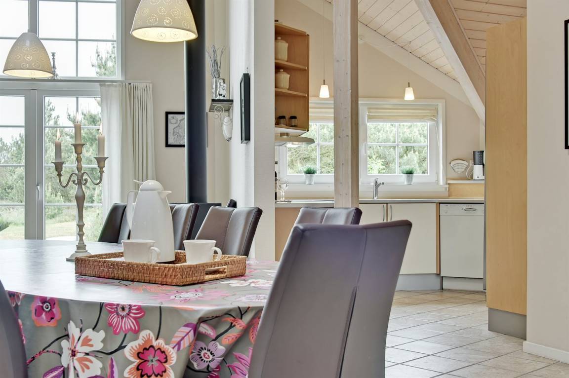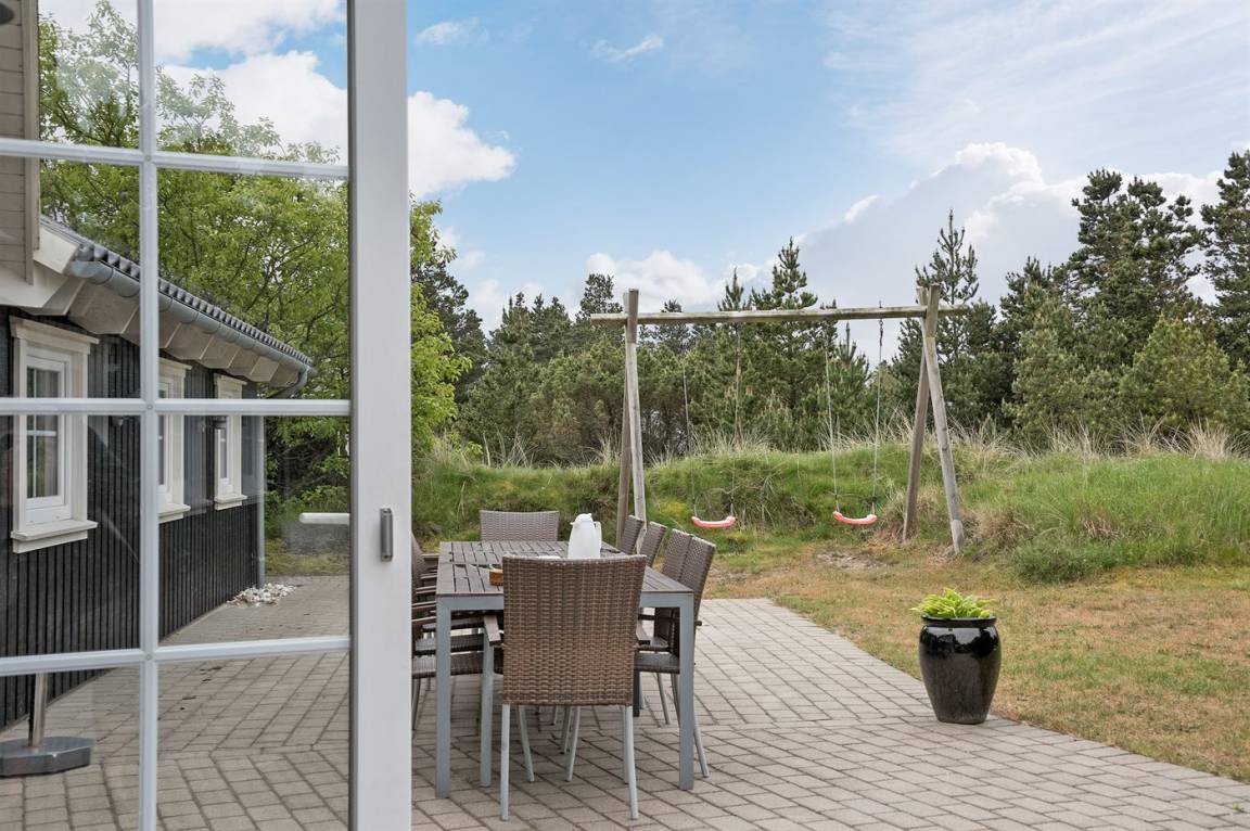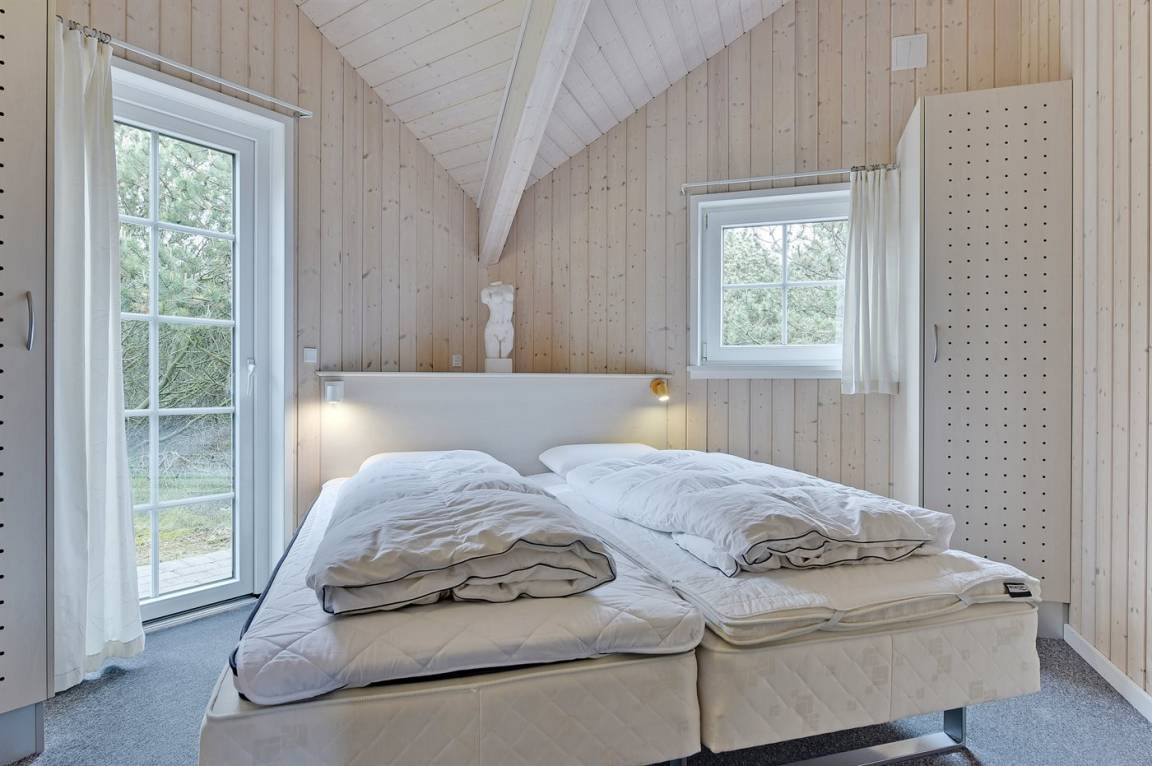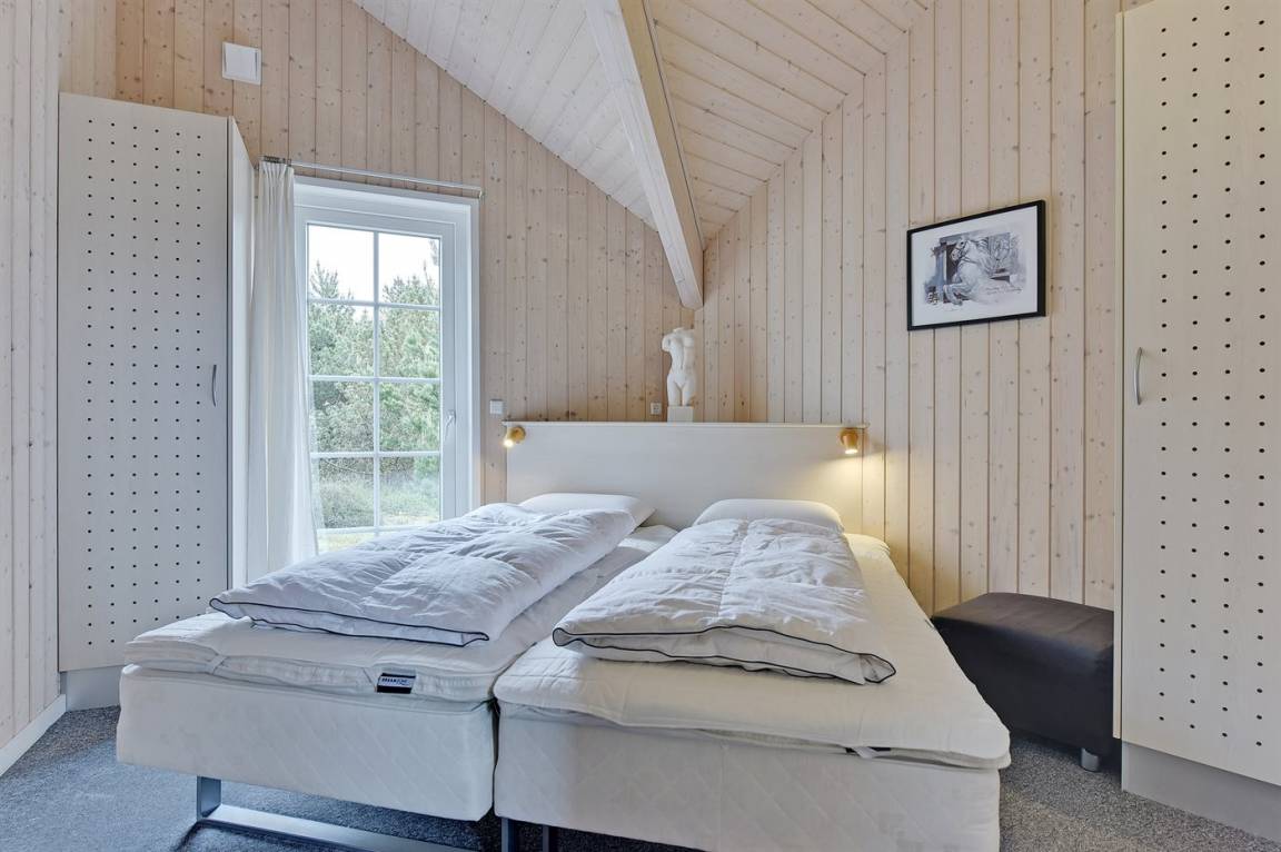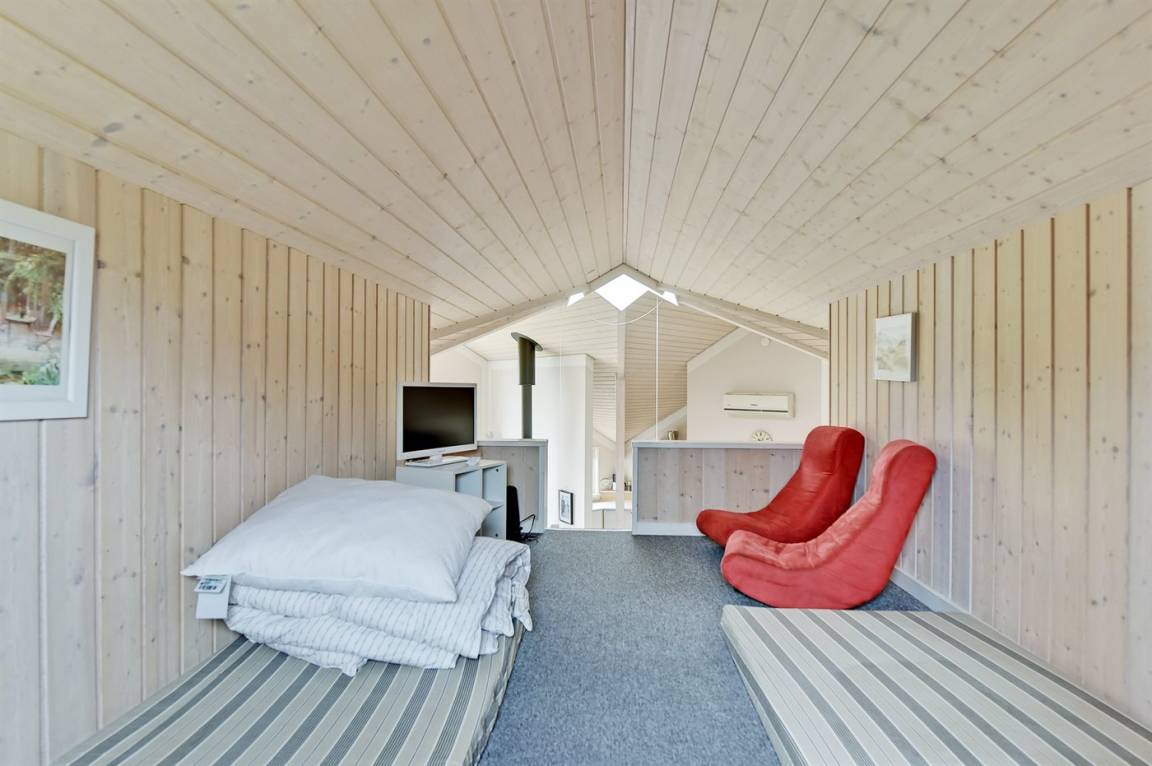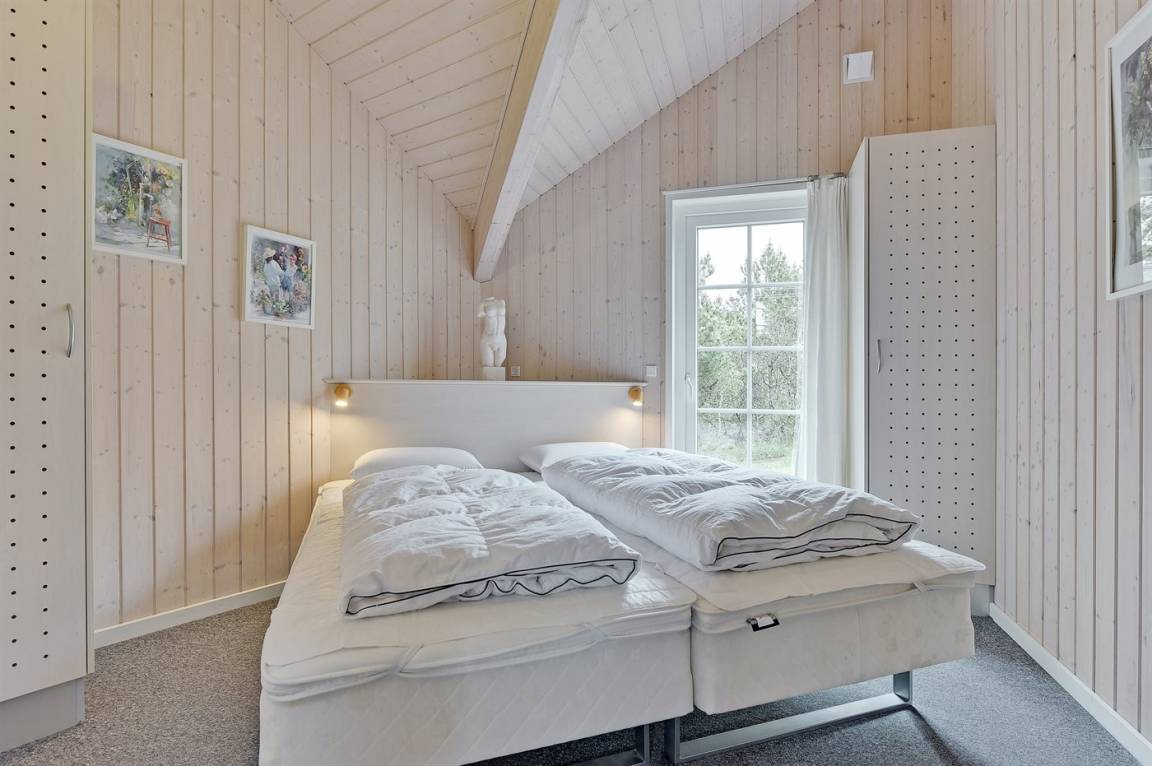 Dieses exklusive und einzigartige Ferienhaus aus Holz, 2008 gebaut, liegt auf einem großen Grundstück in einem kinderfreundlichen Gebiet ohne Verkehr. Schönes Terrassenareal mit Gartenmöbeln. Teils Holzwände, teils weiß verputzte Wände. Beheizbare Klinkerböden jedoch Teppichböden in den Zimmern und im offenen Obergeschoss. Die herrliche und gut ausgestattete Küche ist u. a. mit Geschirrspüler, Mikrowelle, Umluftofen, Herd mit Ceran-Feld sowie amerikanischer Kühlschrank mit 120 l Tiefkühlgerät und Eiswürfelmaschine. Die Küche ist mit dem ausgesprochen exklusiv eingerichtetem Wohnzimmer mit Essecke, die durch eine große Glaspyramide die auf dem Dach angebracht ist, erhellt. Das Wohnzimmer ist ferner mit Kaminofen, DVD-Spieler, Stereoanlage mit CD-Spieler und TV ausgestattet. Vom Wohnzimmer haben Sie ferner Zugang zur Pool-Abteilung mit Swimmingpool (3,4 x 6,4 1,45 m) mit Gegenstromanlage, schönem 6-Personen-Whirlpool (Standwasser), geräumige Sauna und Badezimmer mit Fußbodenheizung. 2 zusätzliche Badezimmer mit Duschnische und Fußbodenheizung. 5 Schlafzimmer; 3 mit Doppelbett (180 x 200 cm) und 2 mit je 2 Einzelbetten (80 x 200 cm). Ferner 2 offene Obergeschosse mit je einem Schlafplatz. An weiterer Ausstattung können Waschmaschine, Wäschetrockner und kostenlose, kabellose Internetverbindung (Computer ist mitzubringen) erwähnt werden. Ferner Kinderbett und Kinderhochstuhl sowie Sandkasten und Schaukel vorhanden. Großer Carport für 2 PKW's.