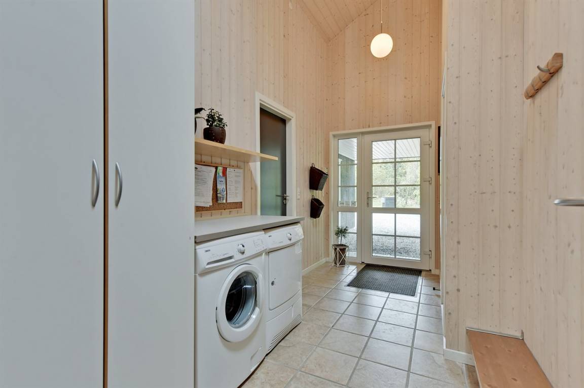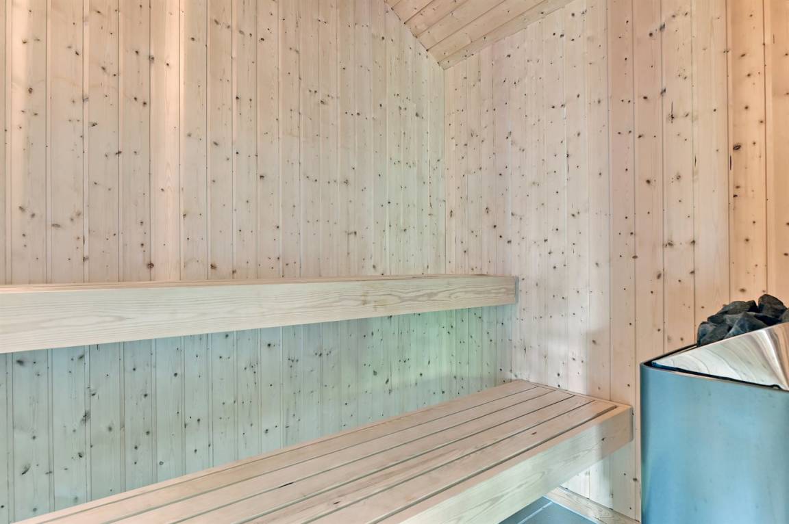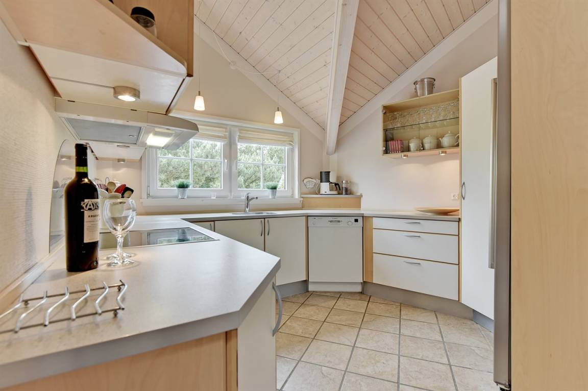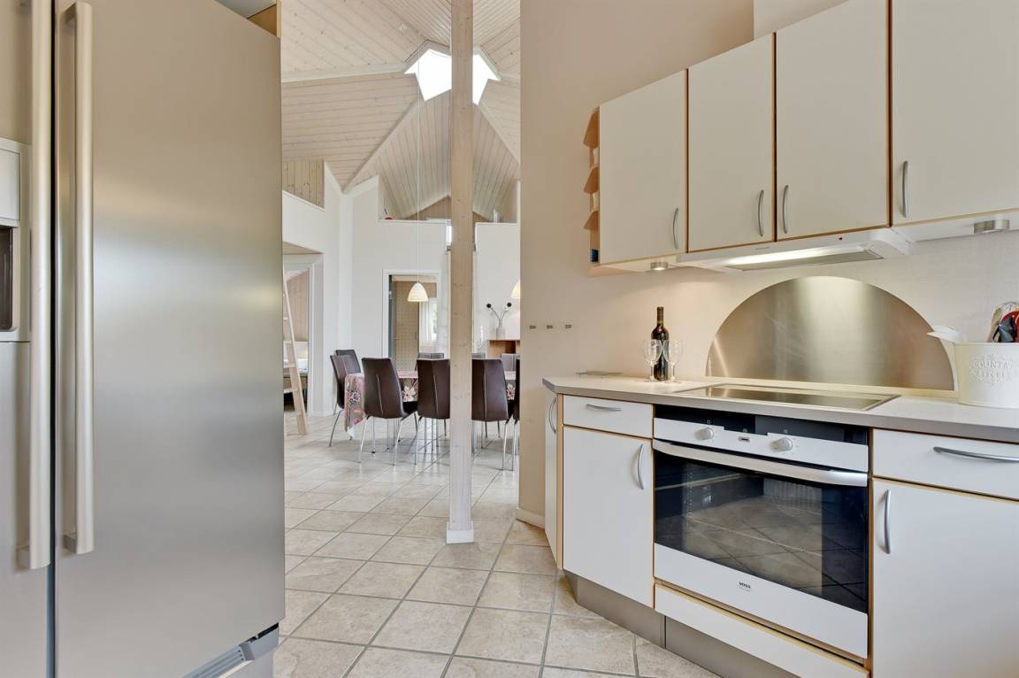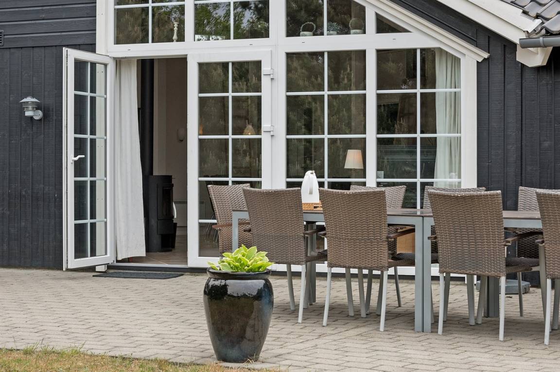 Dieses exklusive und einzigartige Ferienhaus aus Holz, 2008 gebaut, liegt auf einem großen Grundstück in einem kinderfreundlichen Gebiet ohne Verkehr. Schönes Terrassenareal mit Gartenmöbeln. Teils Holzwände, teils weiß verputzte Wände. Beheizbare Klinkerböden jedoch Teppichböden in den Zimmern und im offenen Obergeschoss. Die herrliche und gut ausgestattete Küche ist u. a. mit Geschirrspüler, Mikrowelle, Umluftofen, Herd mit Ceran-Feld sowie amerikanischer Kühlschrank mit 120 l Tiefkühlgerät und Eiswürfelmaschine. Die Küche ist mit dem ausgesprochen exklusiv eingerichtetem Wohnzimmer mit Essecke, die durch eine große Glaspyramide die auf dem Dach angebracht ist, erhellt. Das Wohnzimmer ist ferner mit Kaminofen, DVD-Spieler, Stereoanlage mit CD-Spieler und TV ausgestattet. Vom Wohnzimmer haben Sie ferner Zugang zur Pool-Abteilung mit Swimmingpool (3,4 x 6,4 1,45 m) mit Gegenstromanlage, schönem 6-Personen-Whirlpool (Standwasser), geräumige Sauna und Badezimmer mit Fußbodenheizung. 2 zusätzliche Badezimmer mit Duschnische und Fußbodenheizung. 5 Schlafzimmer; 3 mit Doppelbett (180 x 200 cm) und 2 mit je 2 Einzelbetten (80 x 200 cm). Ferner 2 offene Obergeschosse mit je einem Schlafplatz. An weiterer Ausstattung können Waschmaschine, Wäschetrockner und kostenlose, kabellose Internetverbindung (Computer ist mitzubringen) erwähnt werden. Ferner Kinderbett und Kinderhochstuhl sowie Sandkasten und Schaukel vorhanden. Großer Carport für 2 PKW's.
