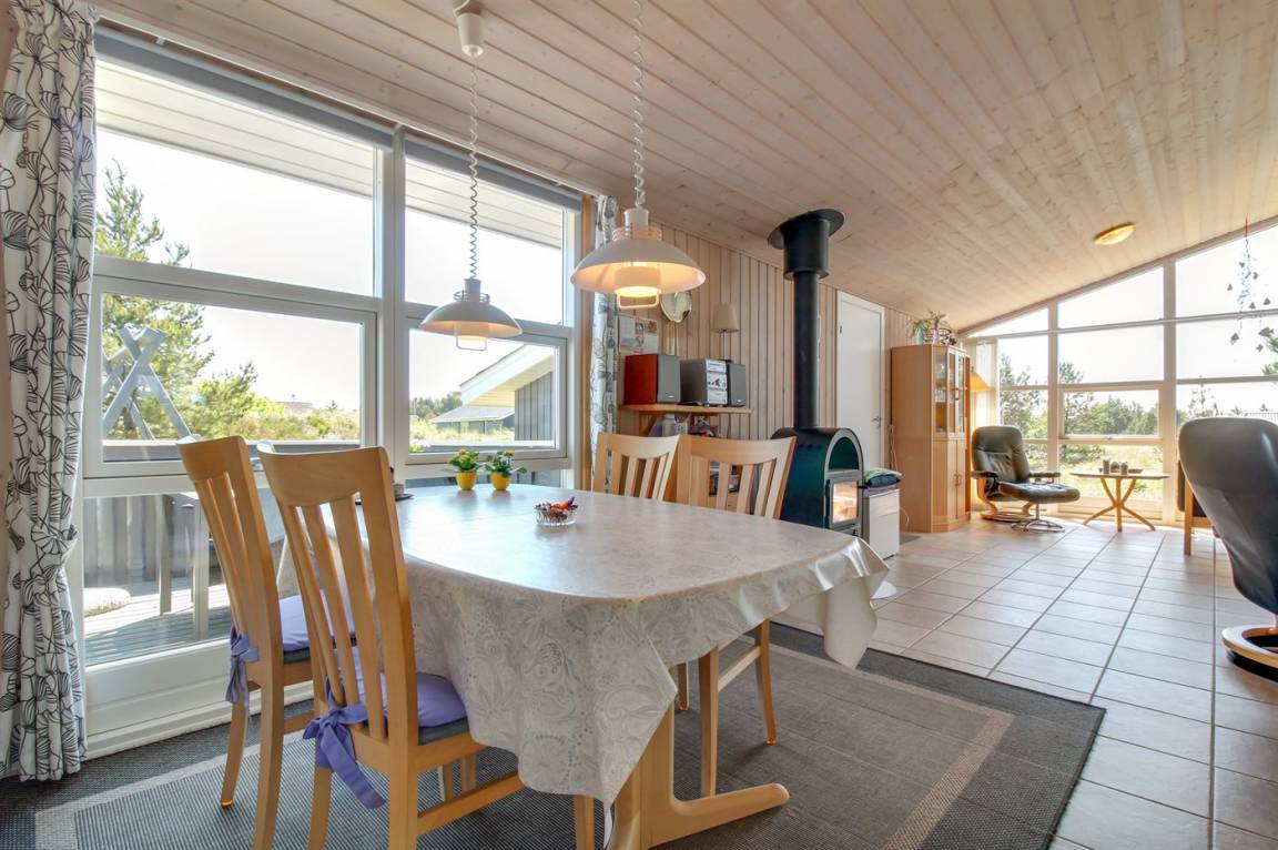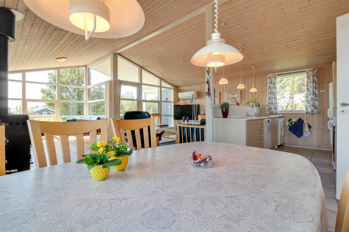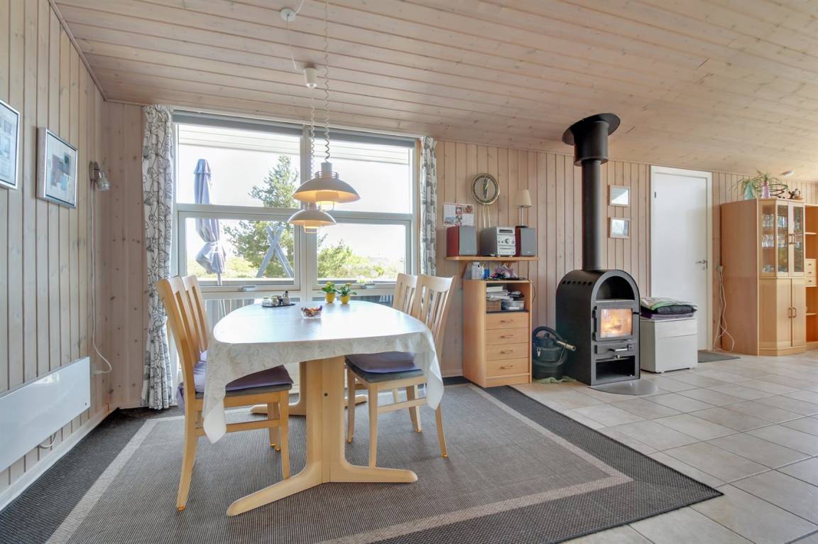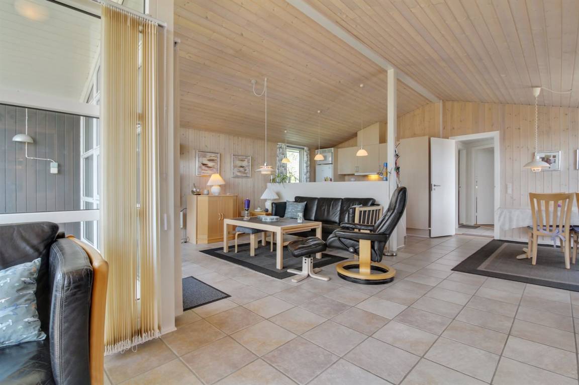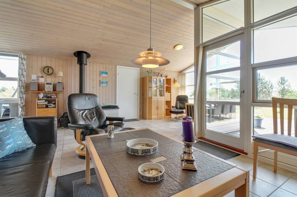 Dieses gemütliche Ferienhaus aus Holz, 1976 gebaut und 2007 renoviert, finden Sie auf einem leicht hügeligen Naturgrundstück mit Gras. Zum Haus gehören sowohl eine offene als auch eine teilweise überdachte Terrassenfläche mit Gartenmöbeln sowie Sandkiste und Schaukel für die Kinder. Innen gibt es Holzwände, hell gebeizte Holzdecken und rustikale Klinkerböden mit Brücken überall. Im Wohnzimmer, das nett möbliert ist, gibt es einen schönen Kaminofen, Stereoanlage mit CD-Spieler, DVD-Spieler und Kabel-TV. Ferner kostenlose, kabellose Internetverbindung vorhanden (Computer ist mitzubringen). Die Küche ist mit Mikrowelle, Geschirrspüler, Waschmaschine sowie Herd mit Umluftofen und Ceran-Feld ausgestattet. Ferner enthält das Haus 3 Schlafzimmer mit je 1 Doppelbett und ein großes Badezimmer mit Duschnische und Fußbodenheizung. Es ist eine energiebesparende Wärmepumpe installiert. Kinderbett und 2 Kinderhochstühle für die Kinder. Das ganze Jahr hindurch ein gutes Ferienhaus.