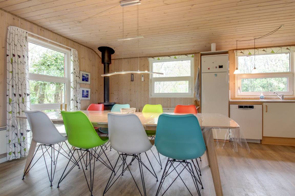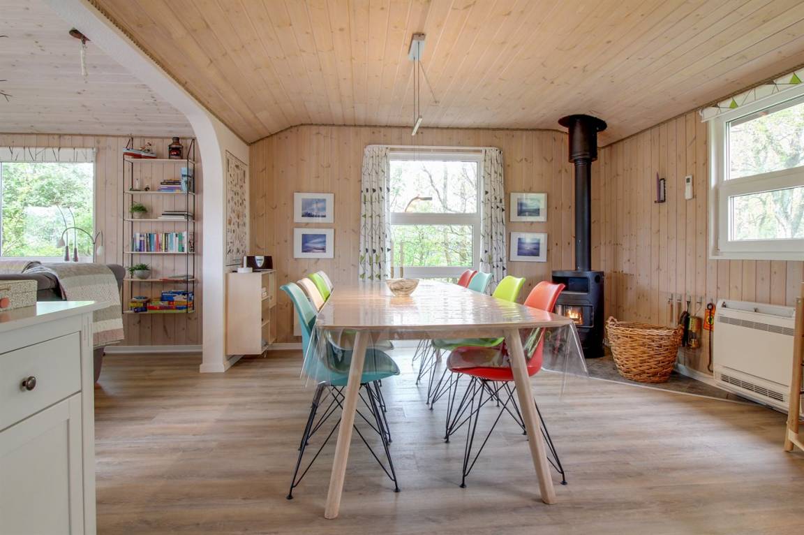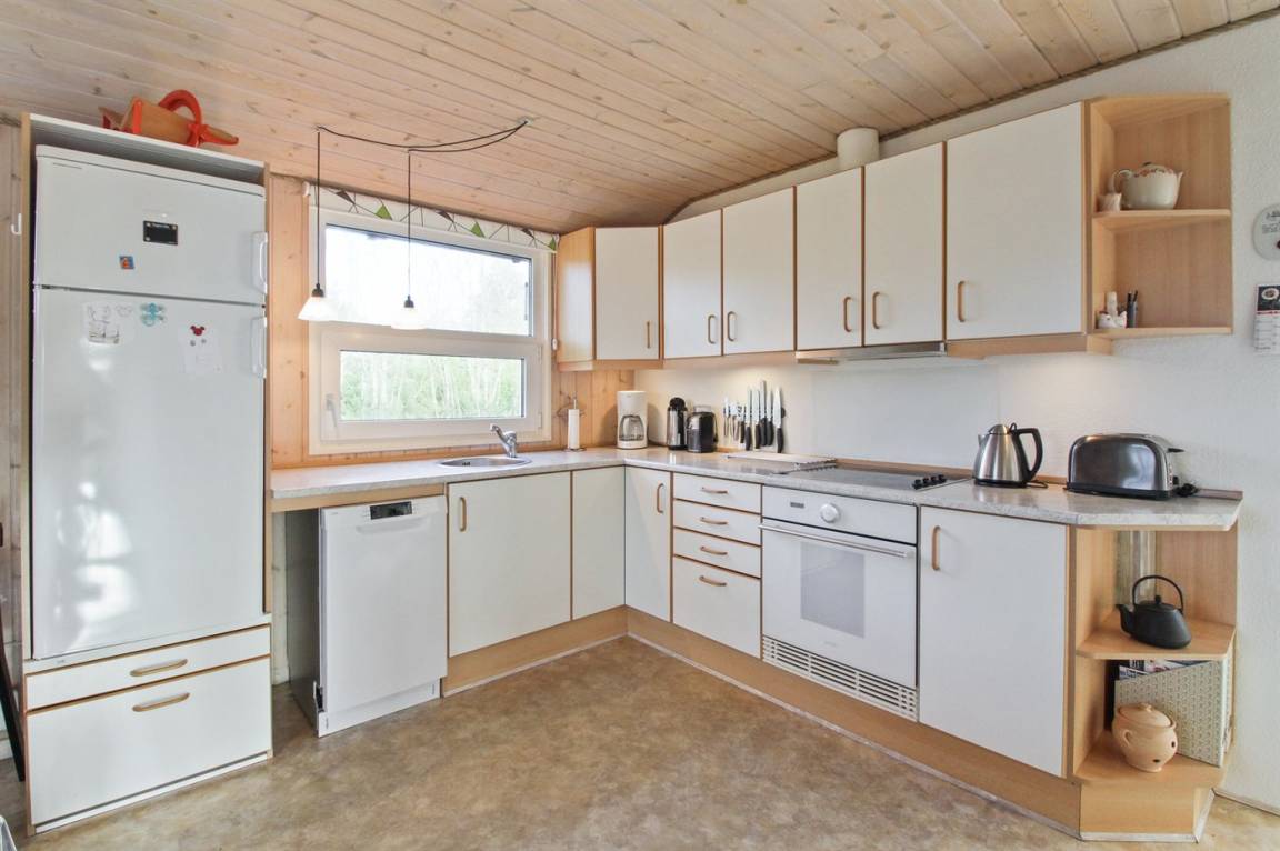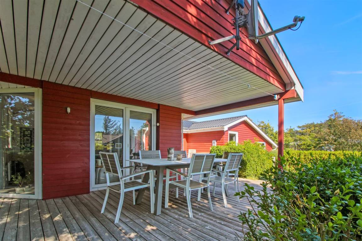 Dieses schöne Ferienhaus aus Holz, 2001 renoviert, liegt auf einem Naturgrundstück mit Gras, das von Bäumen und Hagebuttensträuchern umgeben ist - nur 250 m vom herrlichen Sandstrand entfernt. Zum Haus gehört sowohl offene als auch überdachte Terrasse mit Gartenmöbeln. Innen gibt es teils Holzböden, teils PVC-Böden und teils Teppich. Holzwände und -decken. Badezimmer mit Duschnische, Waschmaschine und Wäschetrockner. Gut ausgestattete Küche mit Tiefkühlgerät, Umluftofen, Mikrowelle, Geschirrspüler und Herd mit Ceran-Feld. Großes gemütliches Wohnzimmer, in dem Sie u. a. Kaminofen, TV mit Satellitenanschluss und Radio mit CD-Spieler finden. Ferner kostenlose, kabellose Internetverbindung vorhanden (Computer ist mitzubringen). Für die jüngsten Feriengäste steht ein Kinderhochstuhl zur Verfügung. Ein gut gelegenes Ferienhaus der Sonderklasse dicht an Sand und Wasser.