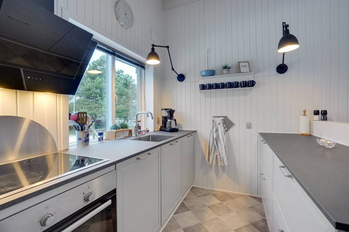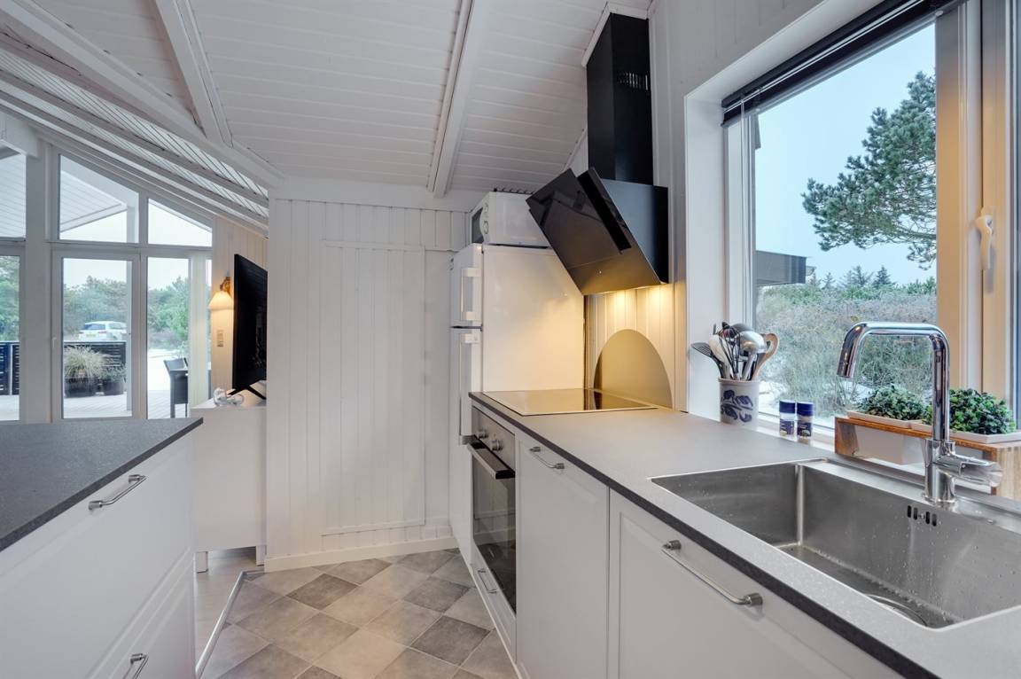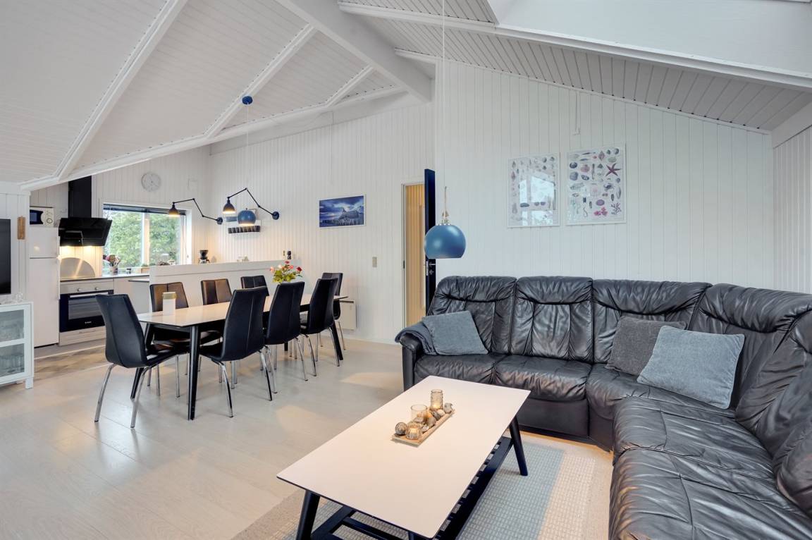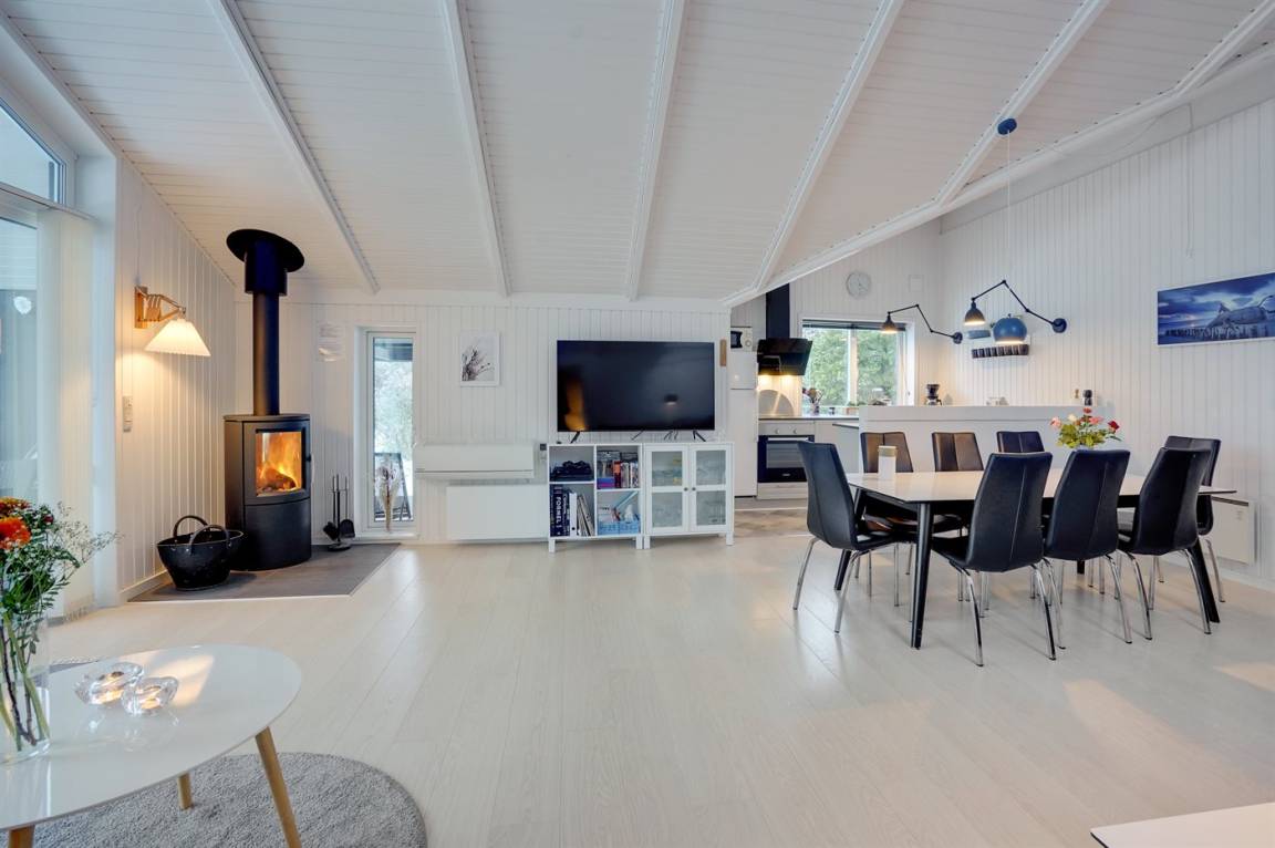 Die helle Küche ist mit dem Wohnzimmer kombiniert und u. a. mit Geschirrspüler, Kühlschrank, Tiefkühlmöglichkeit mit 40 Liter Nutzinhalt, Mikrowelle, 4 elektrische Kochplatten und Umluftofen ausgestattet. Im nett möblierten Wohnzimmer, mit Ausgang zu der überdachten Terrasse, finden Sie Kaminofen, 49" Fernseher, Chromecast, Playstation4, Bluetooth-Lautsprecher, DVD-Player, Radio und CD-Player. Mindestens 4 dänische, 1-3 schwedische, 1-3 norwegische und 1-3 deutsche Fernsehsender.