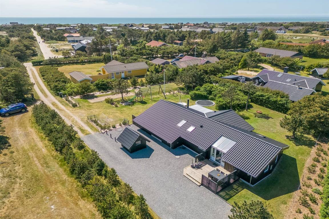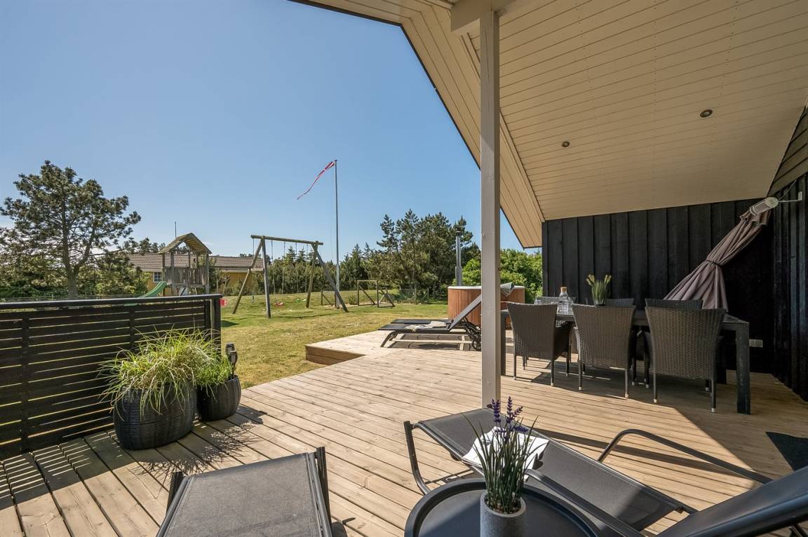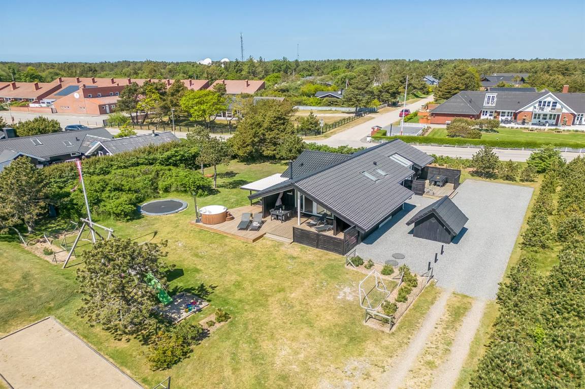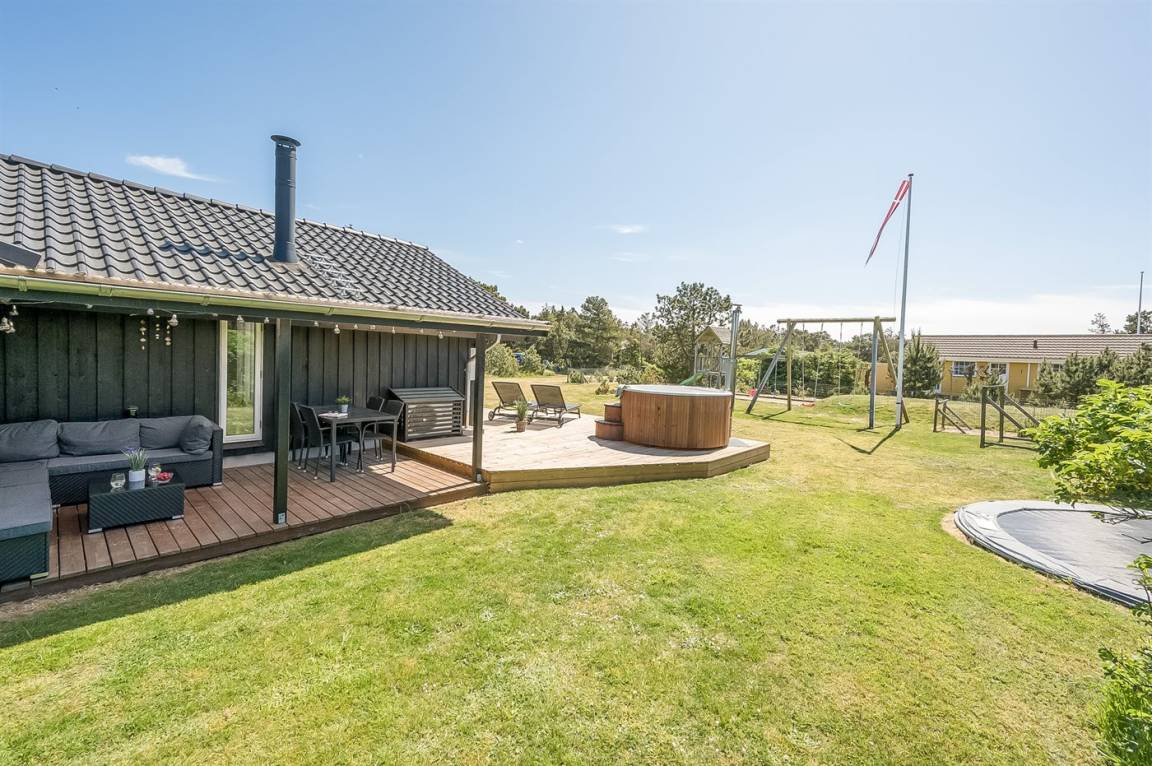 In dem beliebten Feriengebiet Blåvand, nur 300 m von dem schönen Badestrand entfernt liegt dieses nette Ferienhaus auf einem großen Naturgrundstück. Zum Haus gehören 2 in versetzter Ebene liegende und zum Teil überdachte Terrassen mit Gartenmöbeln, Grill und Hot Tub für 6 Personen. Auf dem Grundstück, wo sich die Kinder so richtig tummeln können, gibt es Schaukel, Sandkasten, Trampolin, Spielgerüst und Fußballtor sowie Petanquebahn. Außerdem stehen ein Fahrradschuppen und 2 Fahrräder zur Verfügung.