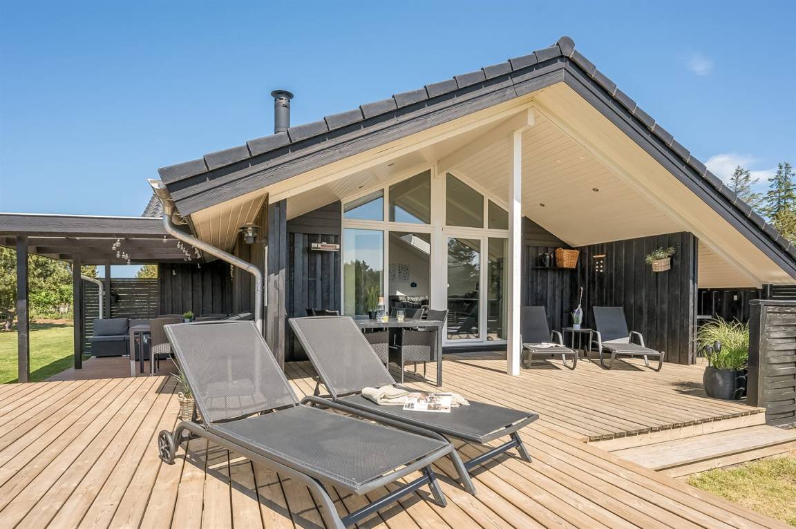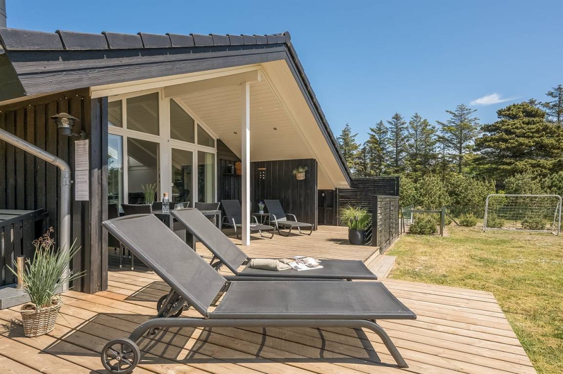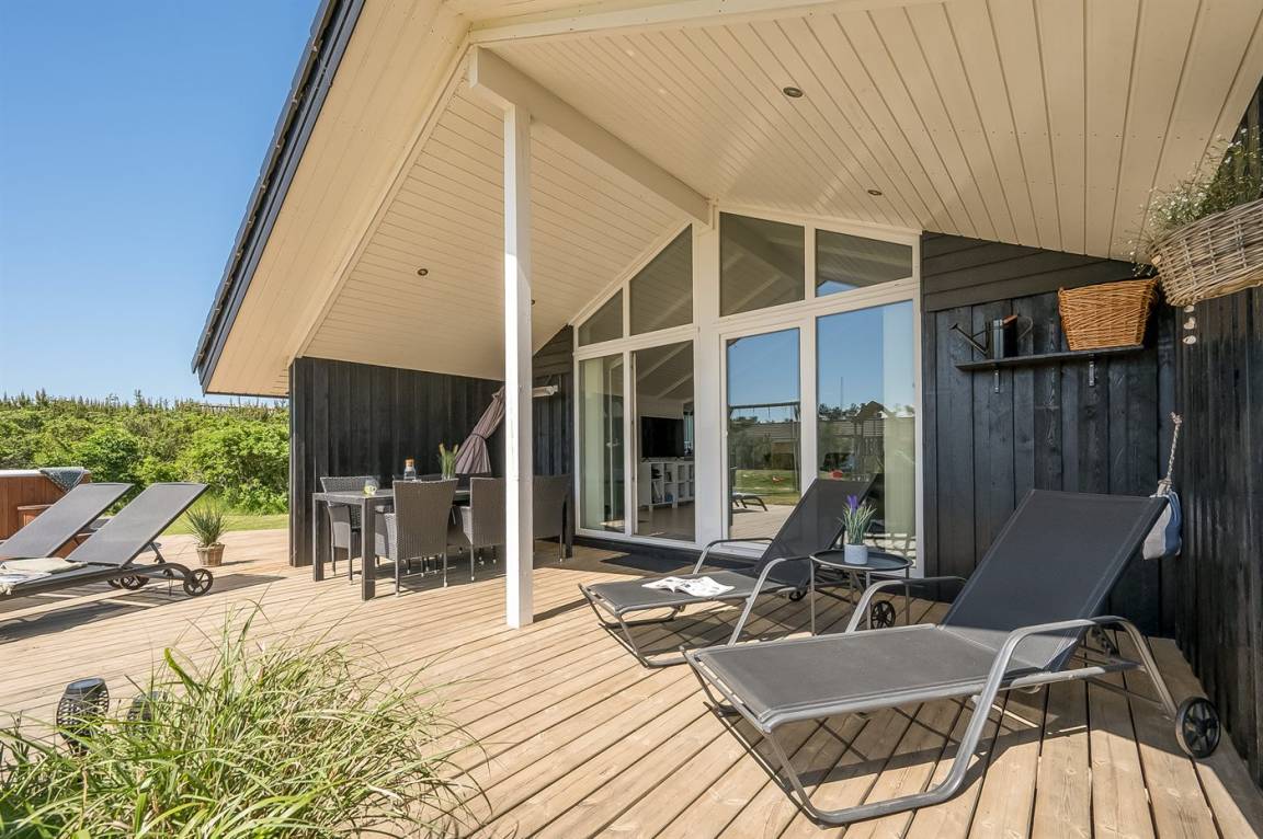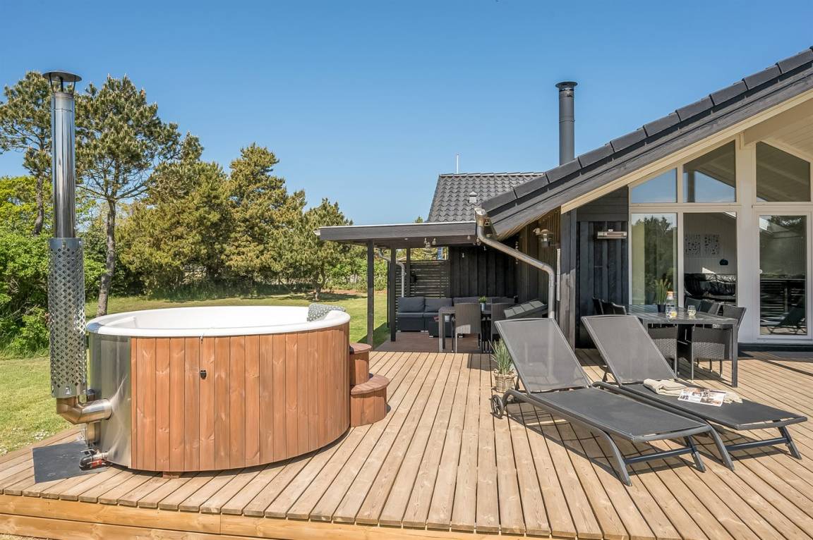 In dem beliebten Feriengebiet Blåvand, nur 300 m von dem schönen Badestrand entfernt liegt dieses nette Ferienhaus auf einem großen Naturgrundstück. Zum Haus gehören 2 in versetzter Ebene liegende und zum Teil überdachte Terrassen mit Gartenmöbeln, Grill und Hot Tub für 6 Personen. Auf dem Grundstück, wo sich die Kinder so richtig tummeln können, gibt es Schaukel, Sandkasten, Trampolin, Spielgerüst und Fußballtor sowie Petanquebahn. Außerdem stehen ein Fahrradschuppen und 2 Fahrräder zur Verfügung.