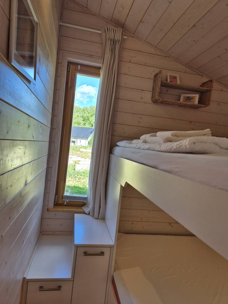 1 Schlafzimmer mit Doppelhochbett (2-mal 150x200m) und reichlich Stauraum sowie 1 Schlafsofa im Wohnbereich.