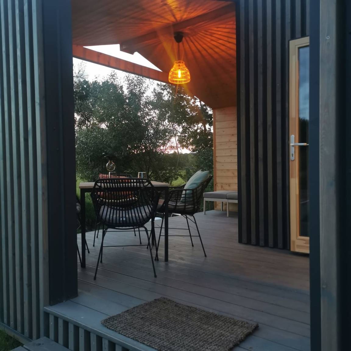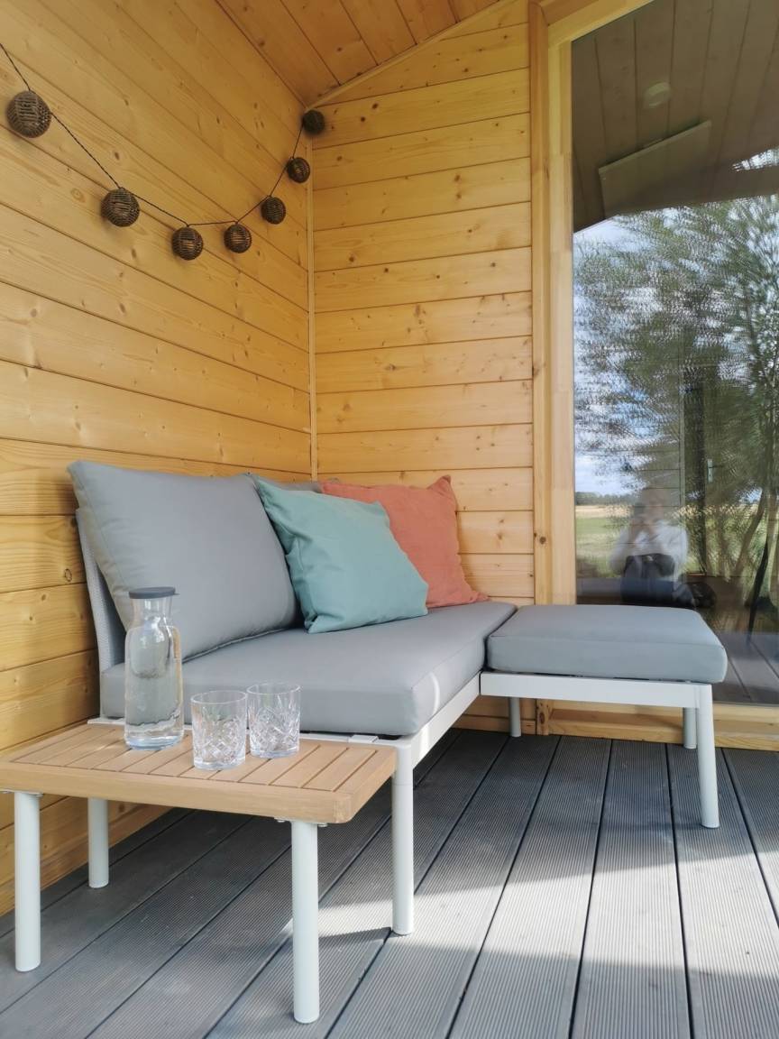 Die überdachte Veranda (+ 10qm) lädt dazu ein mit einem Kaffee oder Tee in den Tag zu starten oder ihn gemütlich mit einem Blick aufs weite Feld ausklingen zu lassen. Der besondere Clou des Grundrisses: Durch die abgesetzte Veranda kann noch eine weitere Terrasse (+ 5qm) als Erweiterung des Außenbereichs genutzt werden, während der Einschnitt im Dach Sonne ins Innere von Horst bringt. Das Haus ist von einem kleinen Garten umgeben, in mit man z.B. in der Hängematte entspannen oder abends an der Feuerschale sitzen kann.