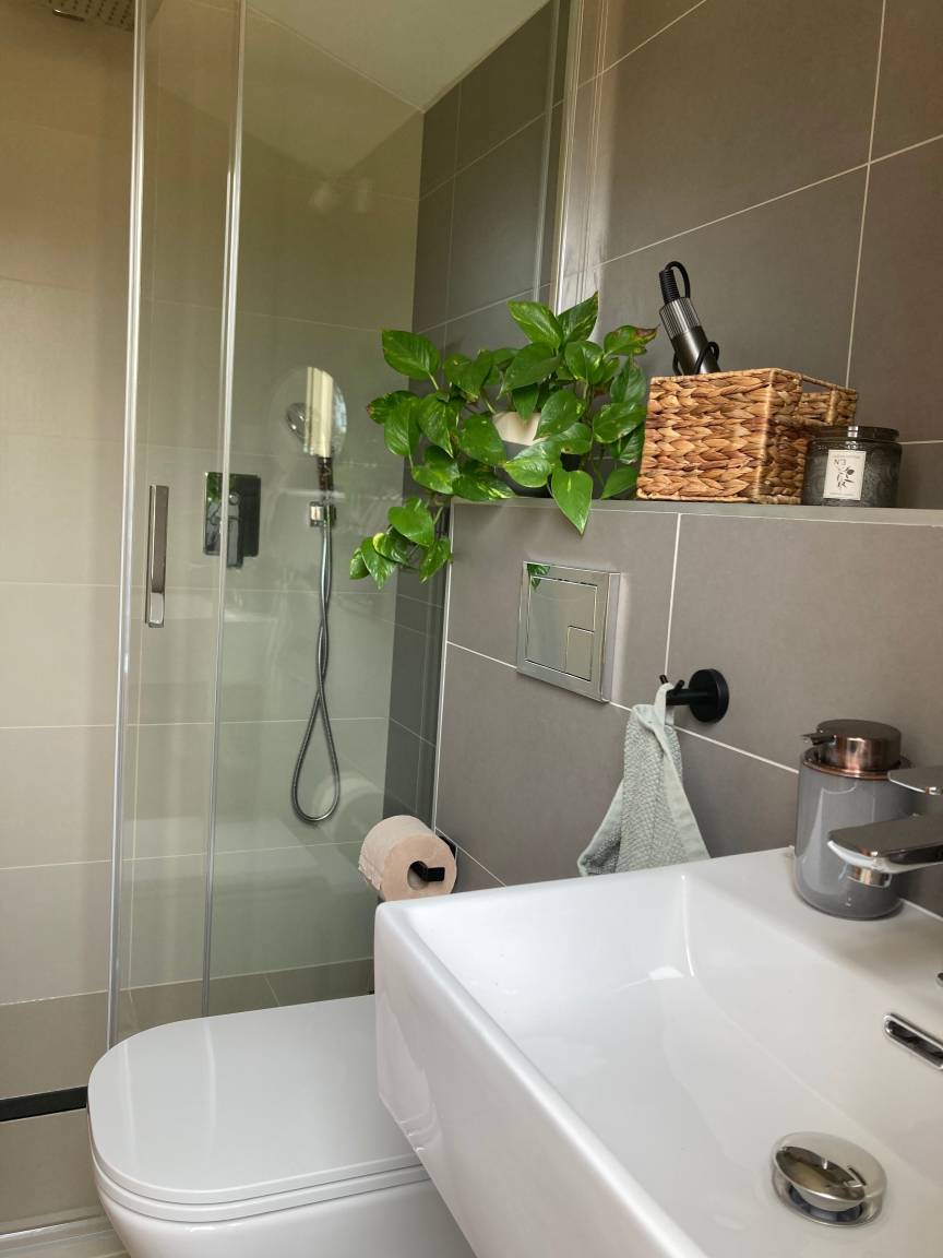 Badezimmer: Dusche mit Regenduschkopf, WC, Fußbodenheizung, Tageslicht, Fön