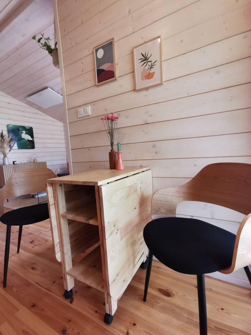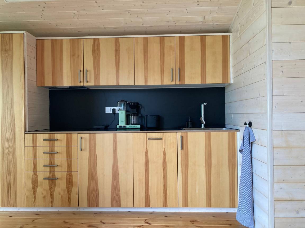 Offene Küche: Ausklappbarer Esstisch mit 4 Stühlen, Panoramablick nach draußen, Induktionskochfeld (2 Platten), Kühlschrank mit Frostfach, Kaffeemaschine, Geschirrspüler, Wasserkocher, Geschirr und Utensilien für 4 Personen