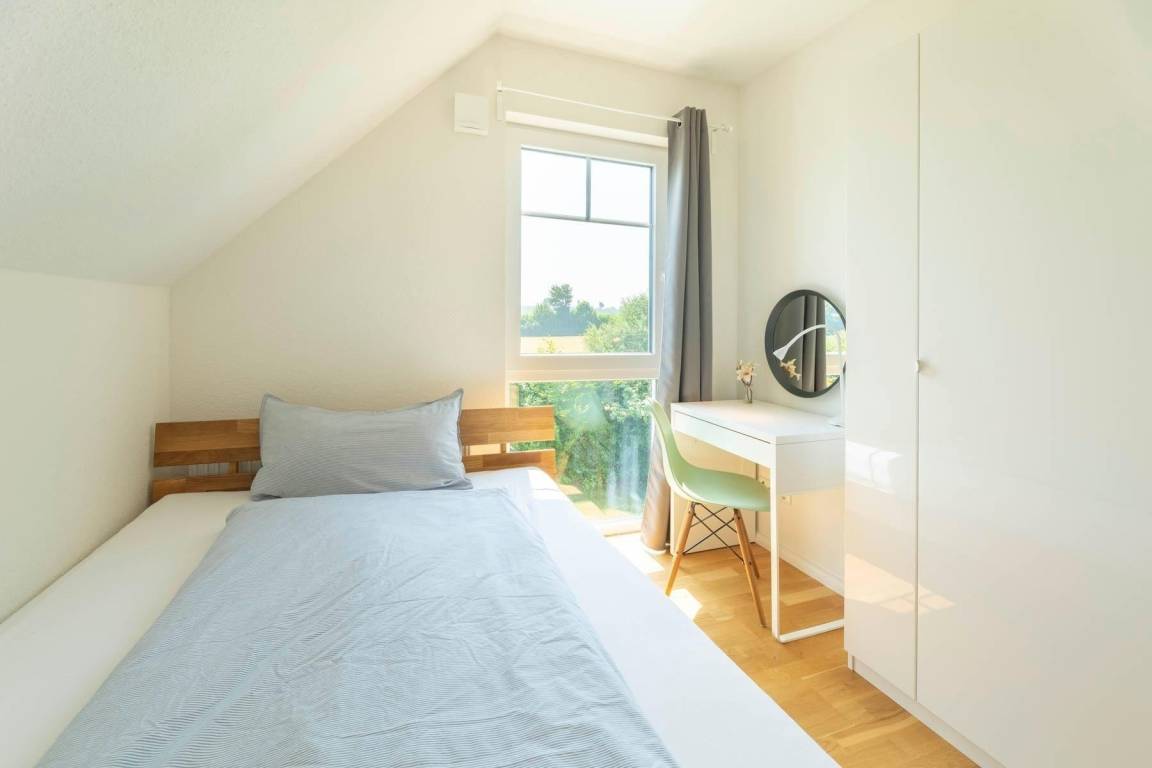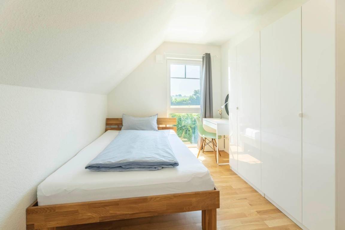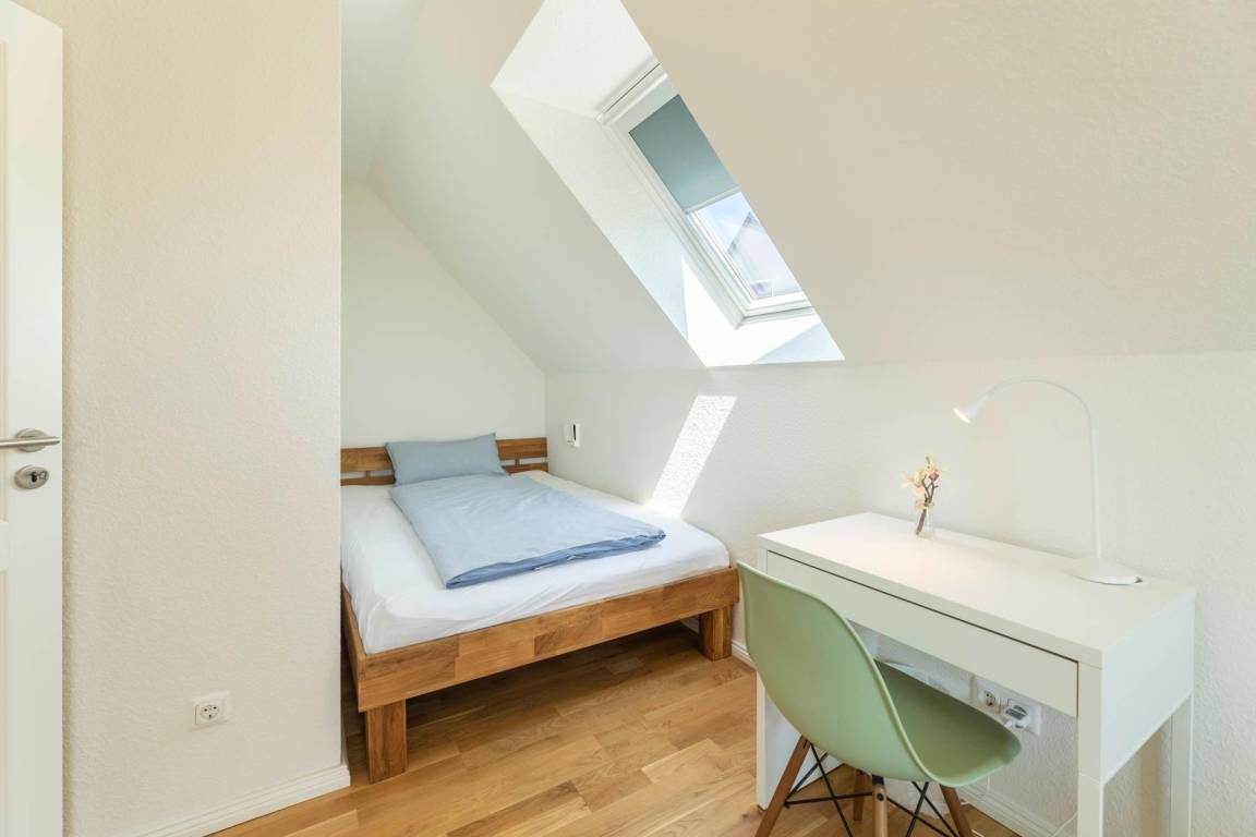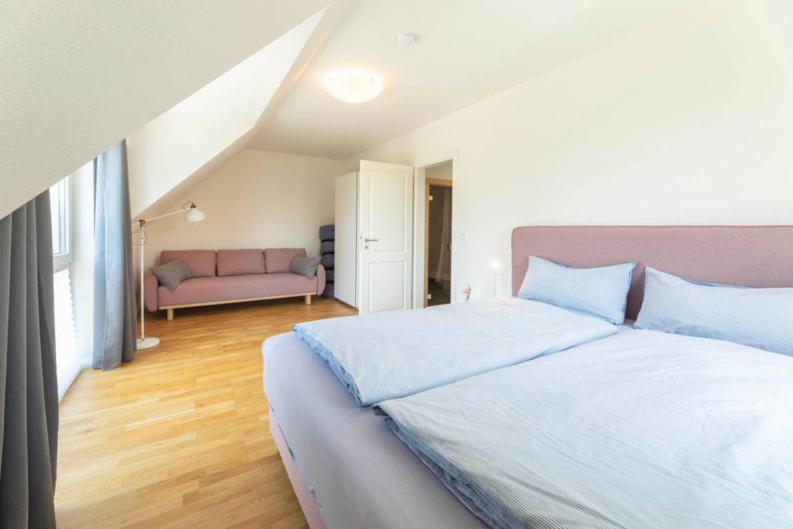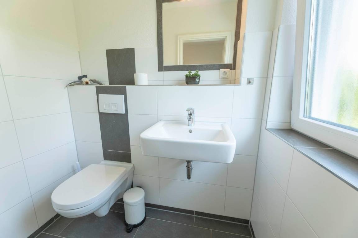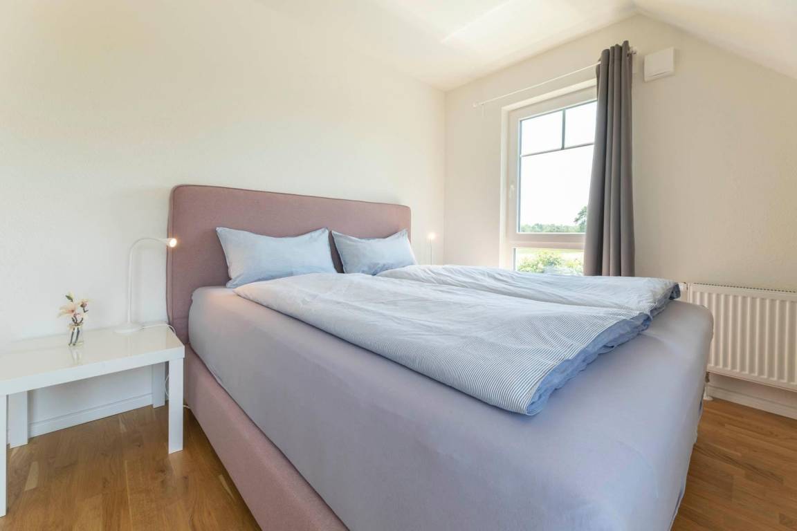 Es stehen zwei Schlafzimmer zur Verfügung: eines mit einem Doppelbett (180x200) und einer Ausziehcouch sowie ein weiteres mit zwei Einzelbetten (140x200) und einem Schreibtisch. Das Badezimmer im Obergeschoss besticht durch eine bodennahe Dusche sowie ein großzügiges Waschbecken. Eine Sauna im Obergeschoss und eine Gästetoilette im Erdgeschoss runden das Angebot ab. Ein Hauswirtschaftsraum mit Waschmaschine und Trockner sorgt für zusätzlichen Komfort. WLAN ist verfügbar, Hunde sind erlaubt, das Haus ist ein Nichtraucherobjekt.