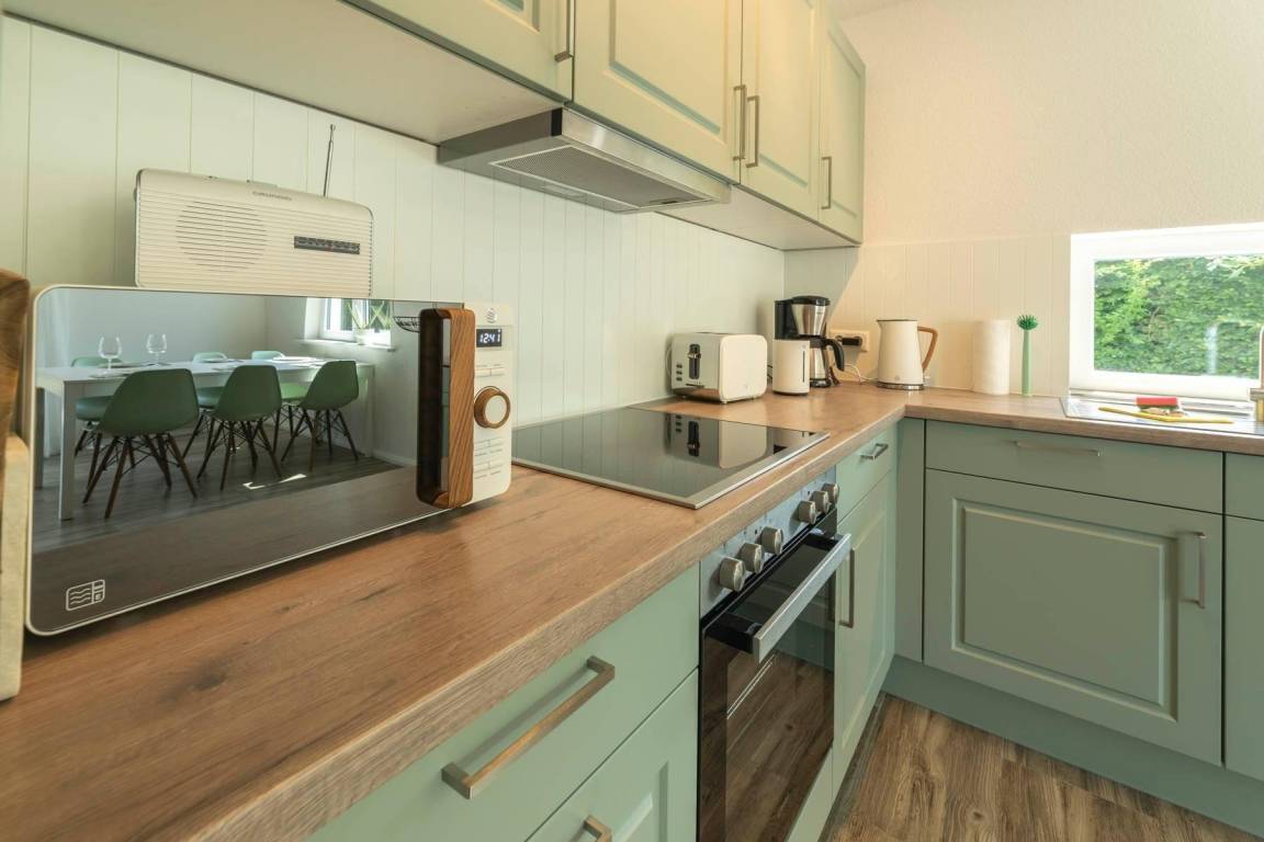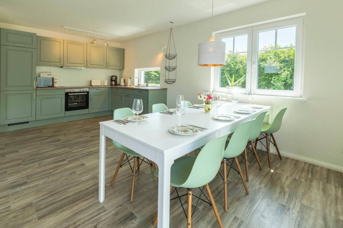 Das Ferienhaus Belvedere 2c in Sehlendorf bietet auf 95 m² Platz für bis zu 6 Gäste (4 Erwachsene + 2 Kinder). Der helle Wohnbereich ist modern eingerichtet und verfügt über eine Sofaecke, die als Schlafoption genutzt werden kann, sowie einen TV. Der Esstisch bietet Platz für bis zu 8 Personen. Die offene Küche ist großzügig ausgestattet mit Ceran-Herd, Backofen, Spülmaschine und Mikrowelle.