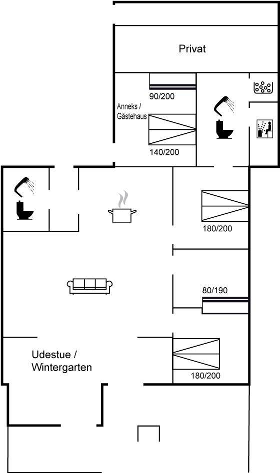 SchlafverhältnisseDie Schlafplätze verteilen sich auf 4 Schlafräume. 6 Schlafplätze in Doppelbetten. 4 Schlafplätze in Etagenbetten. 4 von diesen Schlafplätzen befinden sich im Gästehaus. Ferner steht ein Kinderbett zur Verfügung.
